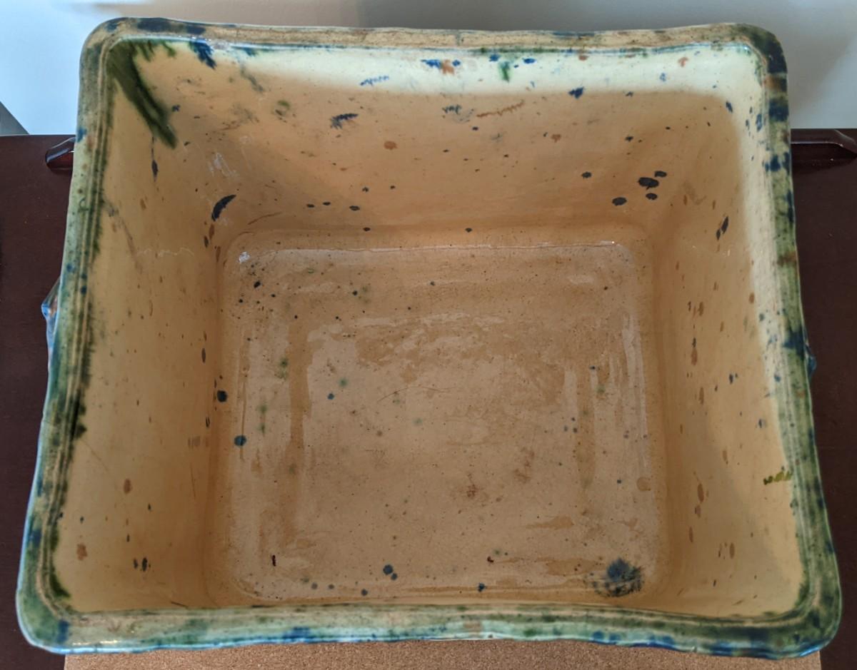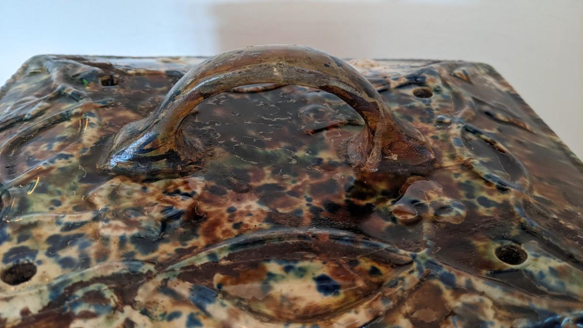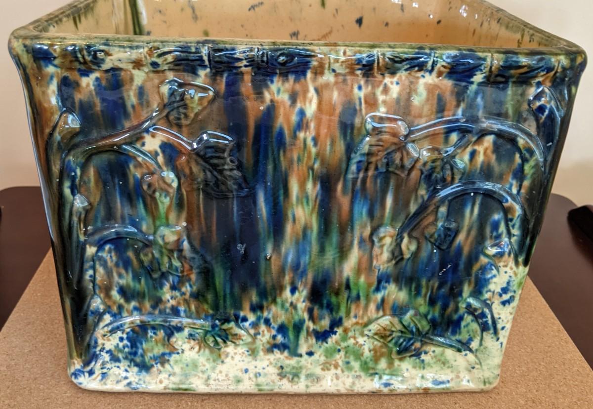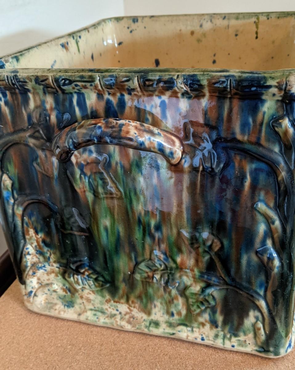 The earthenware piece has handles on either side for lifting and raised designs on all sides of curving stemmed plants and leaves. And scrolled designs on borders and rims.
