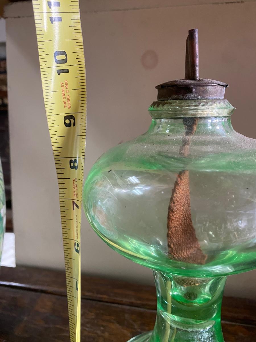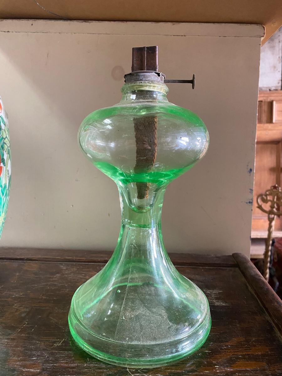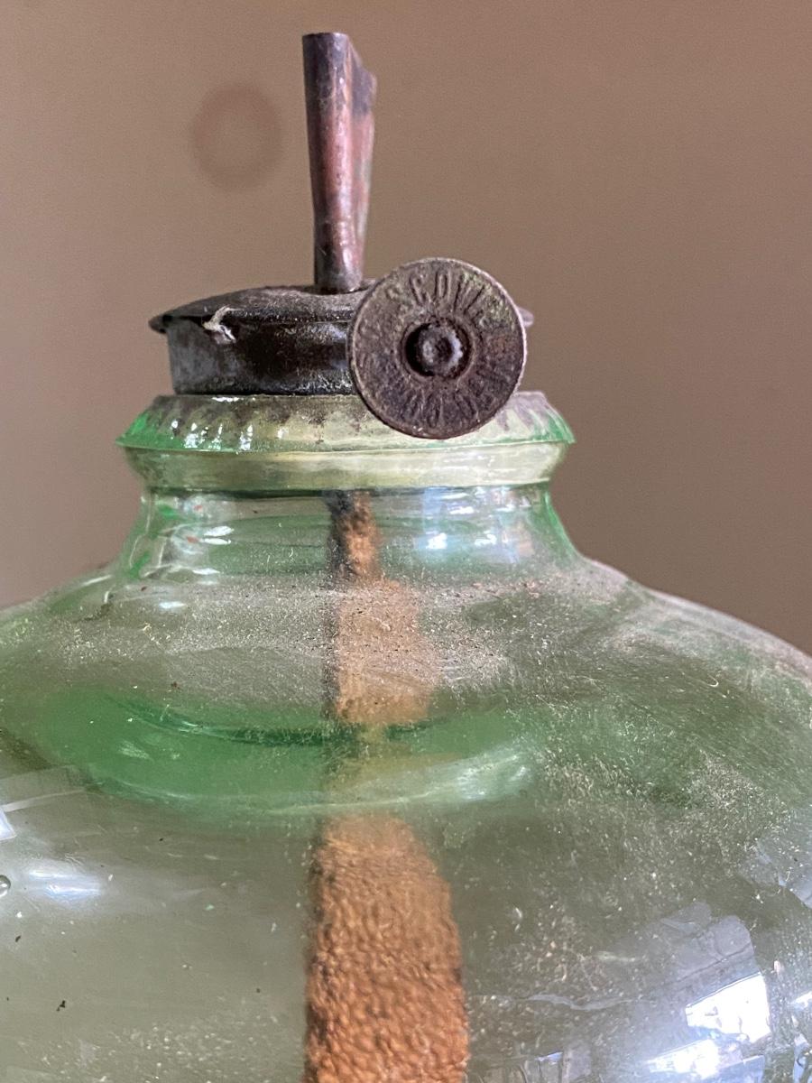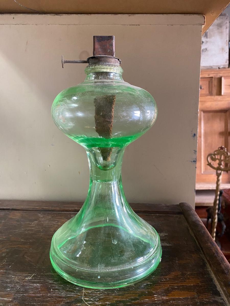 ANTIQUE VASELINE GREEN DEPRESSION GLASS OIL KEROSENE LAMP , measures 11" high. Comes with original wick. Scovill Mrg makers name is stamp on wick turner.