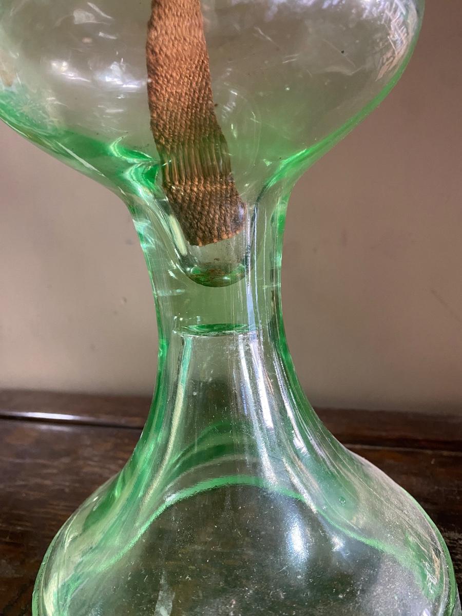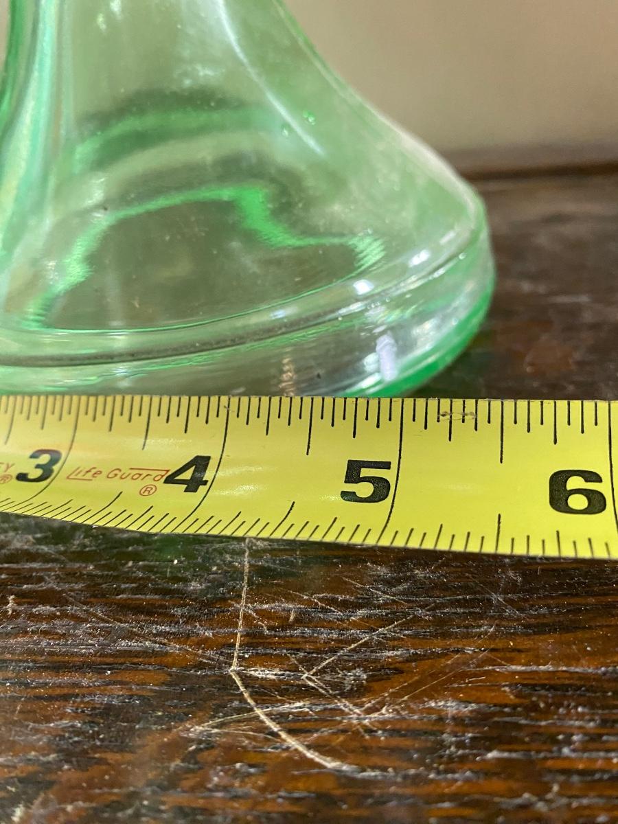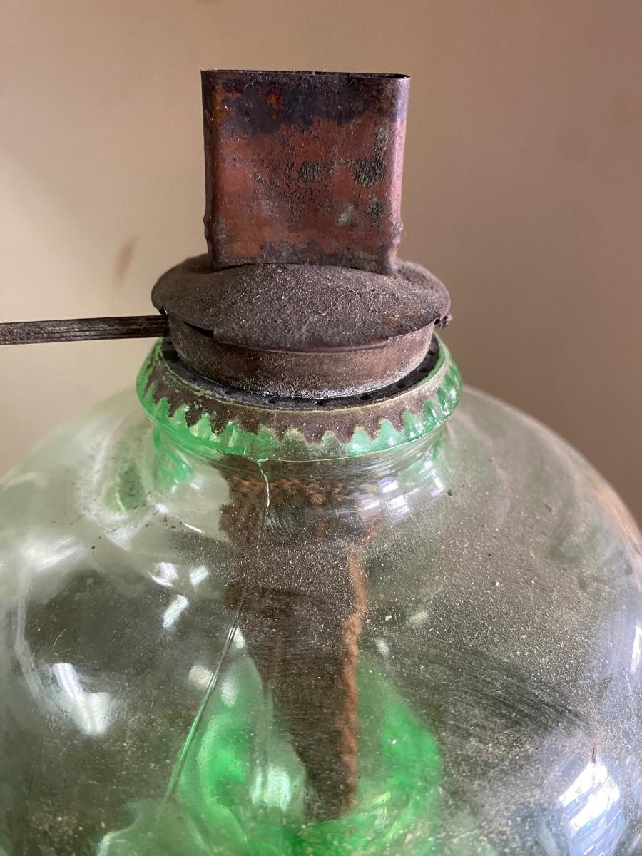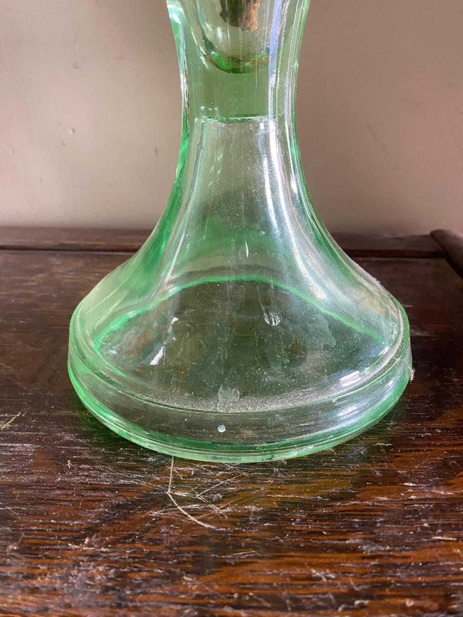ANTIQUE VASELINE GREEN DEPRESSION GLASS OIL KEROSENE LAMP , measures 11" high. Comes with original wick. Scovill Mrg makers name is stamp on wick turner.