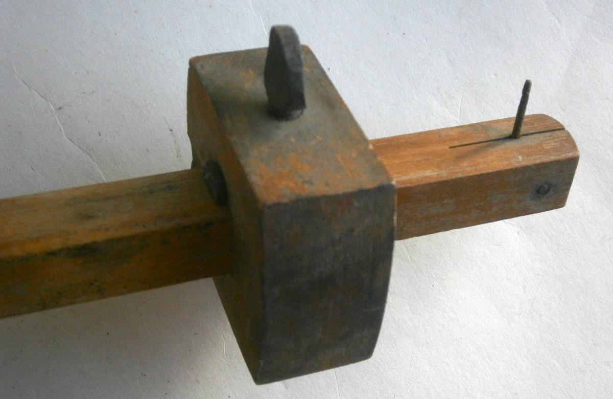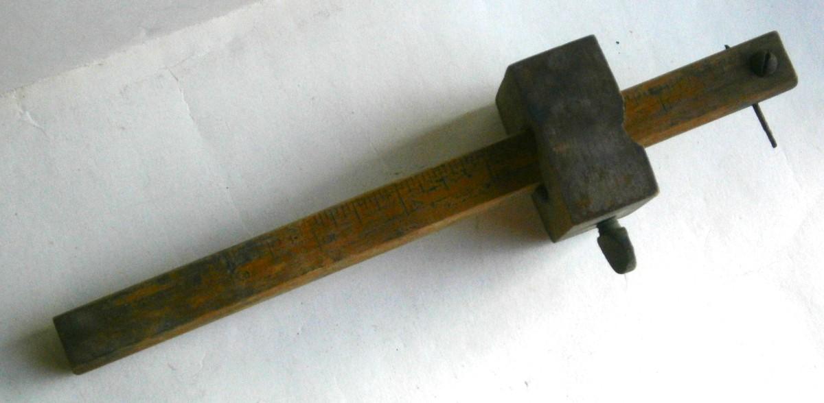 Antique Scribe Wood & Brass Pat Aug. 5th 1873 Carpenter Tool Gauge, 8 1/2 in. long, complete.