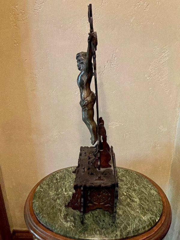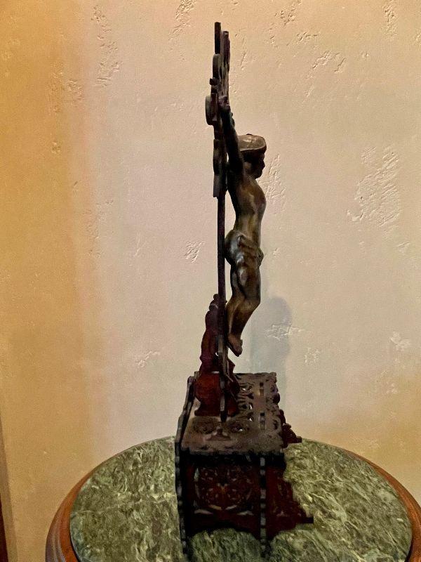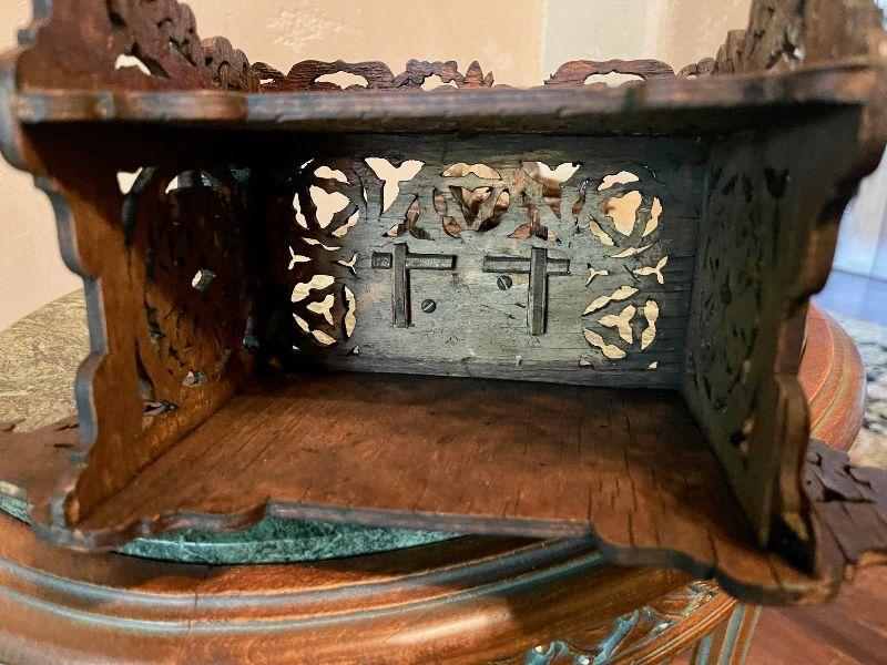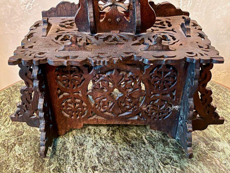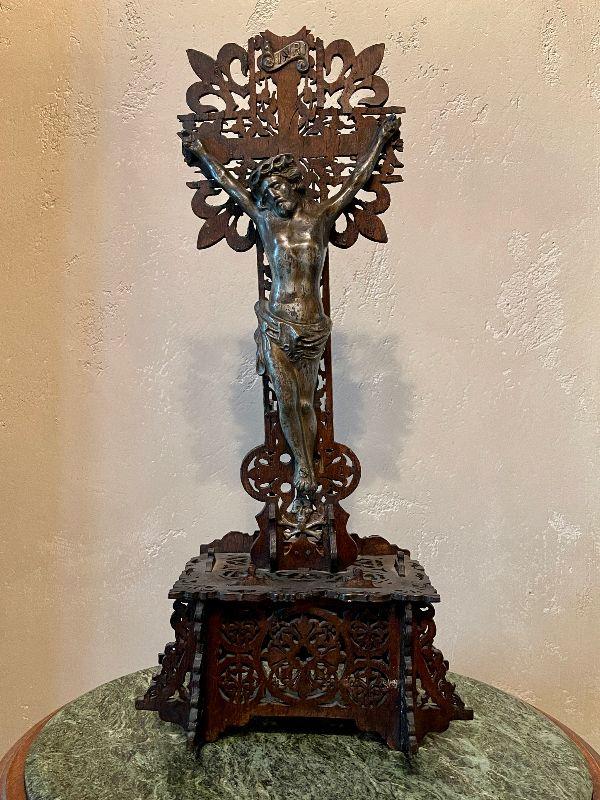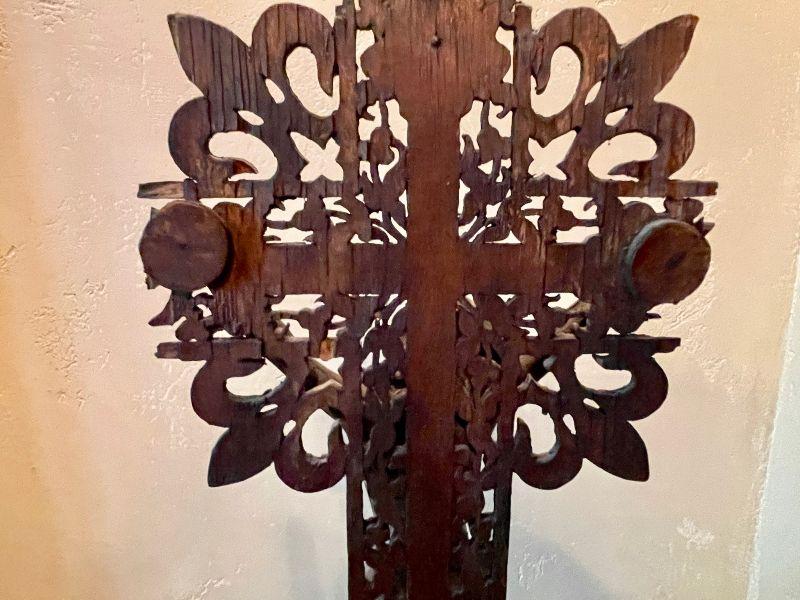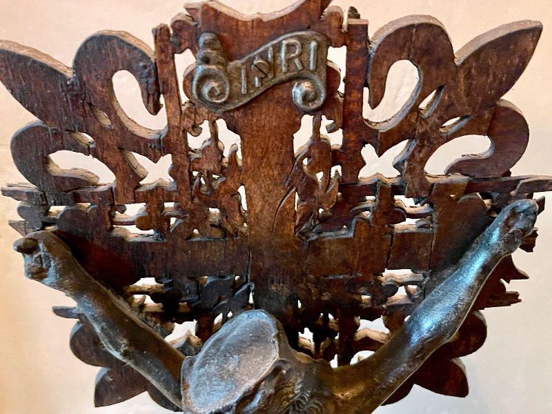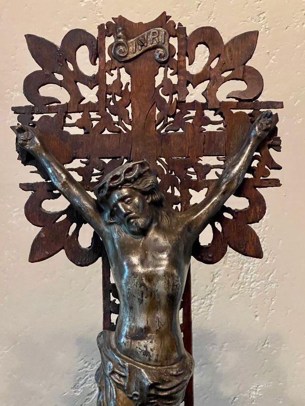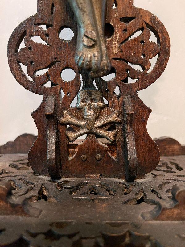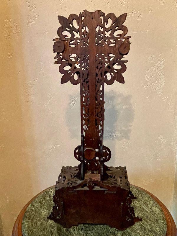 This amazing altar piece is intricately scroll cut and pieced together, panel by panel. The cross has an applied skull and crossbones at the feet of Jesus and the INRI plaque above his head. Rich mahogany stained wood fit together for the base. This is quite impressive. In good condition for its age. Fairly fragile.