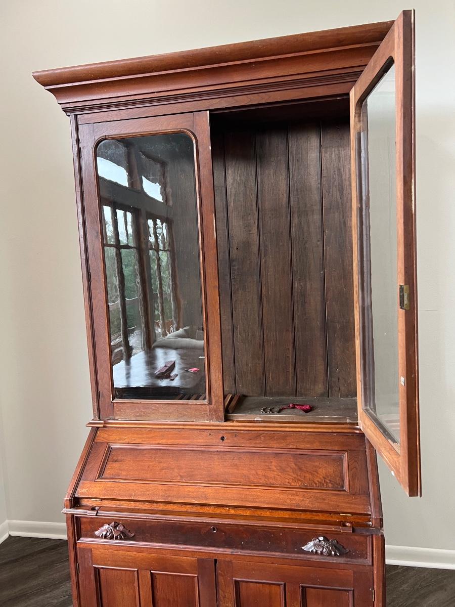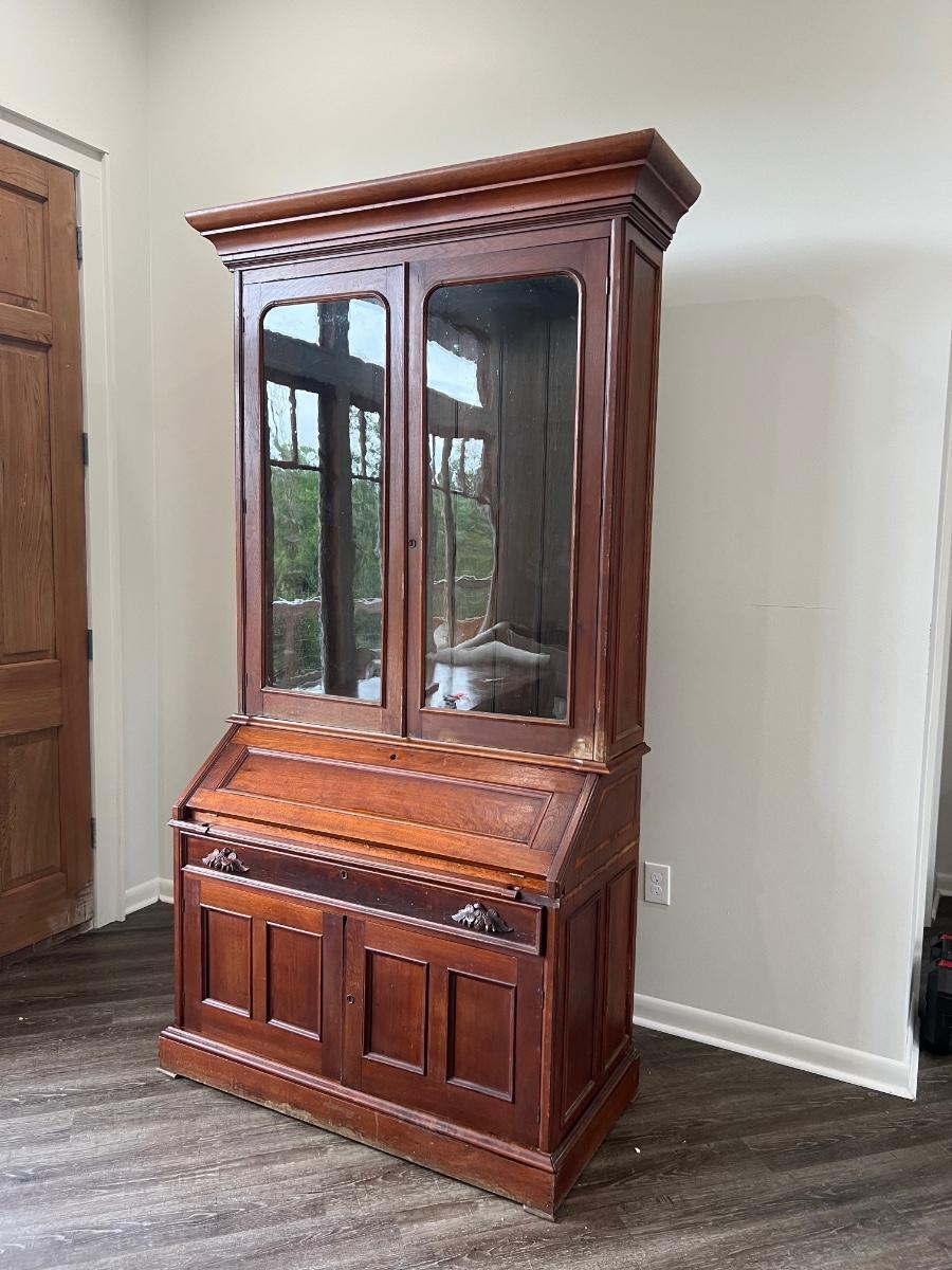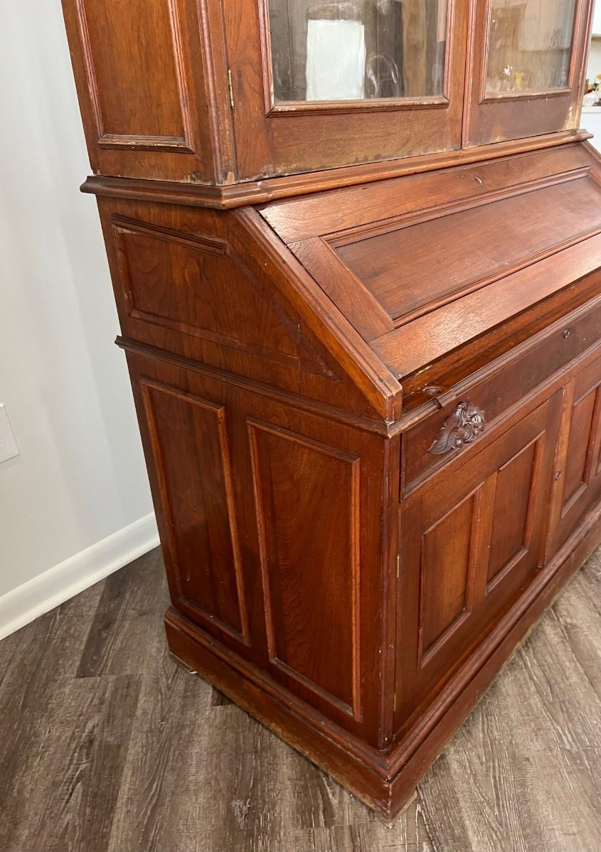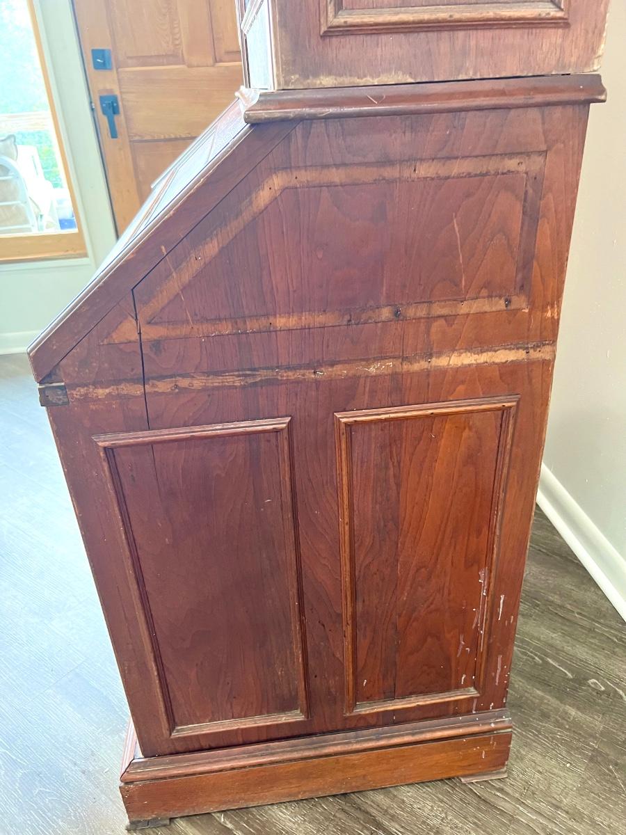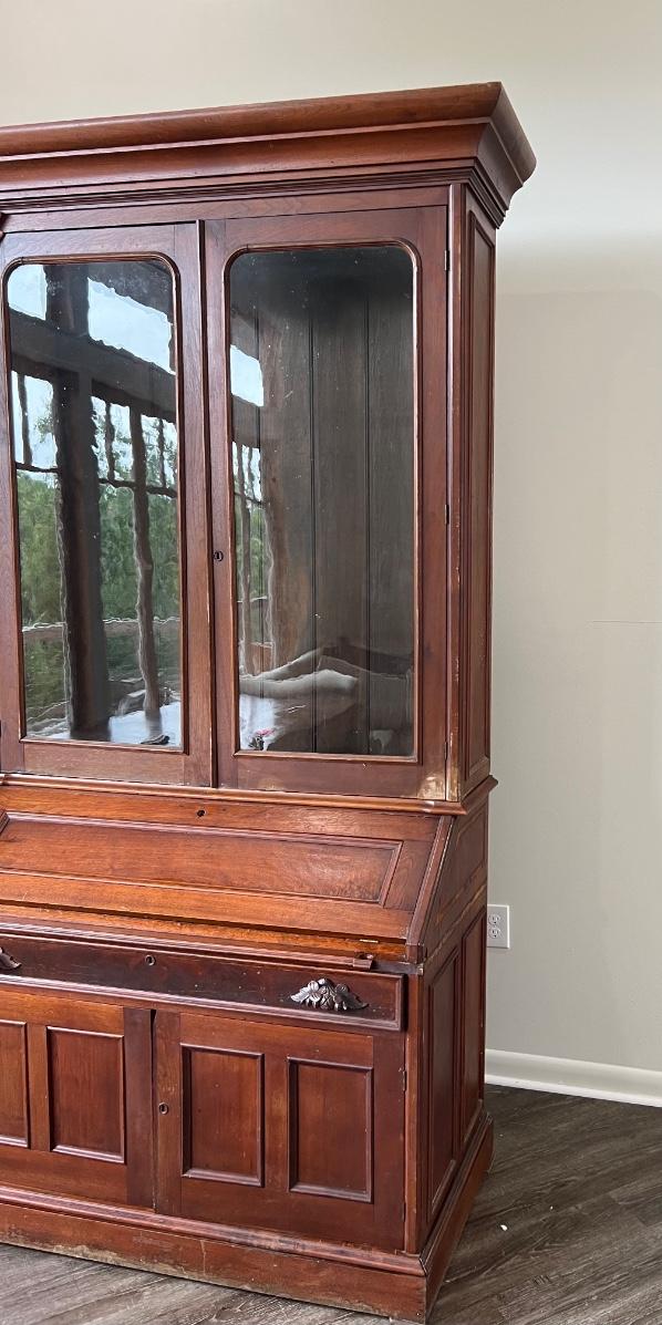 This thing is MASSIVE! You will need at least 2 strong people. This is two pieces. This piece is old, actually has newspaper liner, not glued from 1949. This piece has loose trim, some missing trim and when closed is difficult to open, see pictures as we used cardboard to keep it open. Keys do not work but were with the piece. Included are 8 wooden pieces that fit in the slats to hold shelves. No shelves included. Measures bottom piece only 39 inches tall. top piece only measures 56 inches tall. When complete measures 95 inches tall, 48 inches wide, and 23 inches deep.