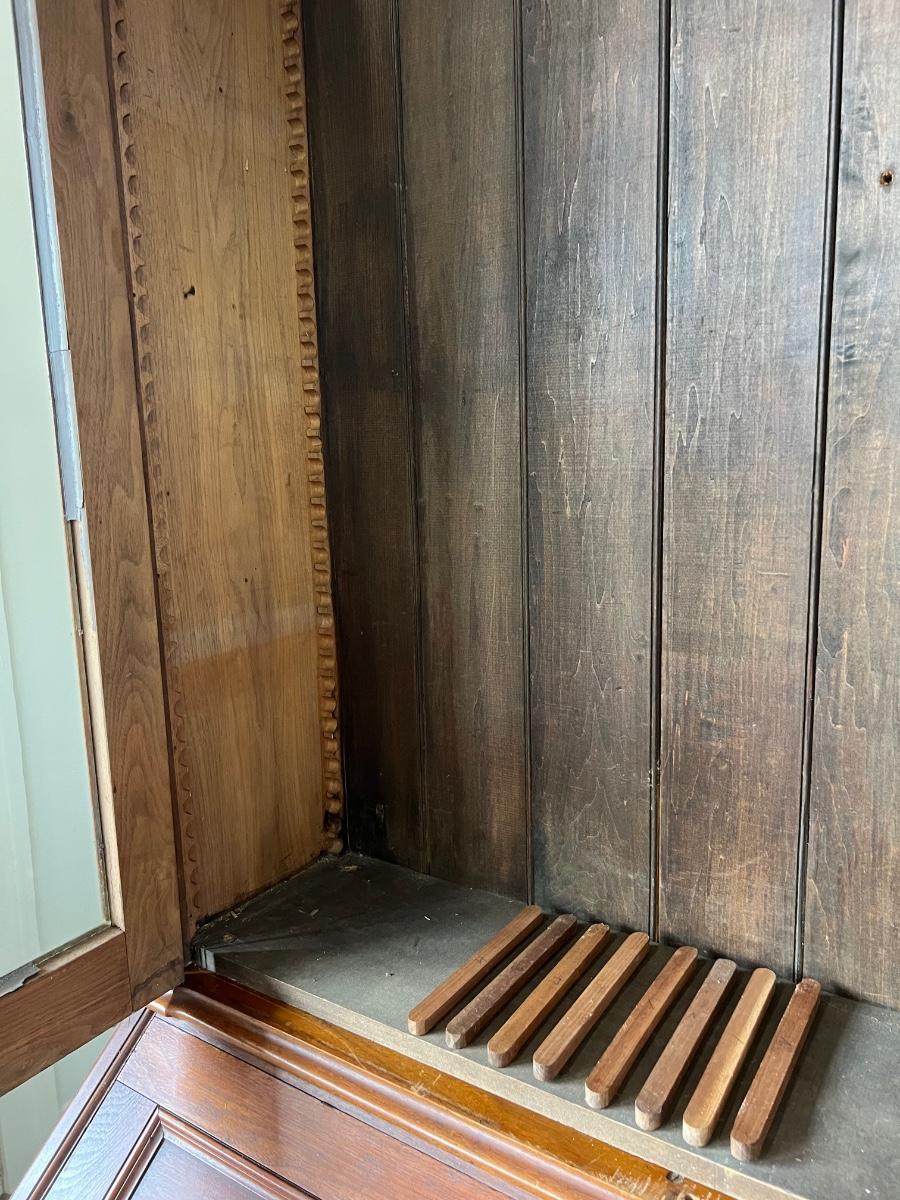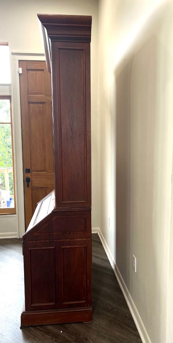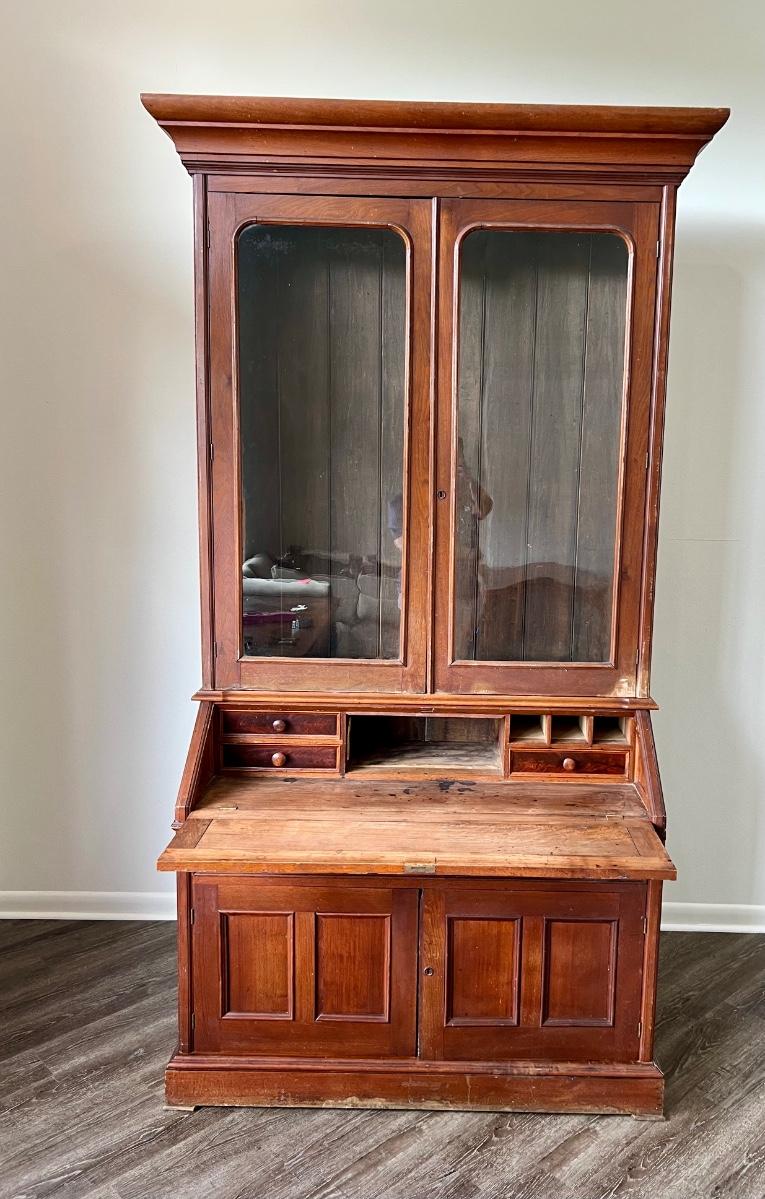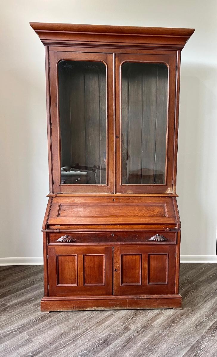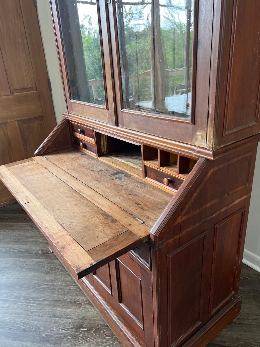 This thing is MASSIVE! You will need at least 2 strong people. This is two pieces. This piece is old, actually has newspaper liner, not glued from 1949. This piece has loose trim, some missing trim and when closed is difficult to open, see pictures as we used cardboard to keep it open. Keys do not work but were with the piece. Included are 8 wooden pieces that fit in the slats to hold shelves. No shelves included. Measures bottom piece only 39 inches tall. top piece only measures 56 inches tall. When complete measures 95 inches tall, 48 inches wide, and 23 inches deep.