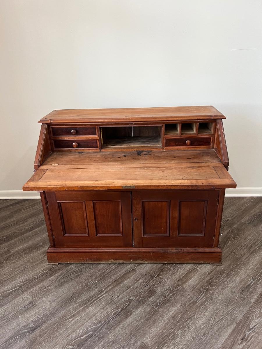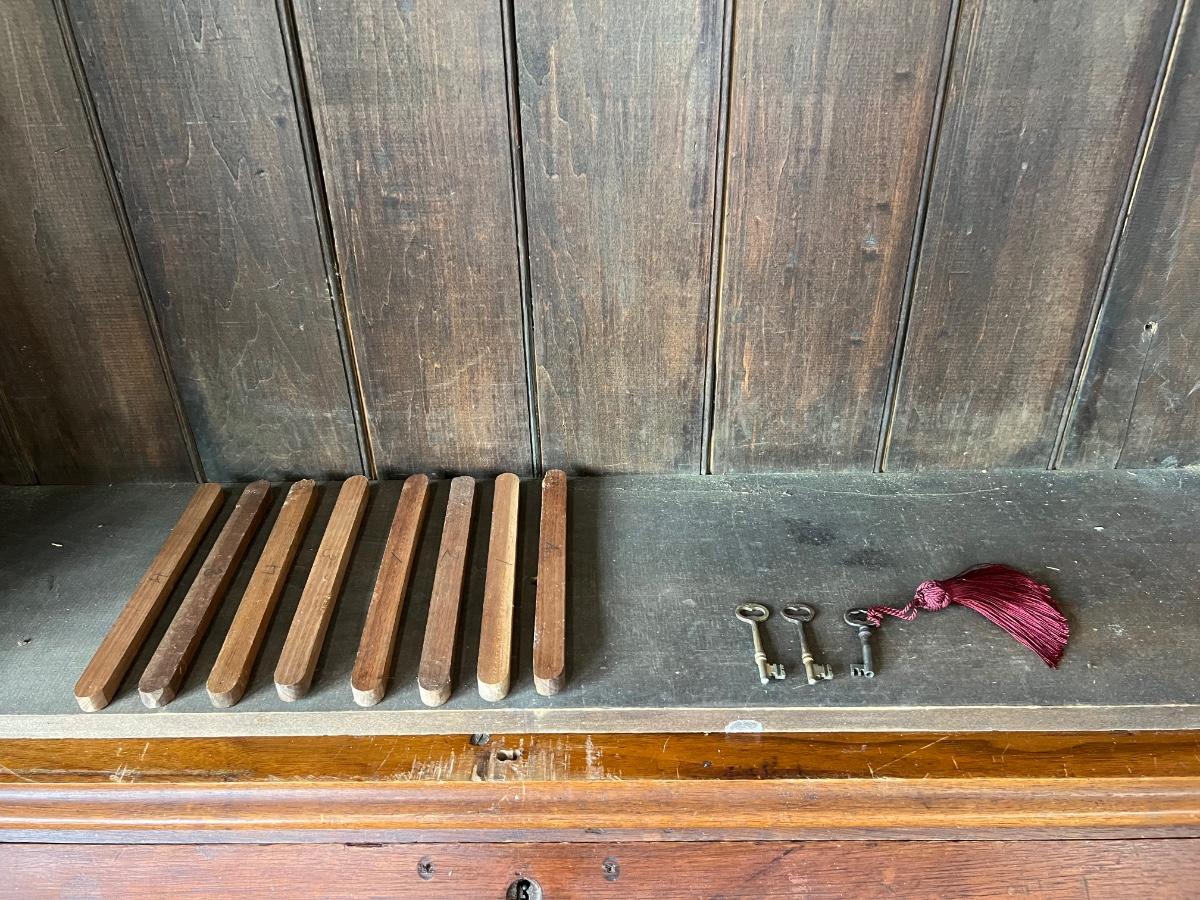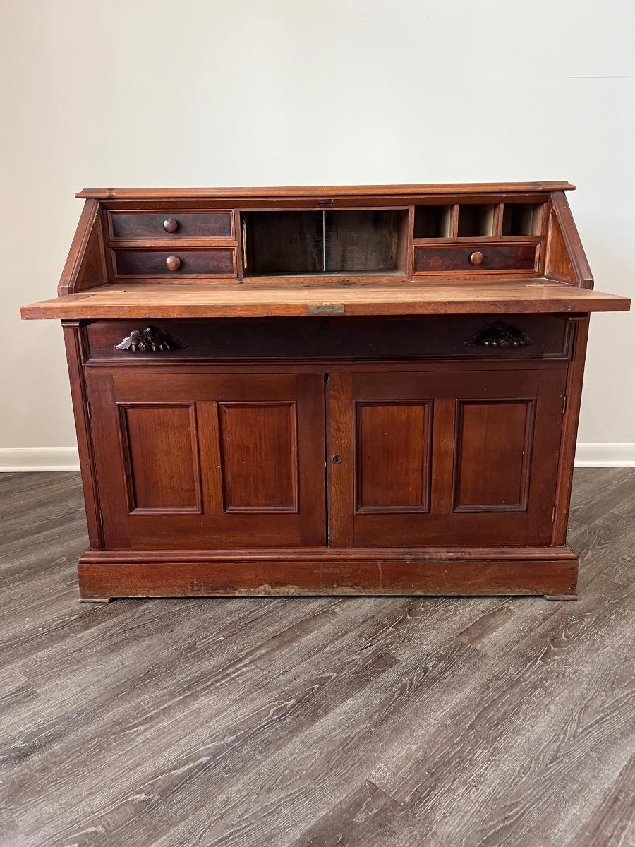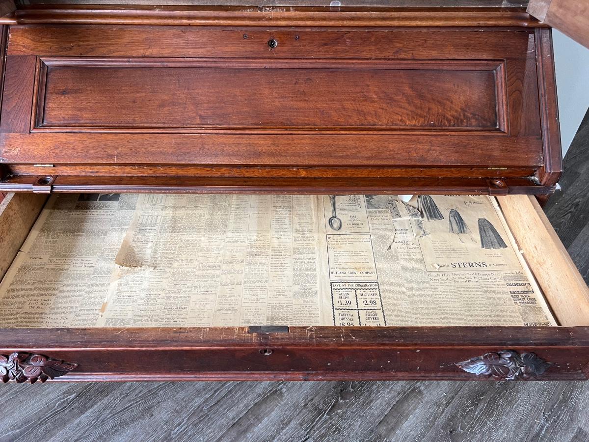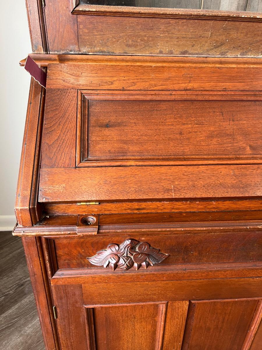 This thing is MASSIVE! You will need at least 2 strong people. This is two pieces. This piece is old, actually has newspaper liner, not glued from 1949. This piece has loose trim, some missing trim and when closed is difficult to open, see pictures as we used cardboard to keep it open. Keys do not work but were with the piece. Included are 8 wooden pieces that fit in the slats to hold shelves. No shelves included. Measures bottom piece only 39 inches tall. top piece only measures 56 inches tall. When complete measures 95 inches tall, 48 inches wide, and 23 inches deep.