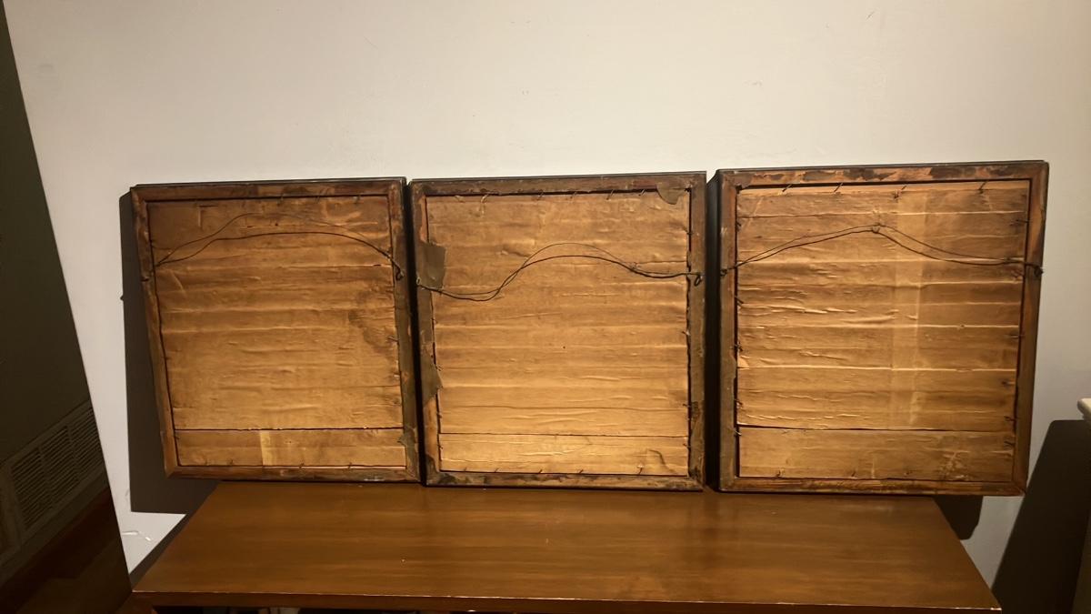 - Identical antique dark wood frames, each measuring 14.25" wide x 15.75" tall (perfect for a trio display over a mantel or in a study).