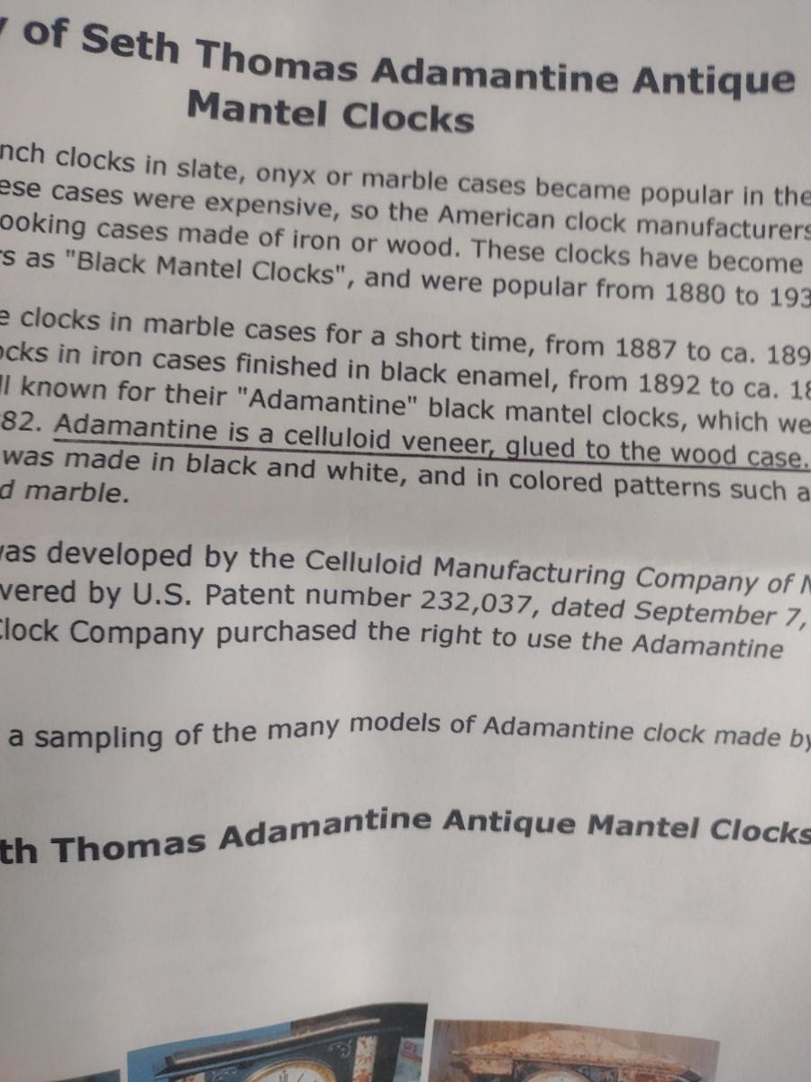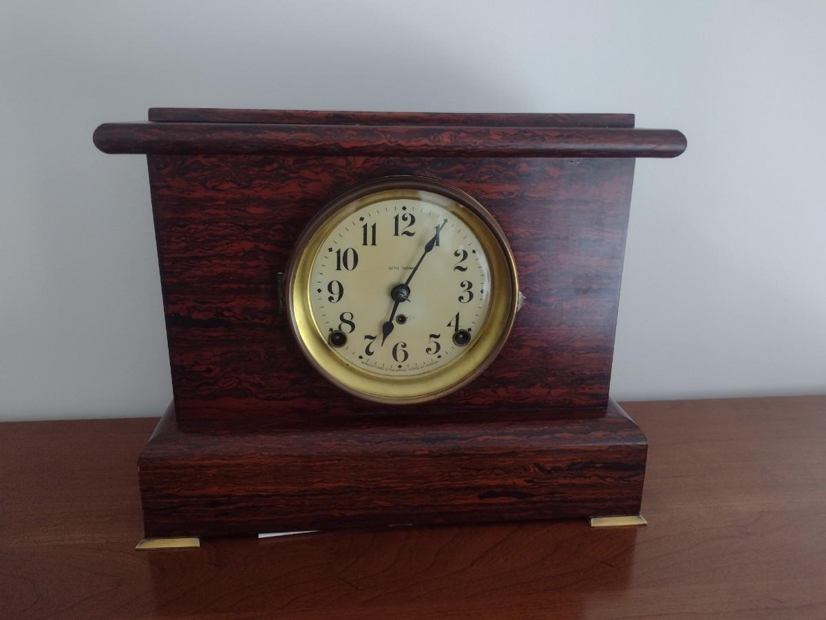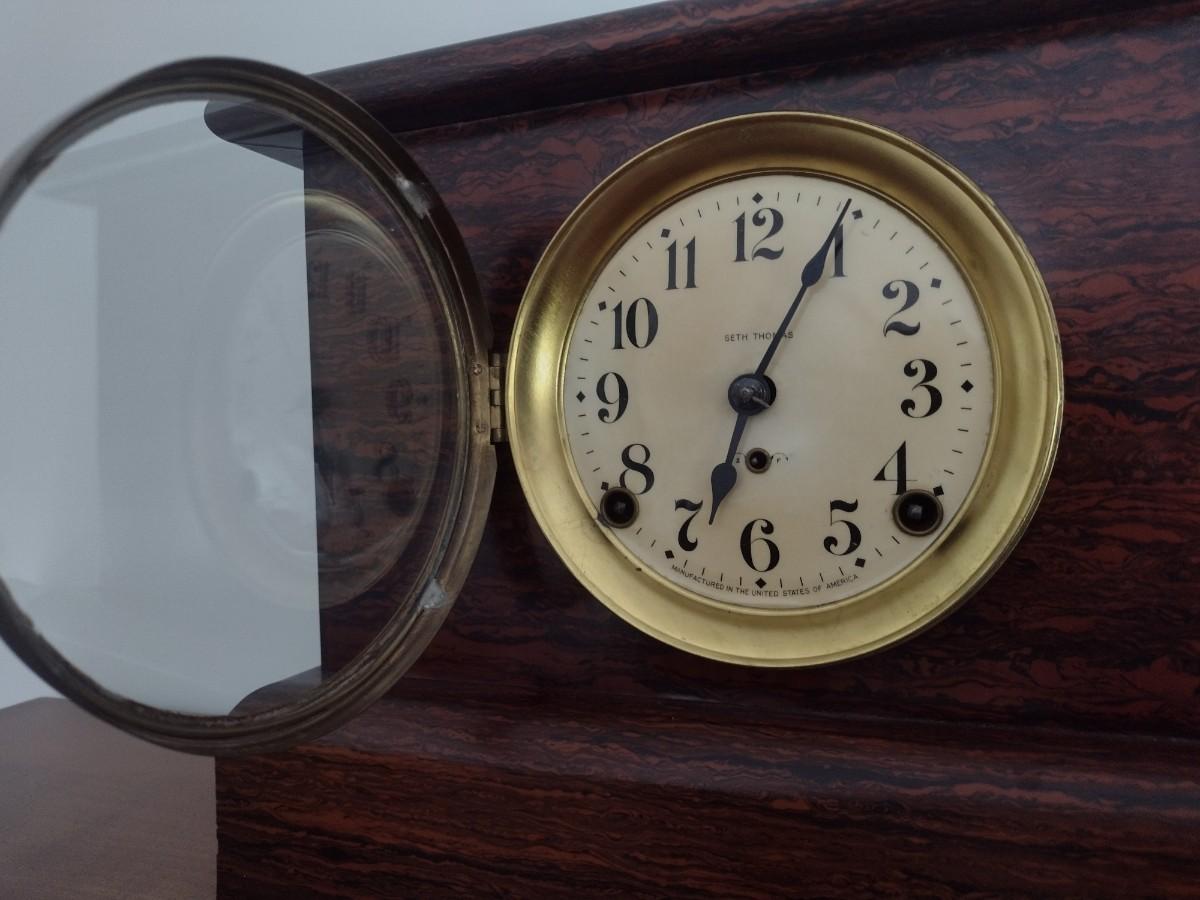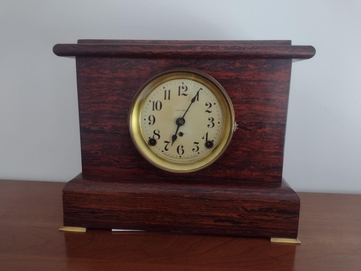Antique Seth Thomas Adamantine Wood Case Mantle Clock Chime Key-Wind. Unknown working condition.