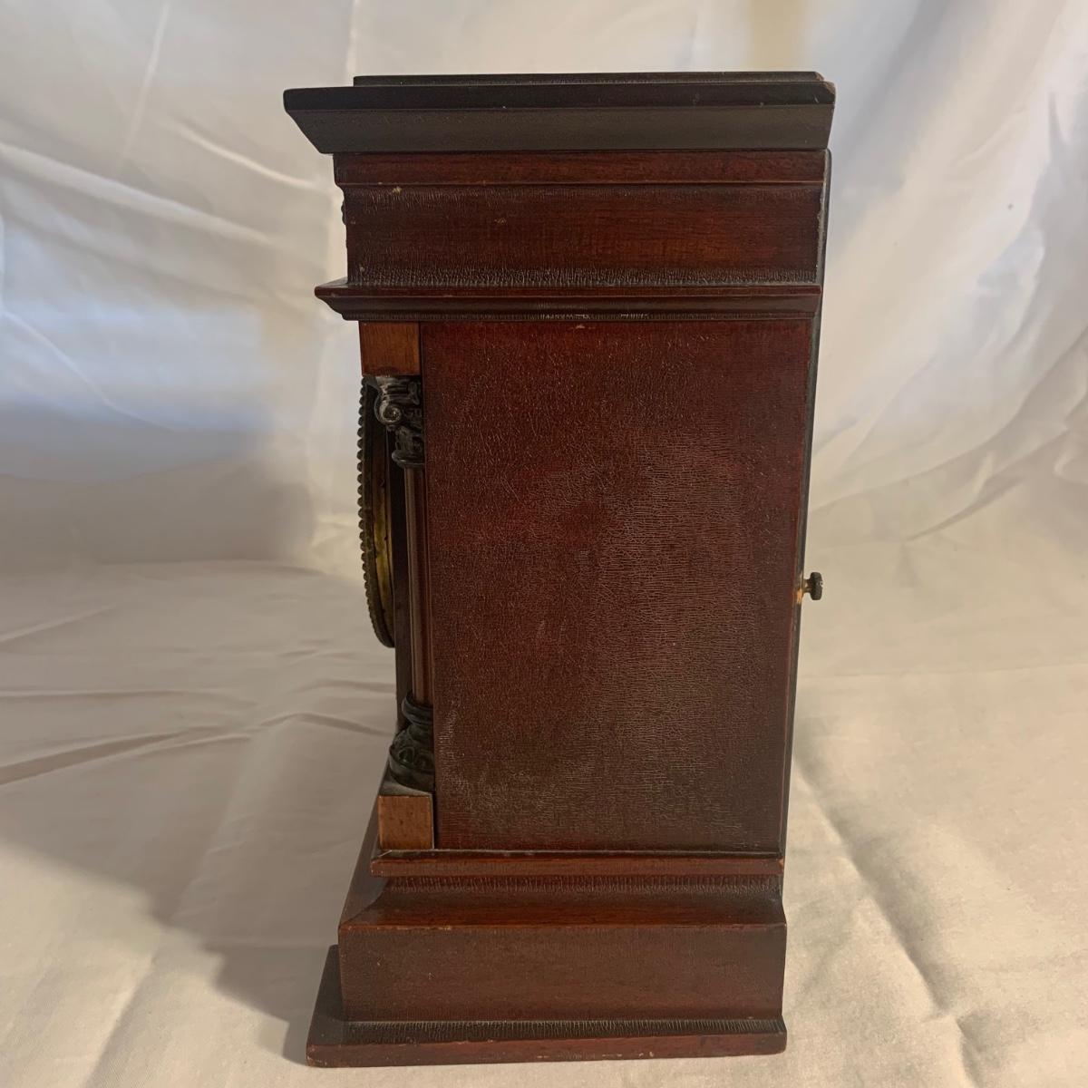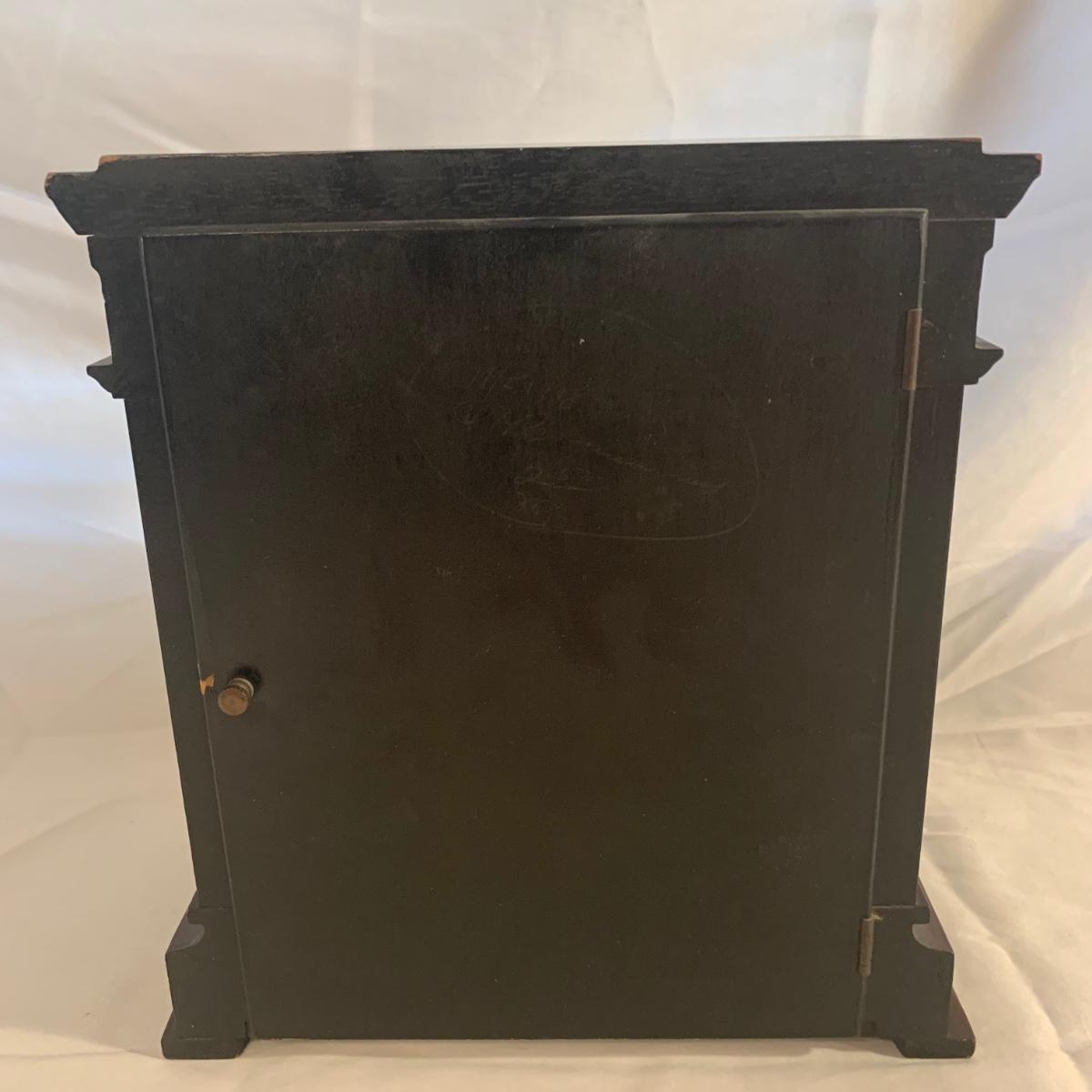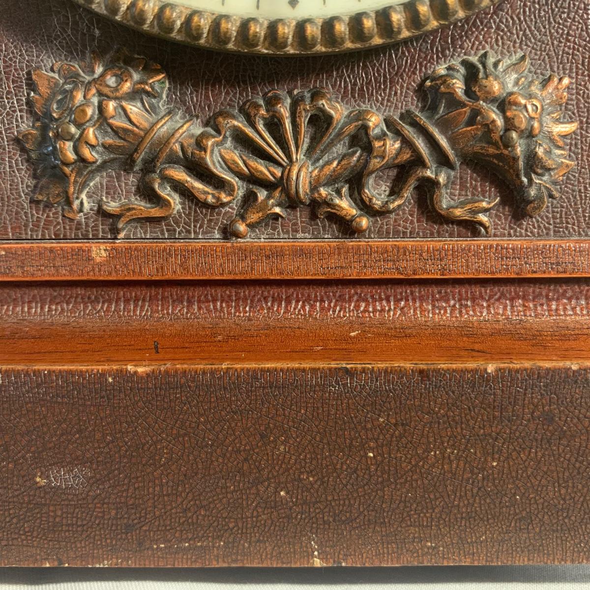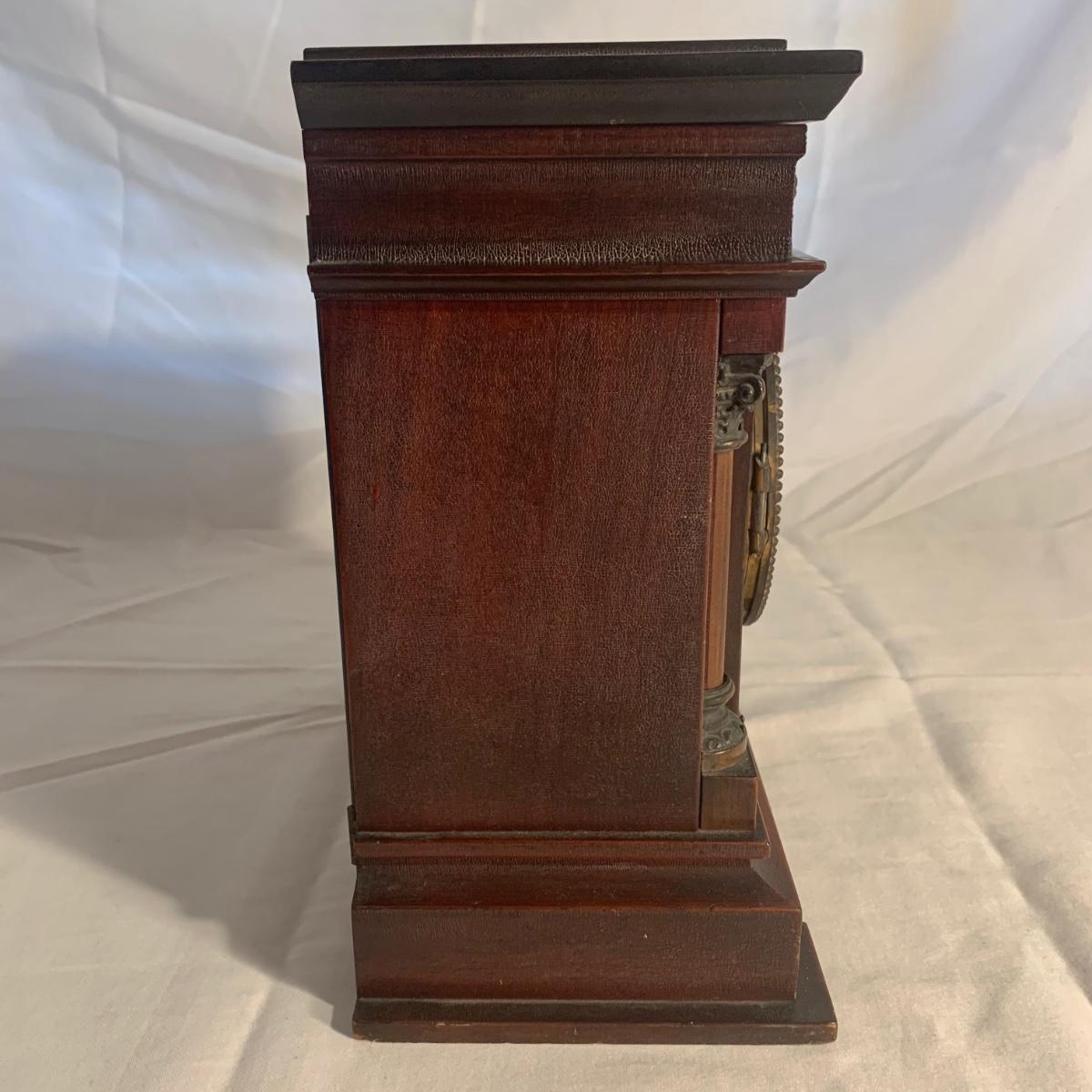 Lovely 1900’s Seth Thomas brand wooden clock with original purchase card from 1939. Face cover is glass and the clock face is porcelain. This clock does have some blemishes and scratches, however it winds up and chimes beautifully. It appears to be in good condition and would add charm and character to any mantle. This item measures 10”L x 5.5”W x 10.5”H.