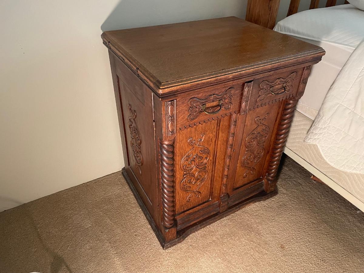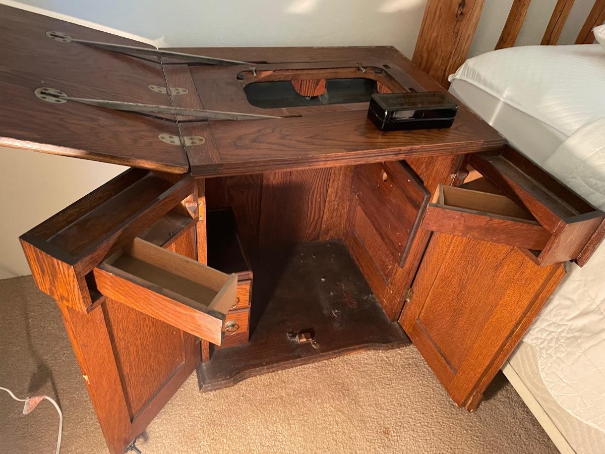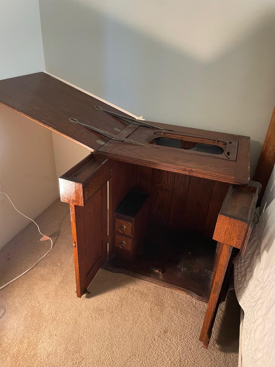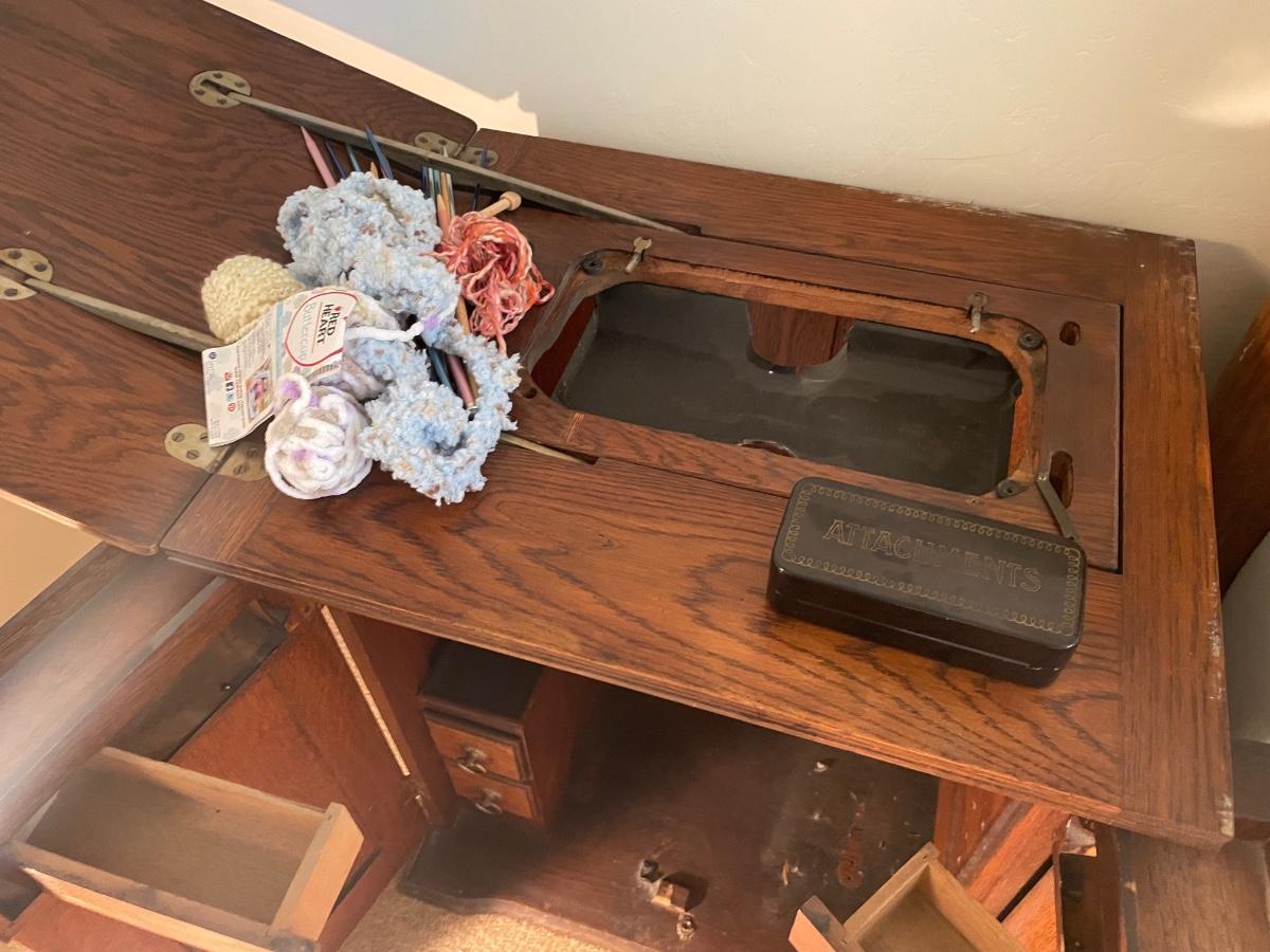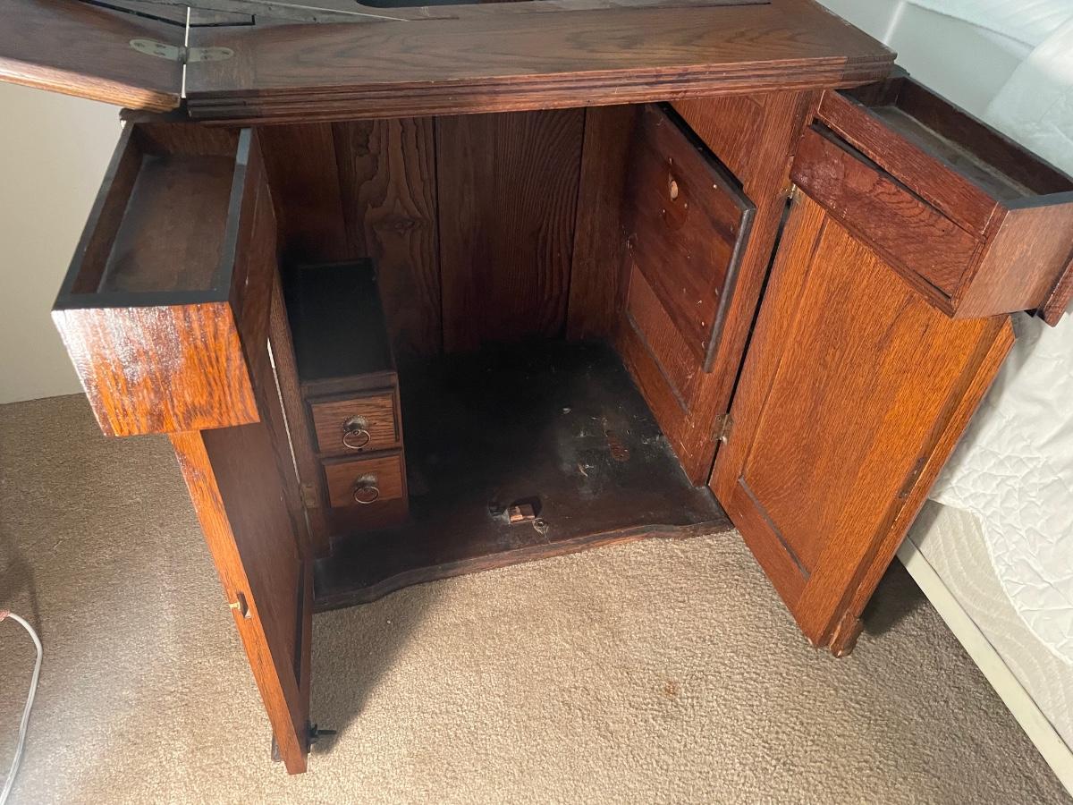 Antique sewing cabinet without sewing machine. Includes two small drawers on the interior. In good to great condition for its age. Truly a gorgeous antique piece to add to any home. Includes sewing/crochet items as well