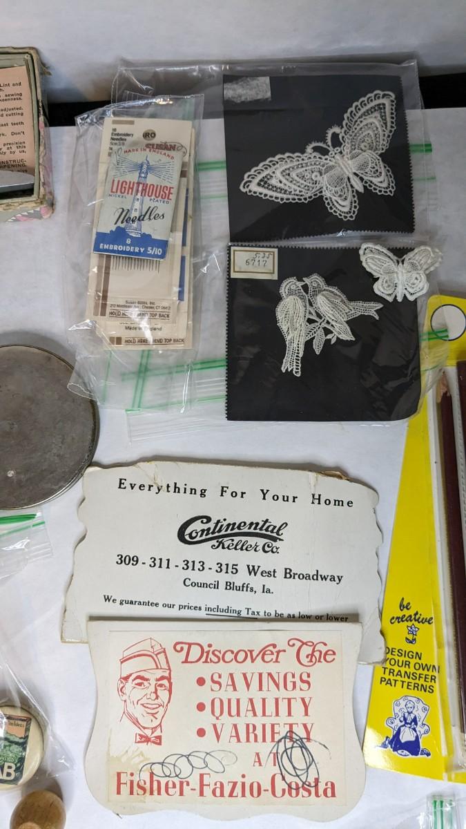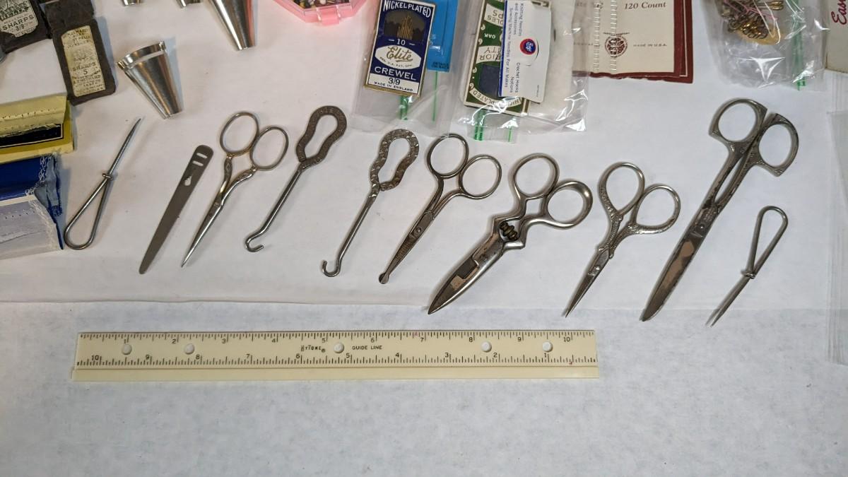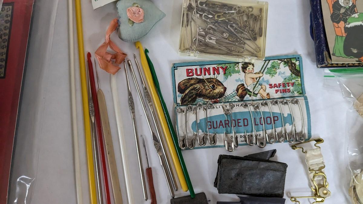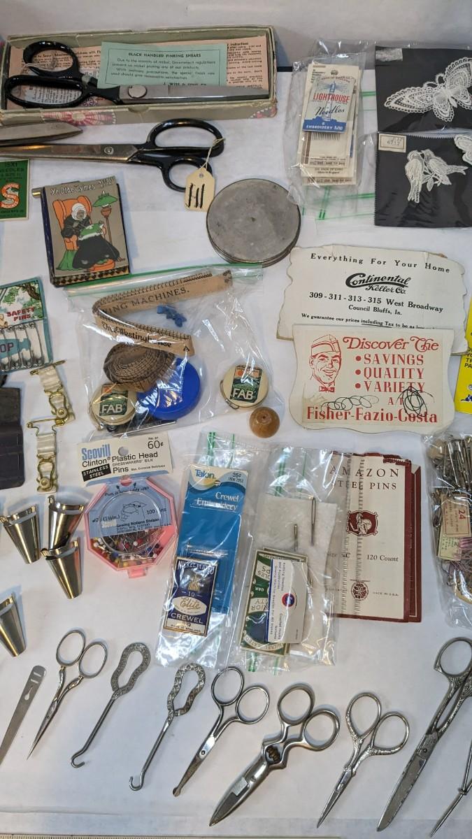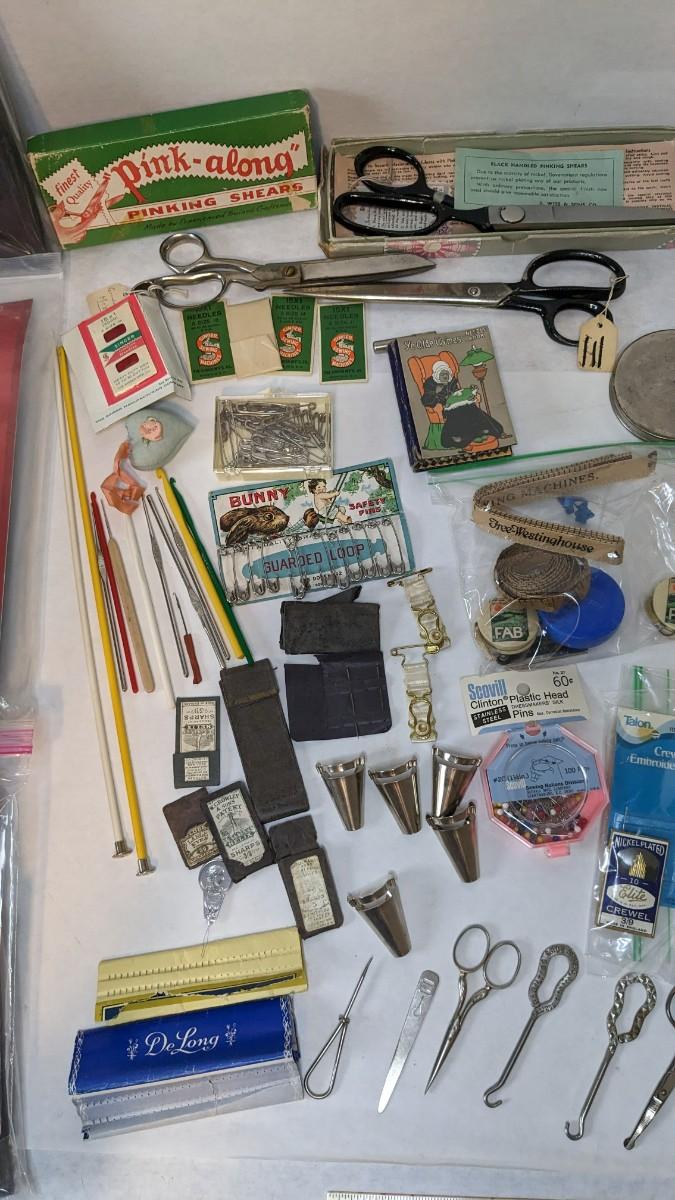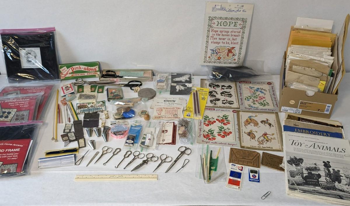 This is one of the most painstakingly well kept sewing collections and assortment we've ever encountered. This lot features pre-1900 pieces all the way through the 1970s. You'll find needles, shears, scissors, and iron on transfers. Quilt, embroidery, crewel, and needlepoint patterns with the earliest dated 1912. Glass mosaic frames, carpet braiders, new in package items, and so much more! This assortment is a wonderful reminder of how we used to be our own department store. It has a phenomenal amount of character, history, and useful potential.