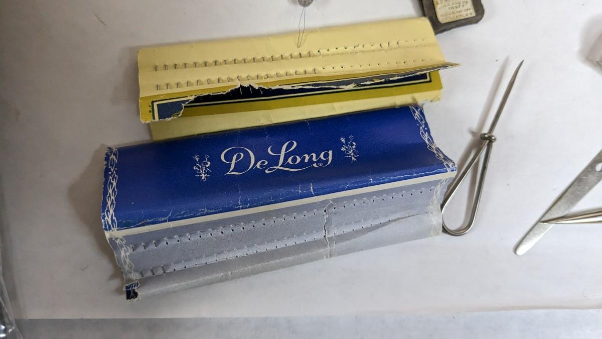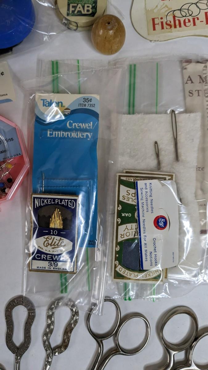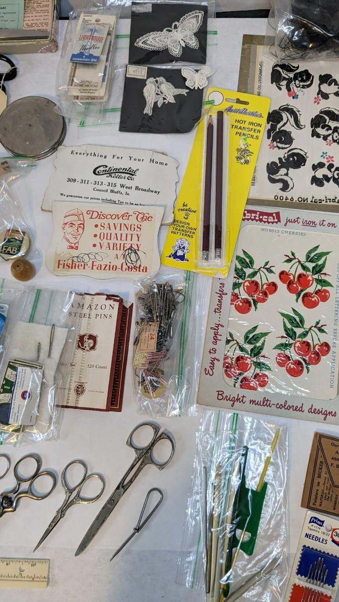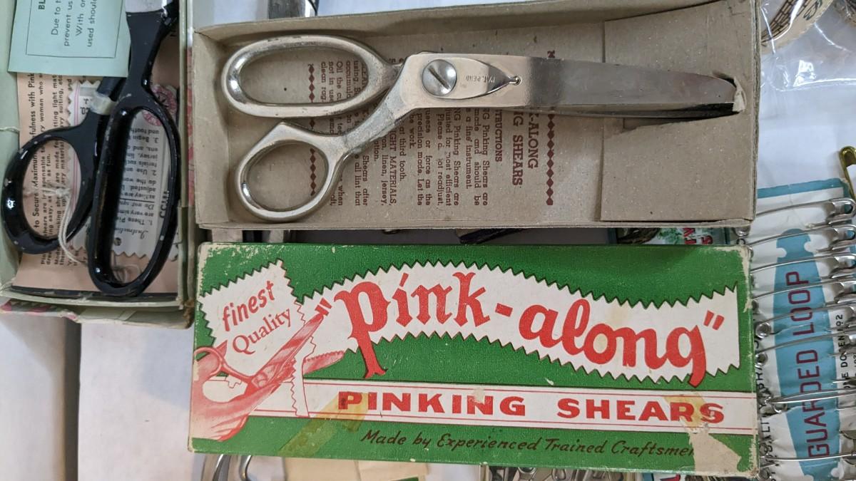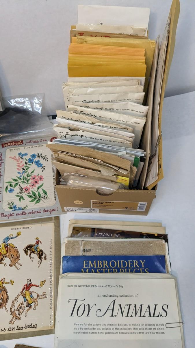 This is one of the most painstakingly well kept sewing collections and assortment we've ever encountered. This lot features pre-1900 pieces all the way through the 1970s. You'll find needles, shears, scissors, and iron on transfers. Quilt, embroidery, crewel, and needlepoint patterns with the earliest dated 1912. Glass mosaic frames, carpet braiders, new in package items, and so much more! This assortment is a wonderful reminder of how we used to be our own department store. It has a phenomenal amount of character, history, and useful potential.