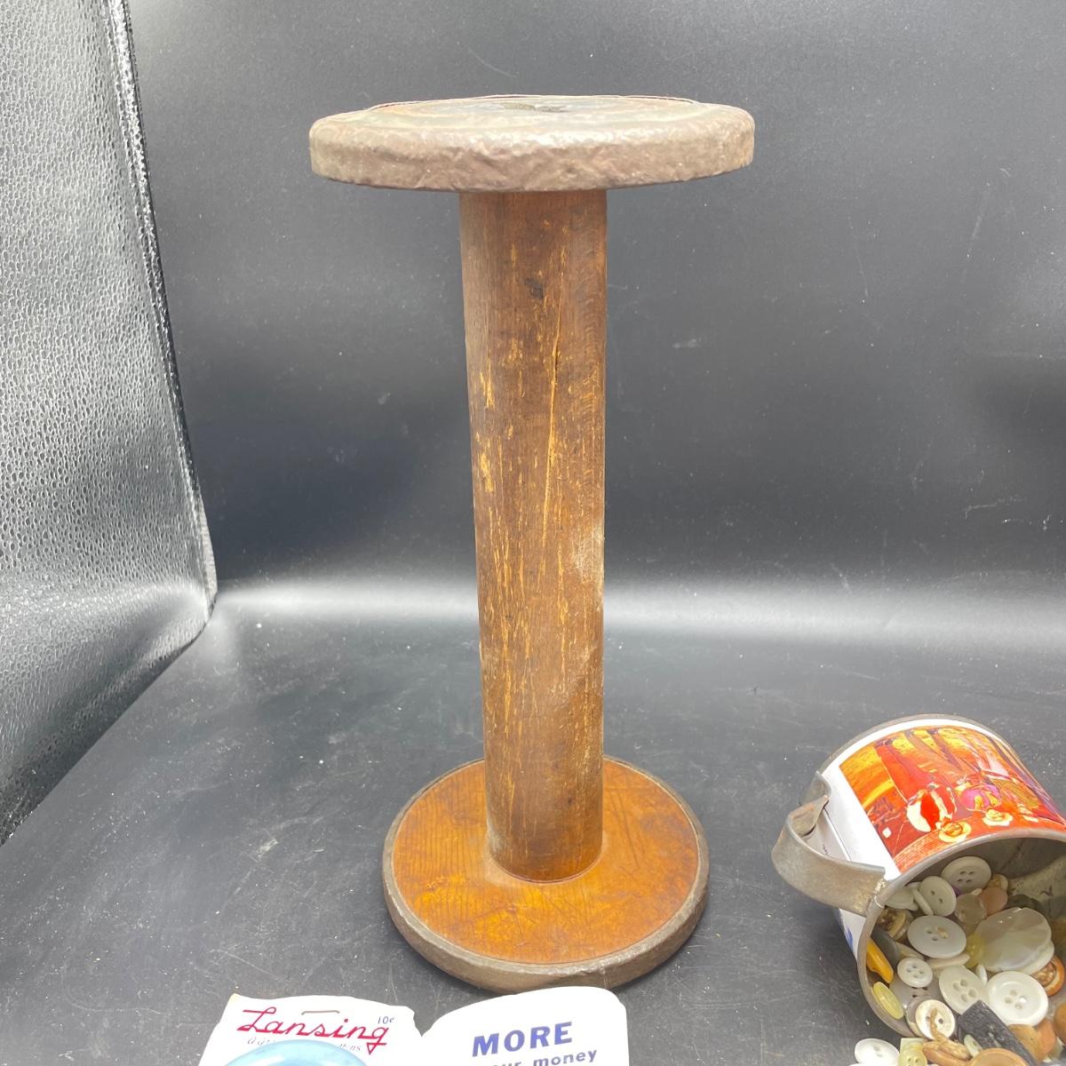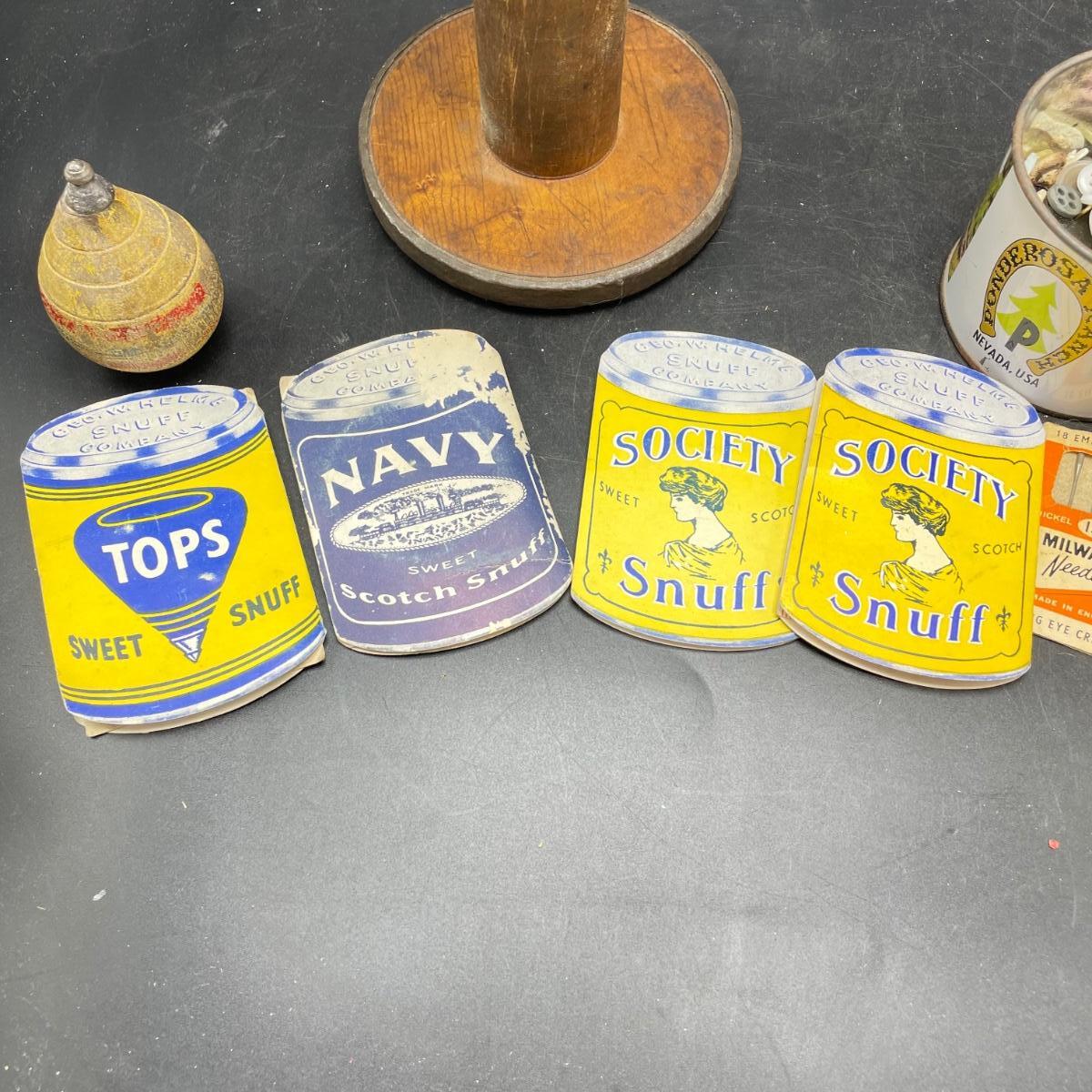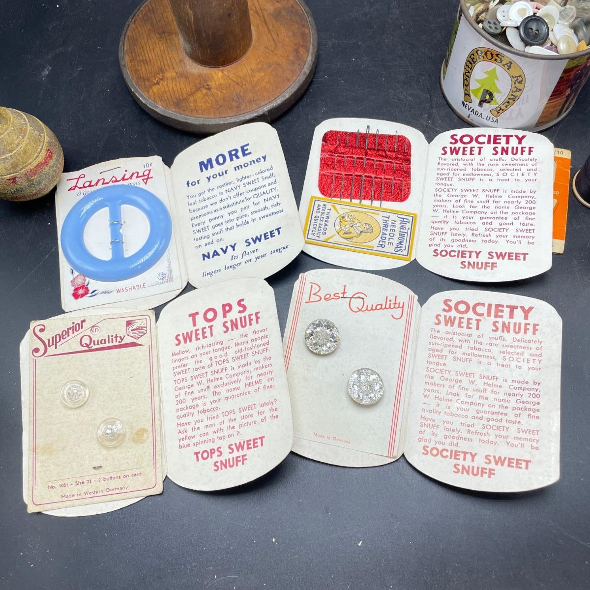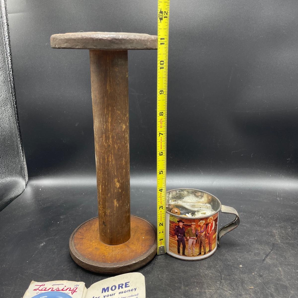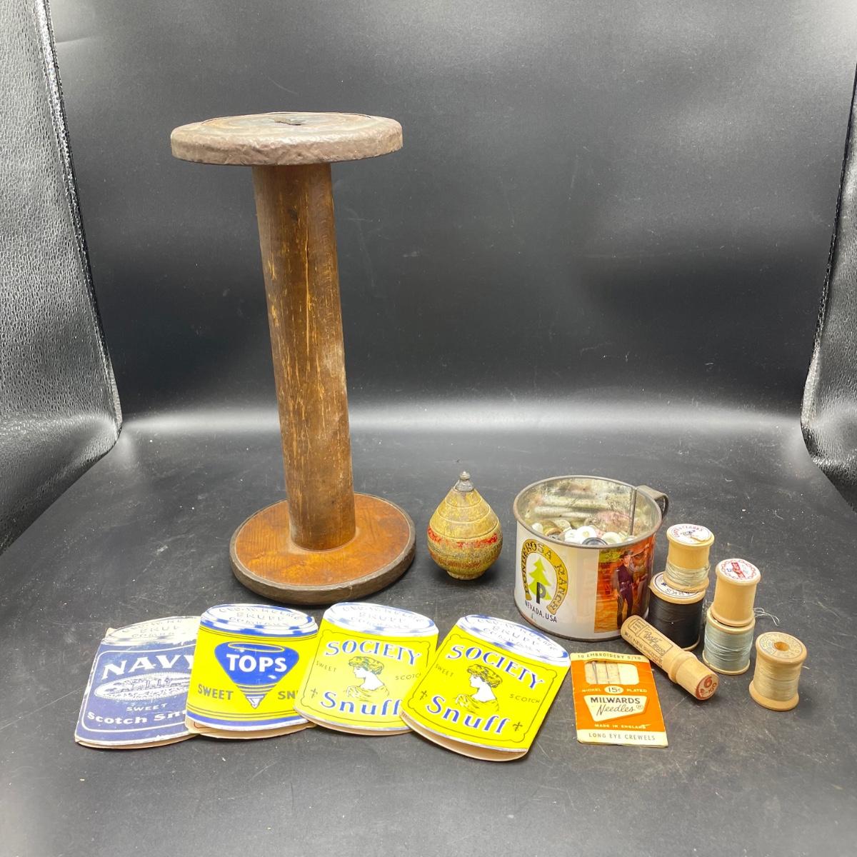 Antique industrial wooden and metal 11” bobbin with vintage thread, buttons and needles including four snuff advertisements with samples inside. Completing the Tops Sweet Snuff ad is a wooden top. The tin mug featuring Ponderosa Ranch is included as well. See images. Shipping available.
