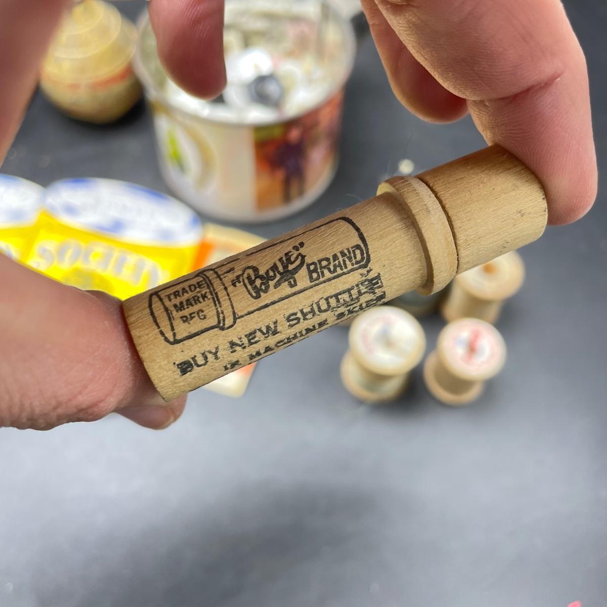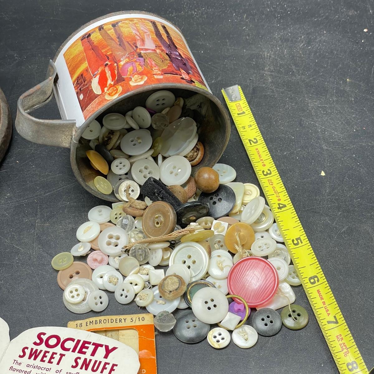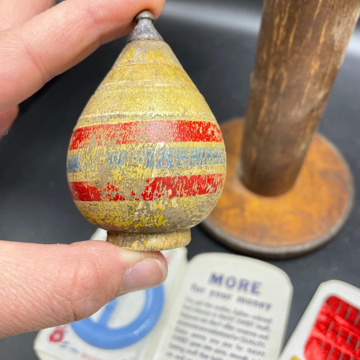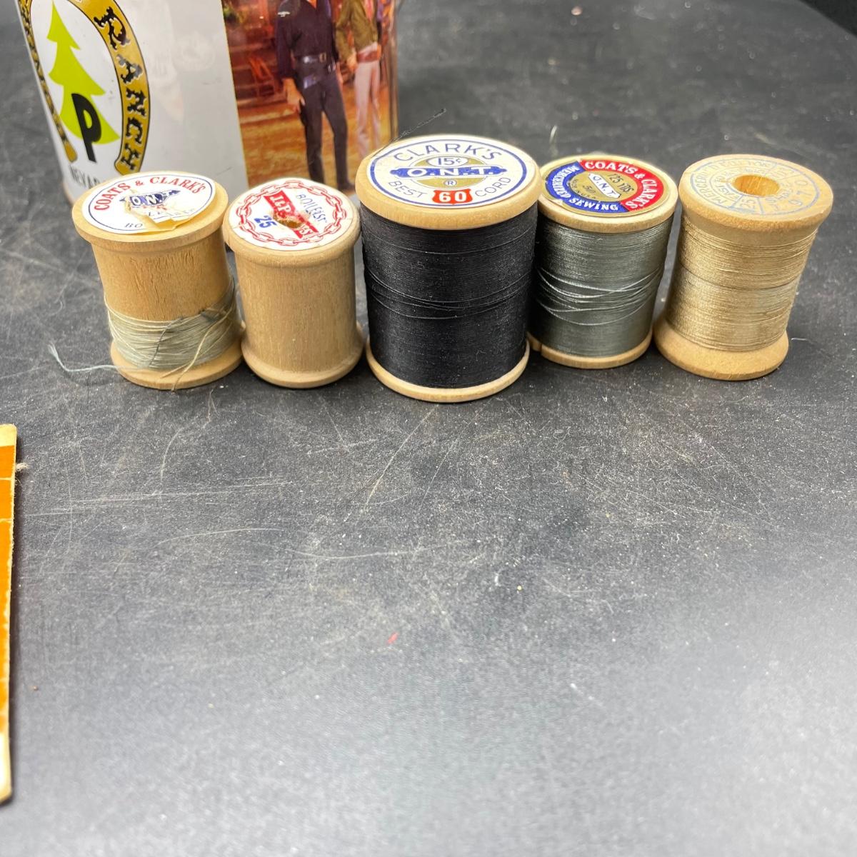Antique industrial wooden and metal 11” bobbin with vintage thread, buttons and needles including four snuff advertisements with samples inside. Completing the Tops Sweet Snuff ad is a wooden top. The tin mug featuring Ponderosa Ranch is included as well. See images. Shipping available.