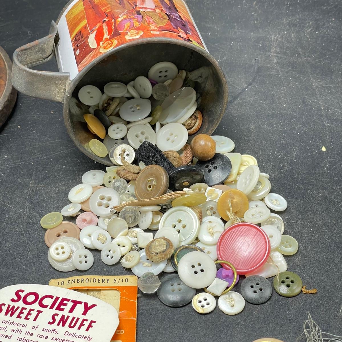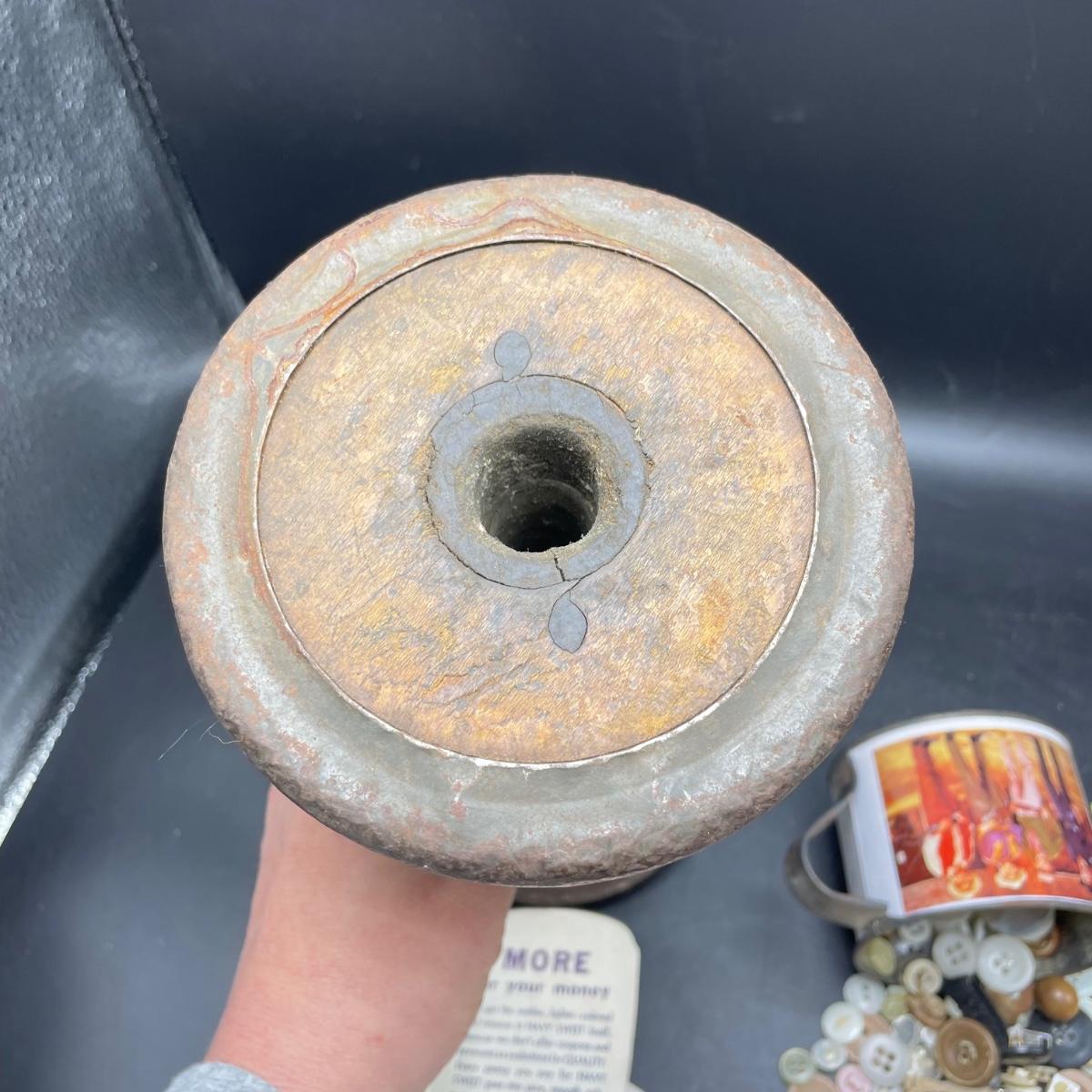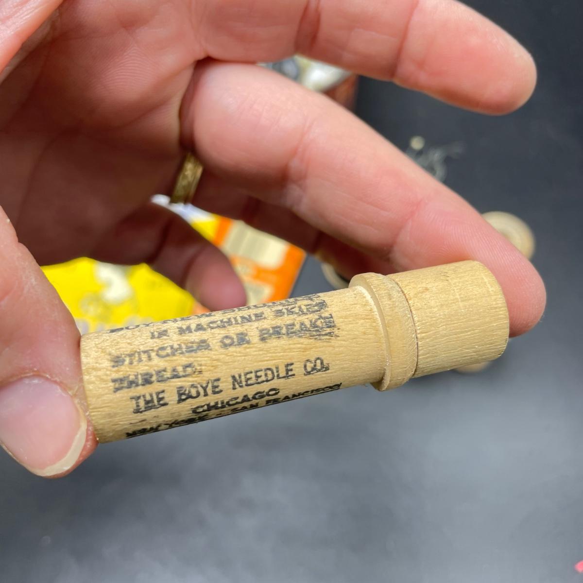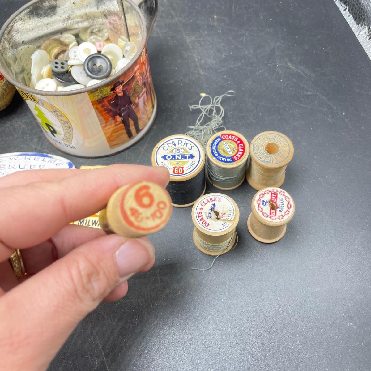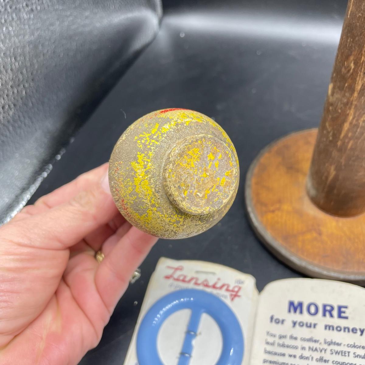 Antique industrial wooden and metal 11” bobbin with vintage thread, buttons and needles including four snuff advertisements with samples inside. Completing the Tops Sweet Snuff ad is a wooden top. The tin mug featuring Ponderosa Ranch is included as well. See images. Shipping available.