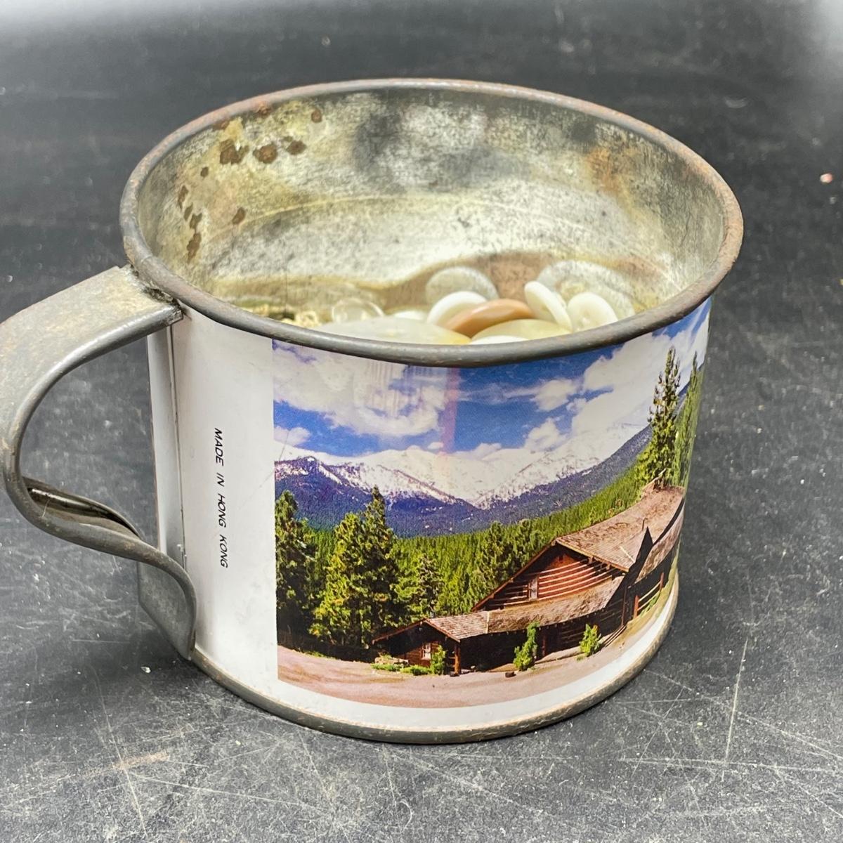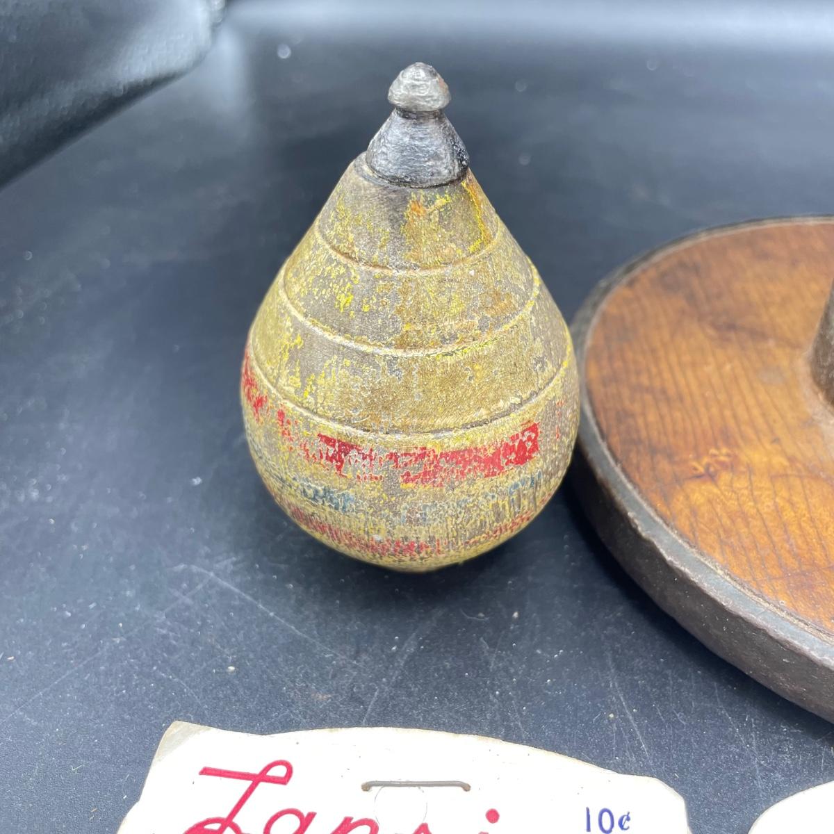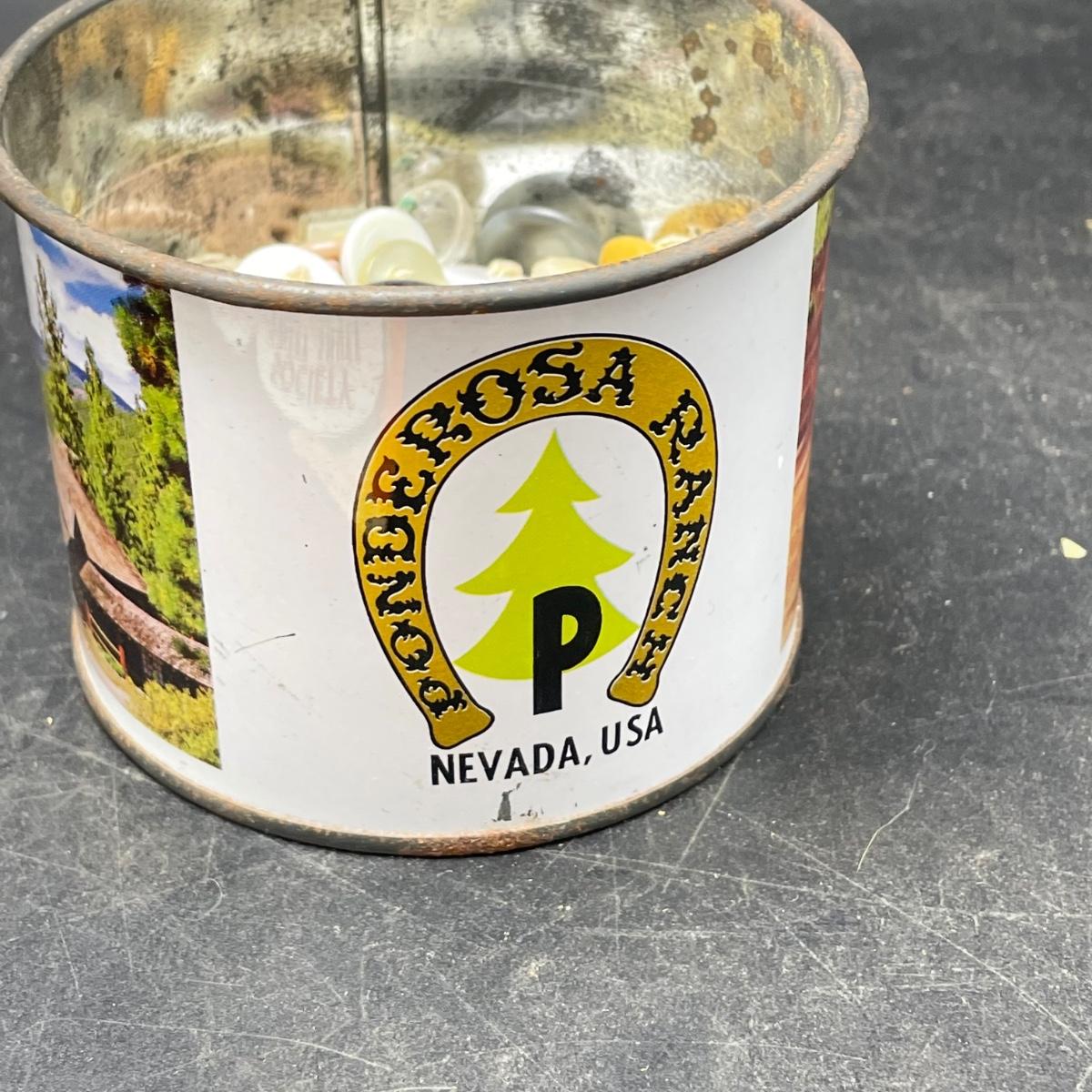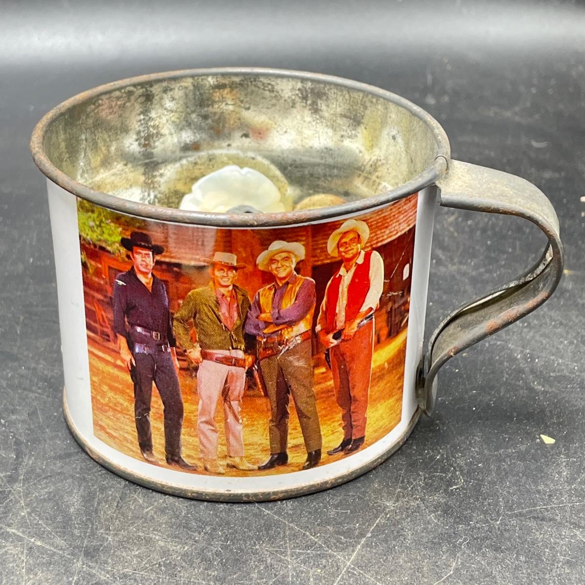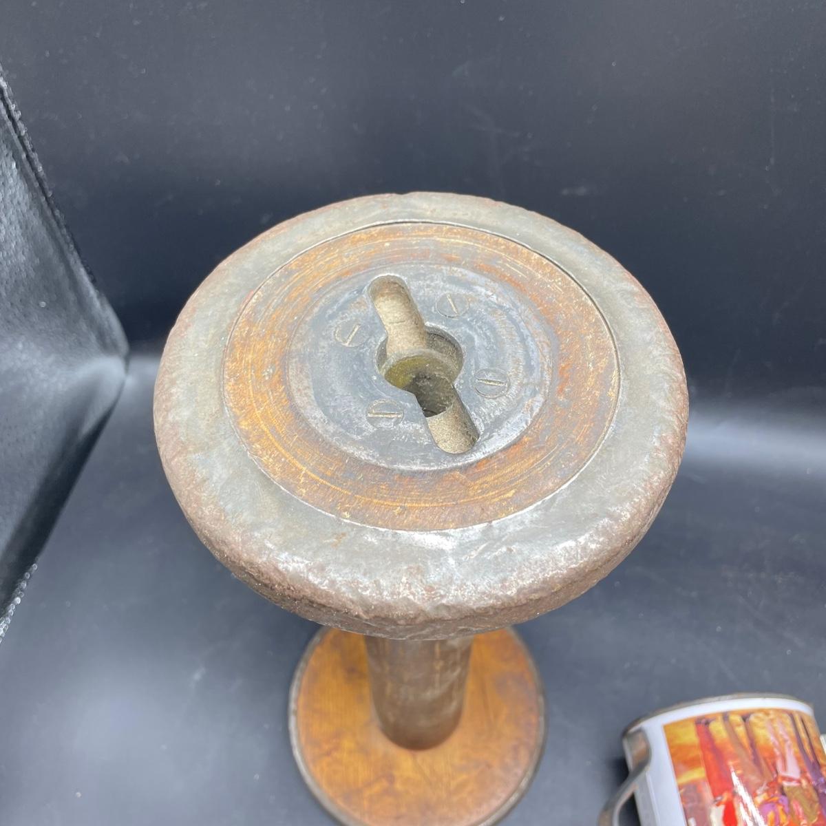 Antique industrial wooden and metal 11” bobbin with vintage thread, buttons and needles including four snuff advertisements with samples inside. Completing the Tops Sweet Snuff ad is a wooden top. The tin mug featuring Ponderosa Ranch is included as well. See images. Shipping available.