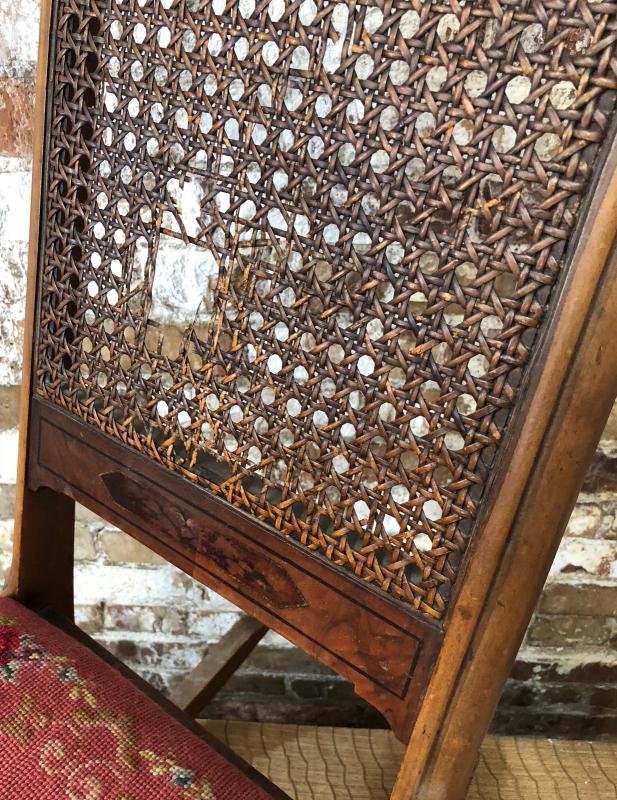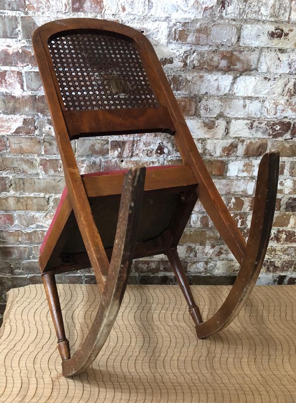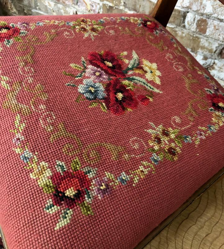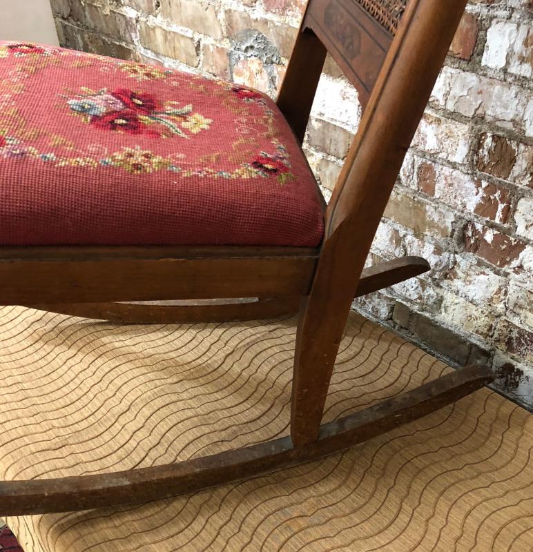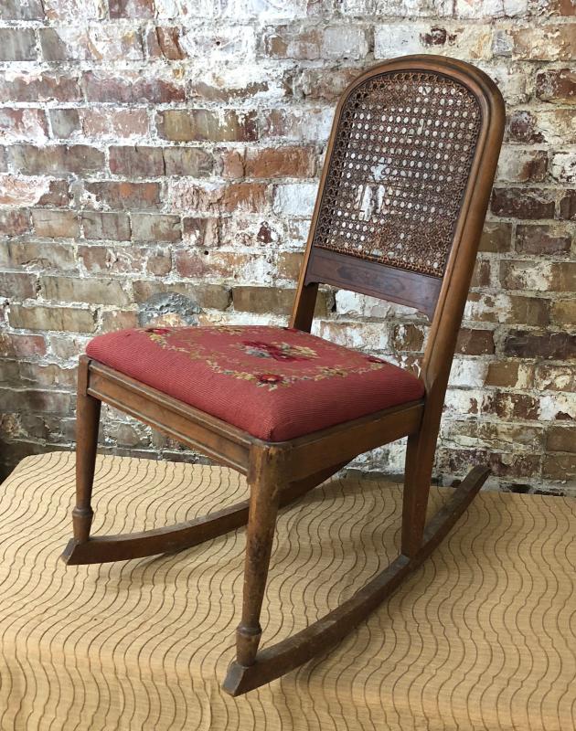 This vintage sewing rocker is offered needing some refurbishment....As is...Damage to back screen..as shown and a is...Hand embroidered seat covering...