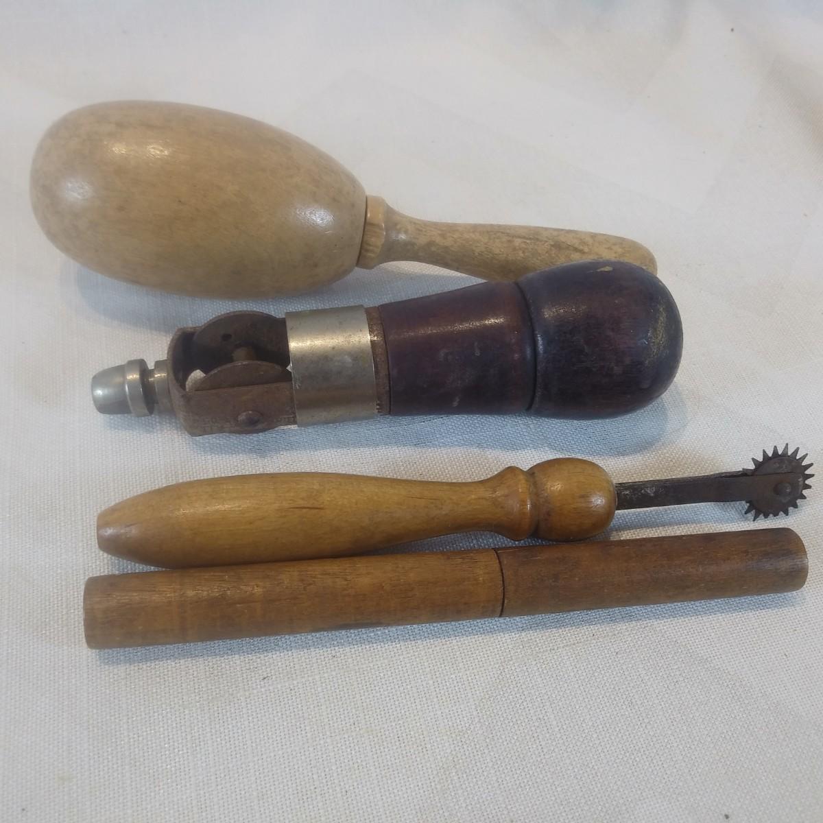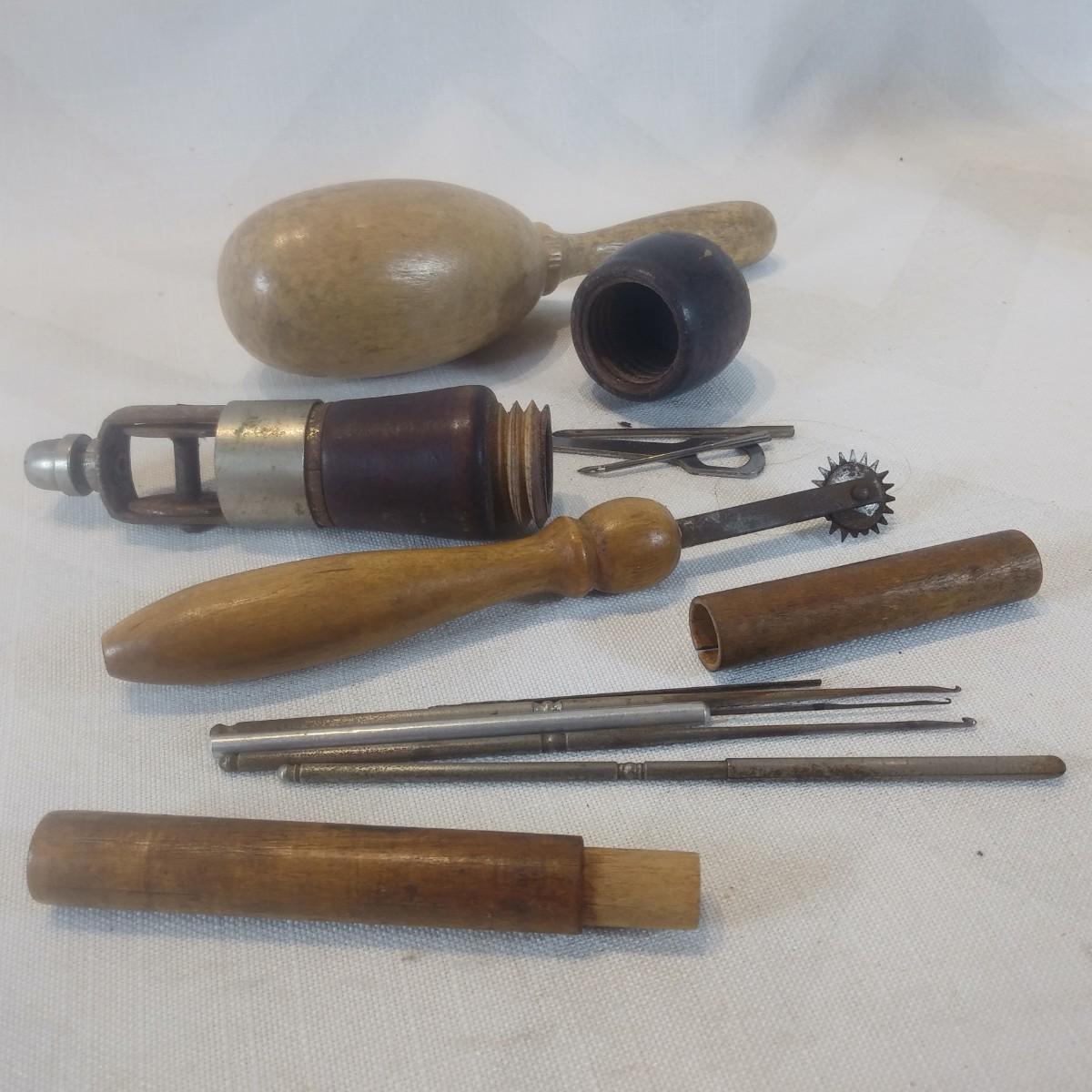This auction lot is for a grouping of Antique Sewing Tools. Handles and containers are all wood. This set includes a Darning egg with handle, a darning set of tools in a wooden sleeve, a leather punch tool set with wooden screw on top and a wooden handled tracing wheel. Some tools have some rusting but it is all consistent with age.