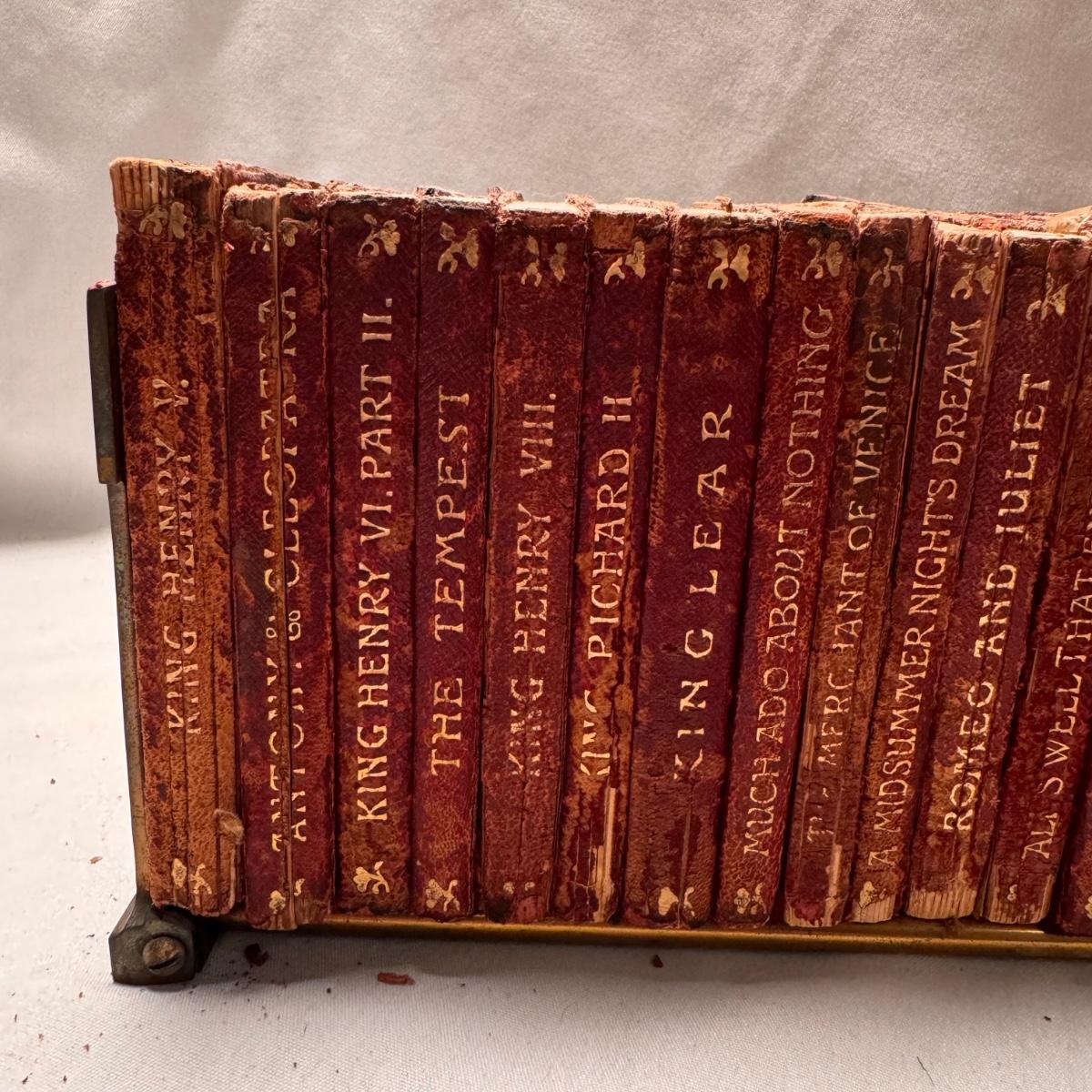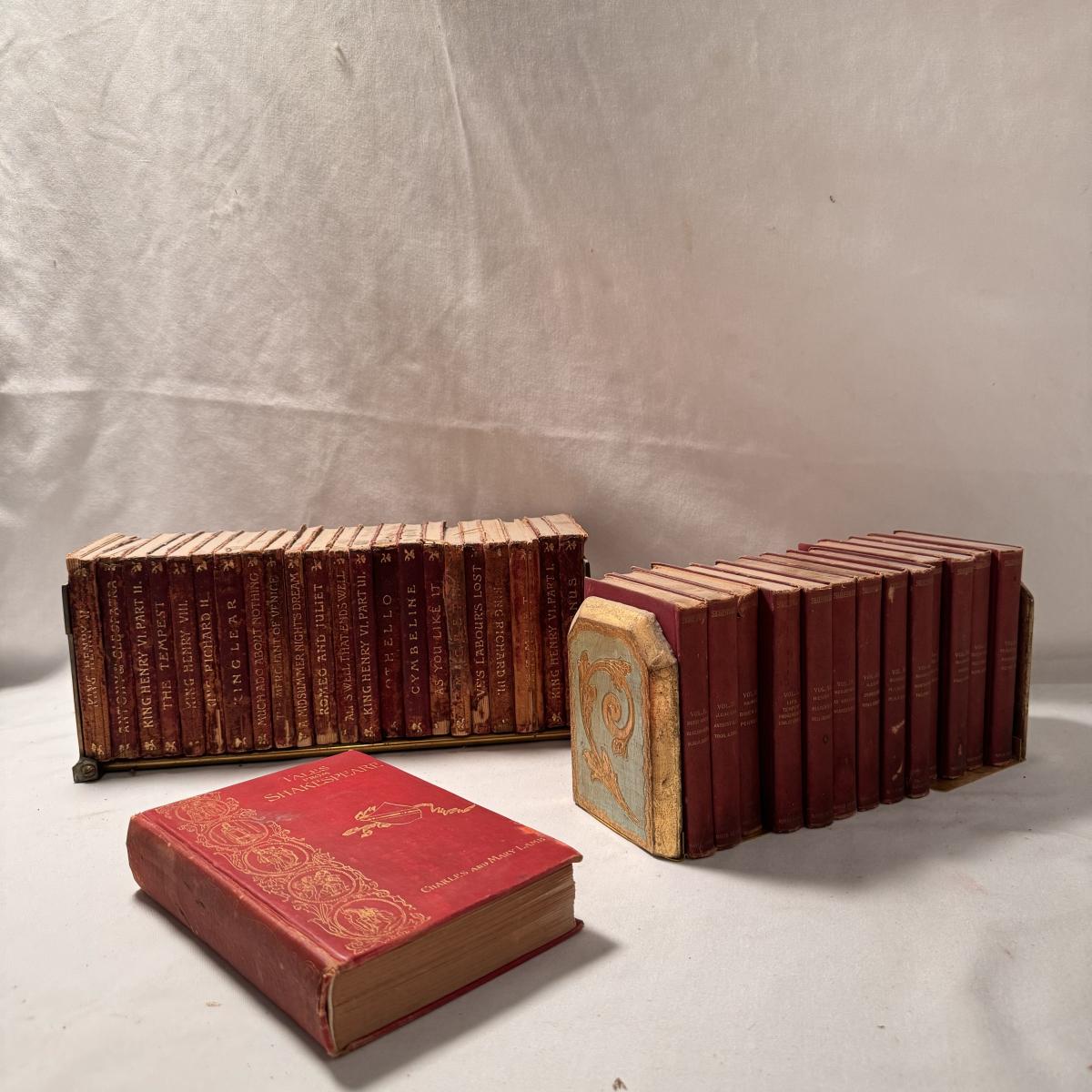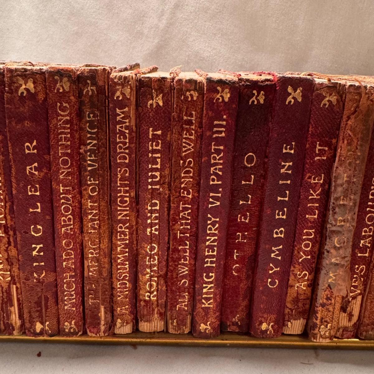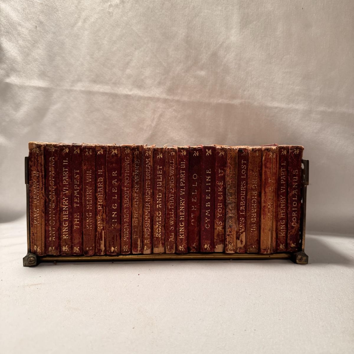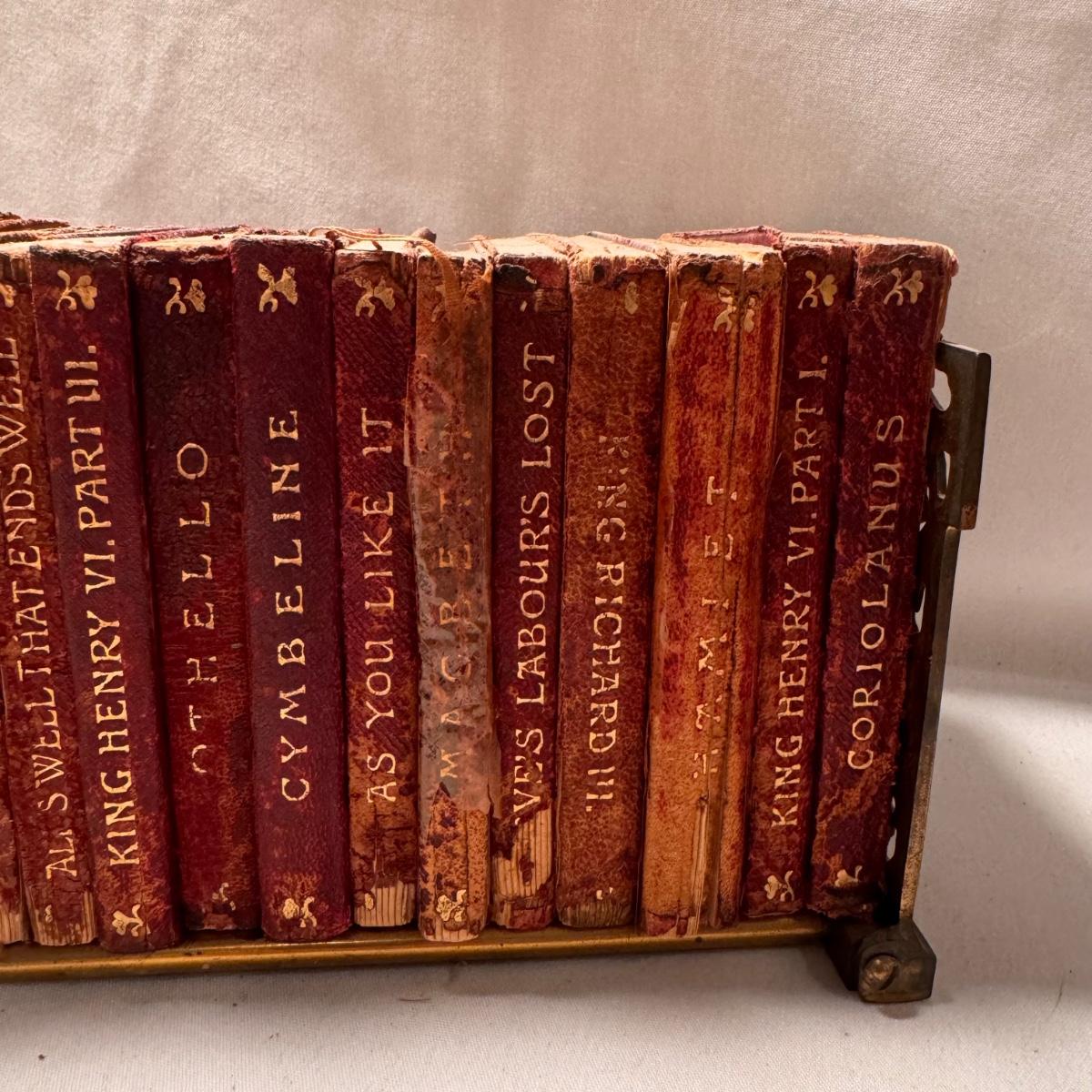 This lot includes over thirty antique Shakespeare books. These books are very old and fragile. These books were published between 1896 and 1901 - see picture included. This lot also comes with four bookends. The largest book that sits alone measures 5” x 1.5” x 7.5”H.