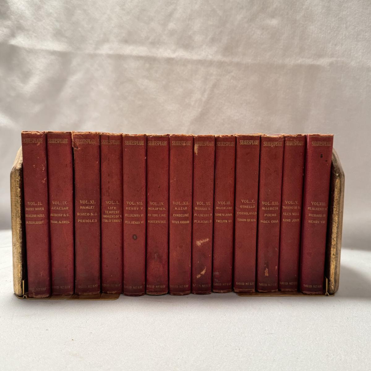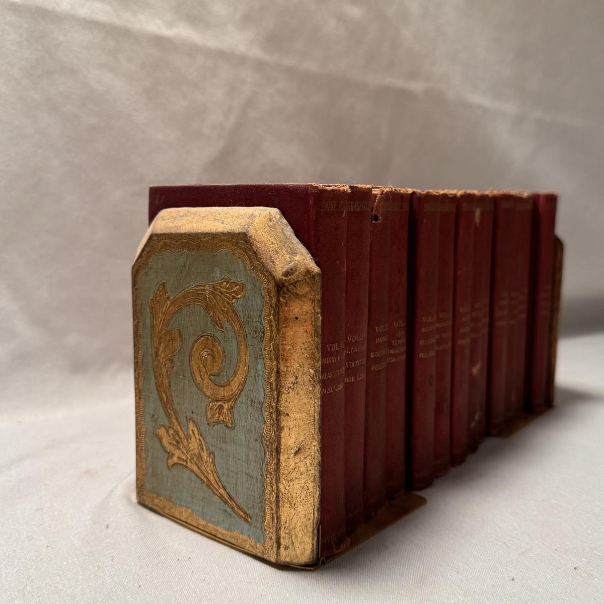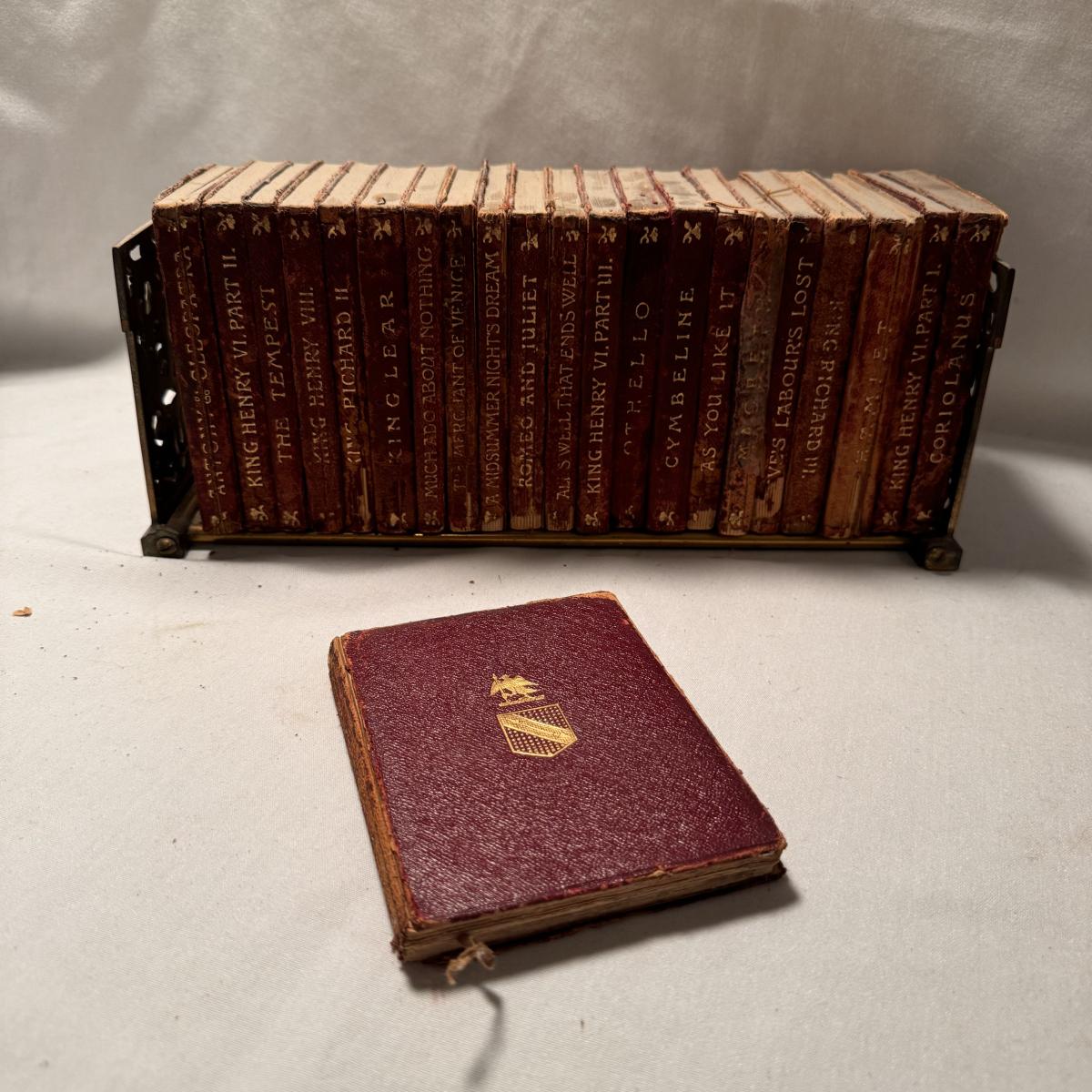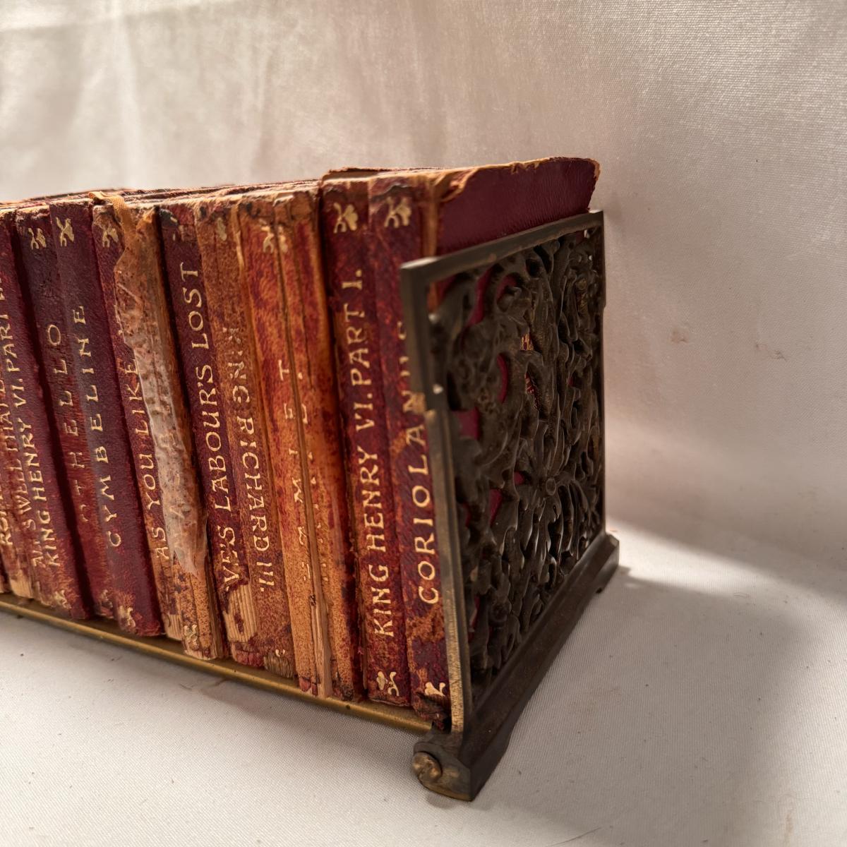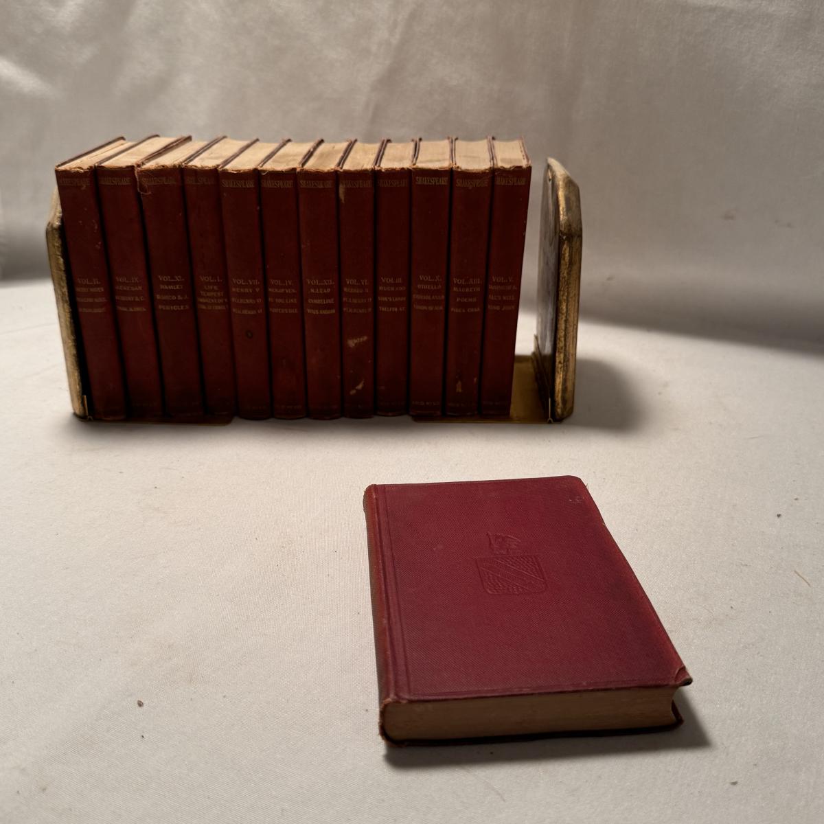 This lot includes over thirty antique Shakespeare books. These books are very old and fragile. These books were published between 1896 and 1901 - see picture included. This lot also comes with four bookends. The largest book that sits alone measures 5” x 1.5” x 7.5”H.