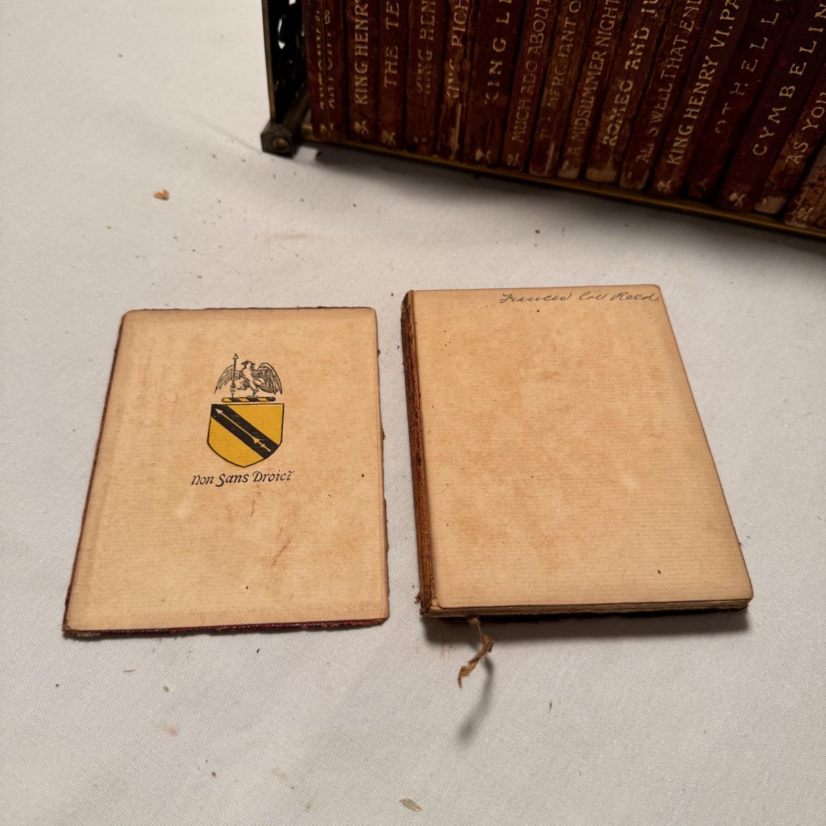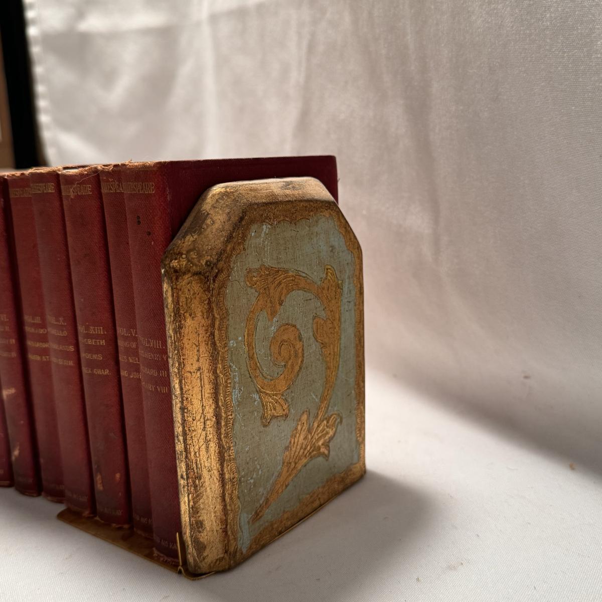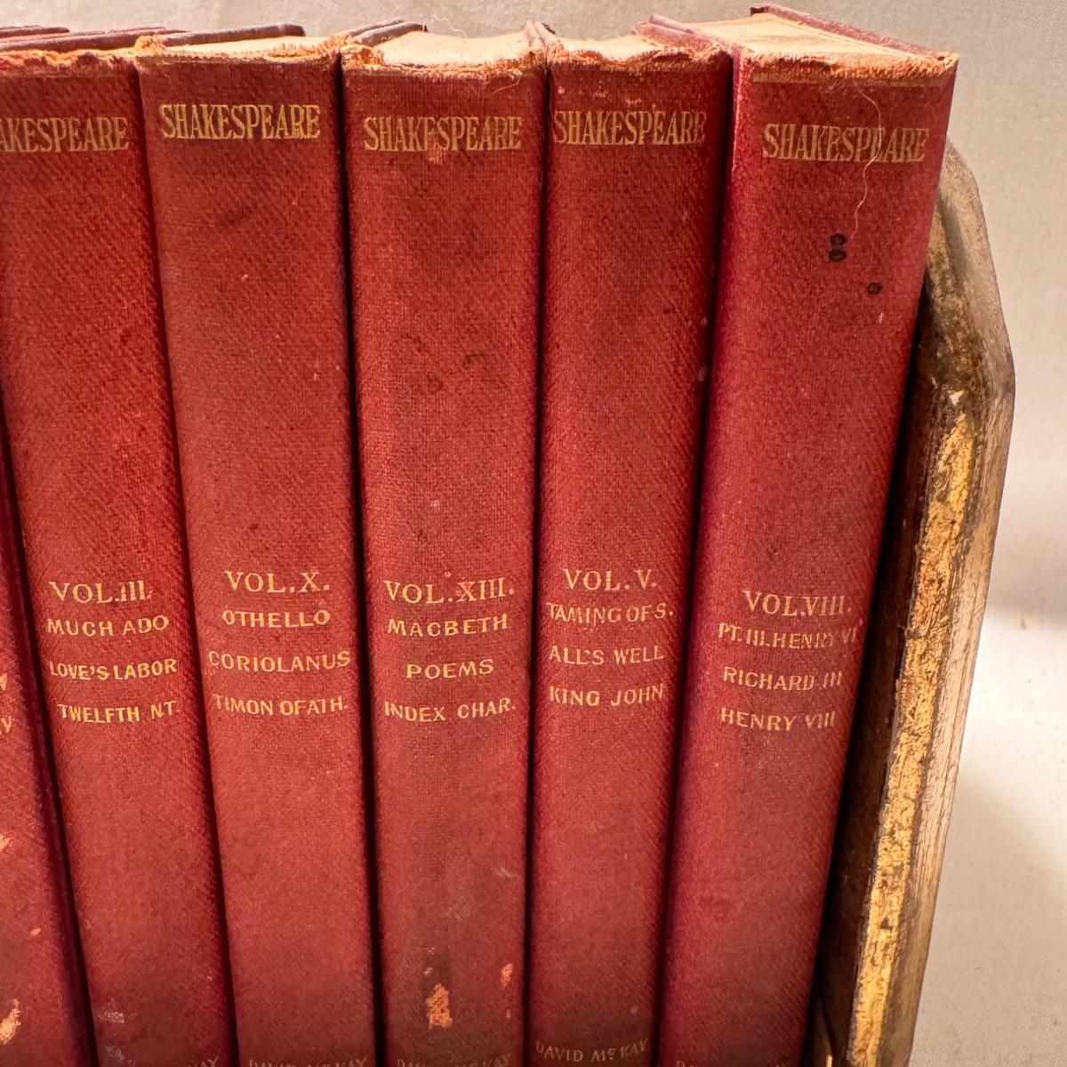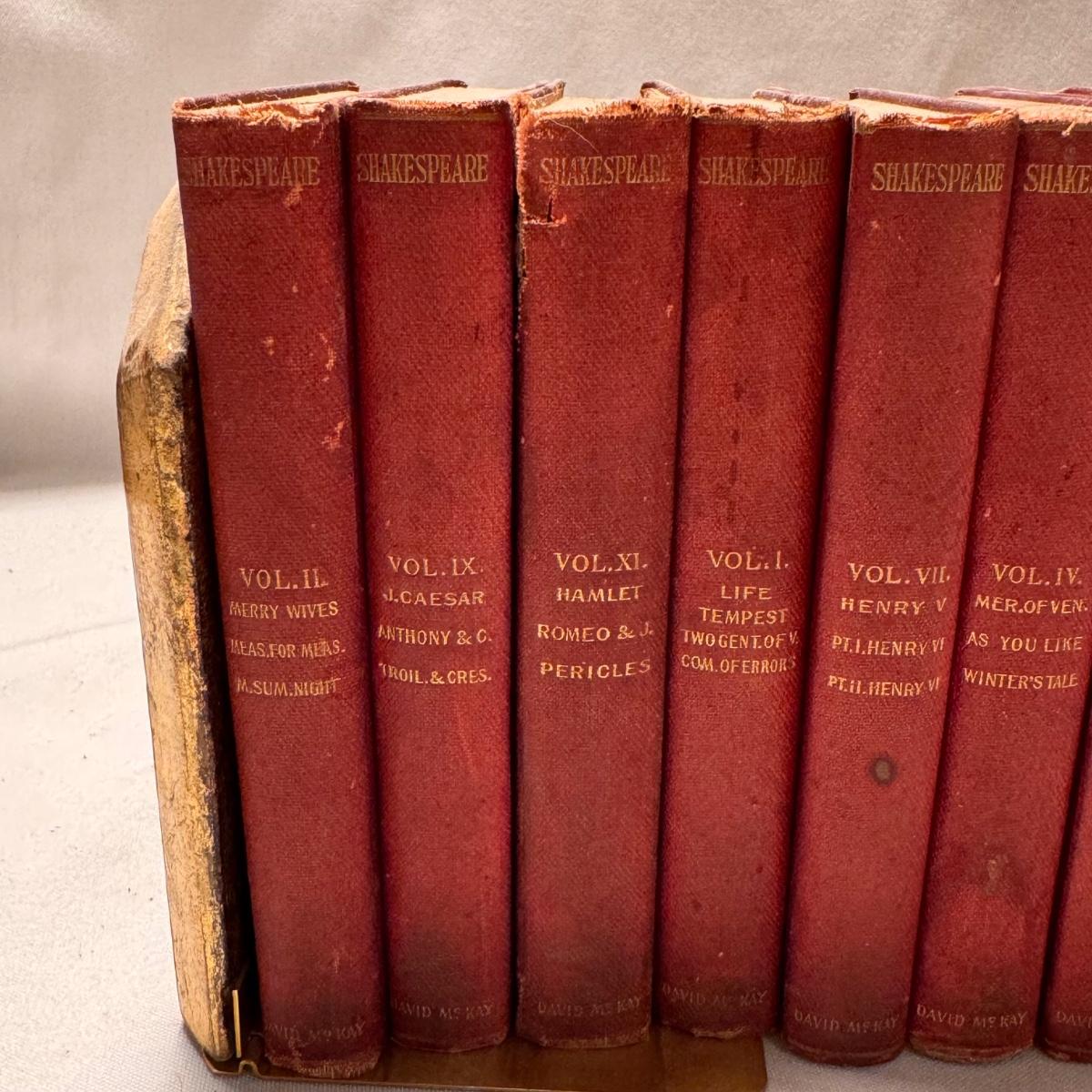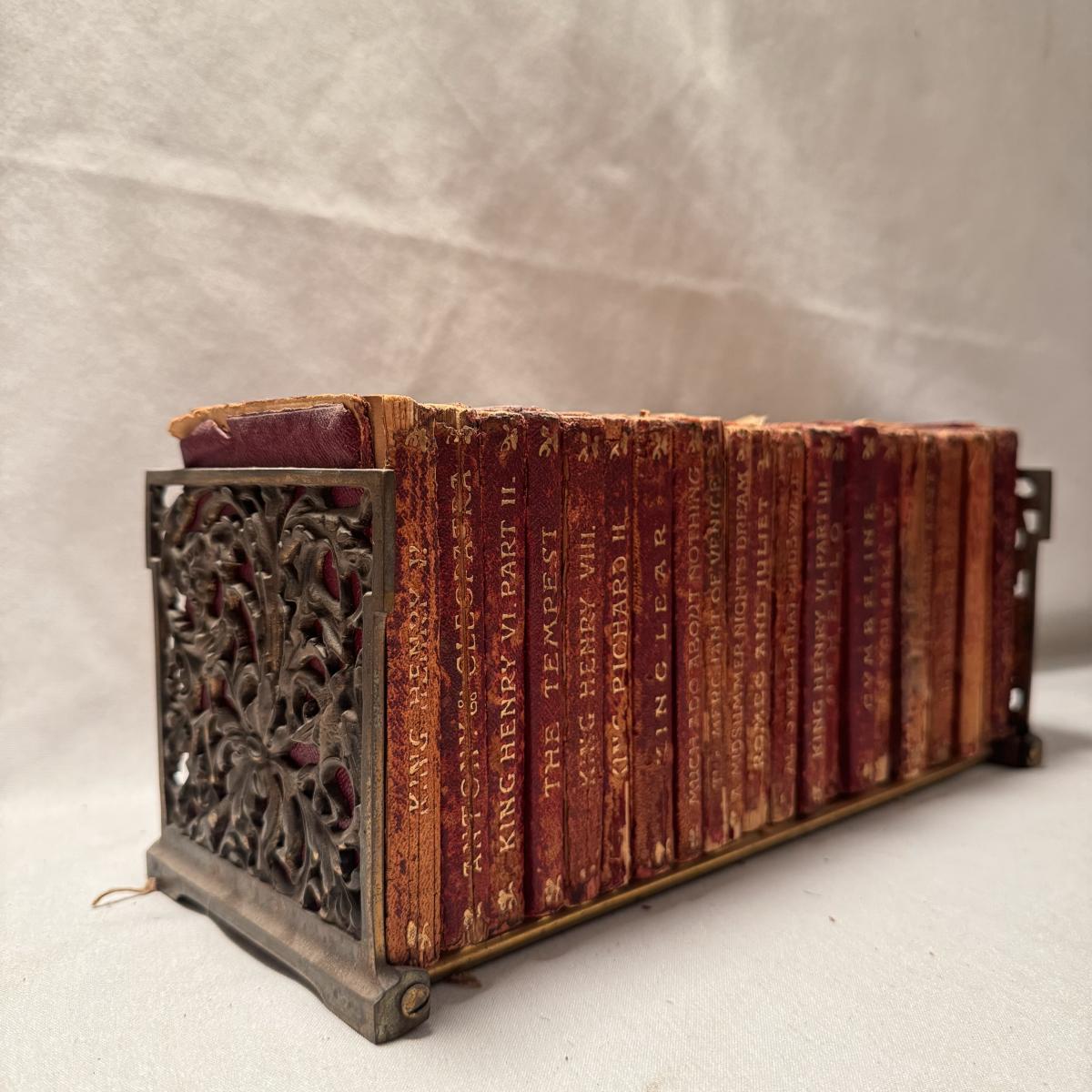 This lot includes over thirty antique Shakespeare books. These books are very old and fragile. These books were published between 1896 and 1901 - see picture included. This lot also comes with four bookends. The largest book that sits alone measures 5” x 1.5” x 7.5”H.