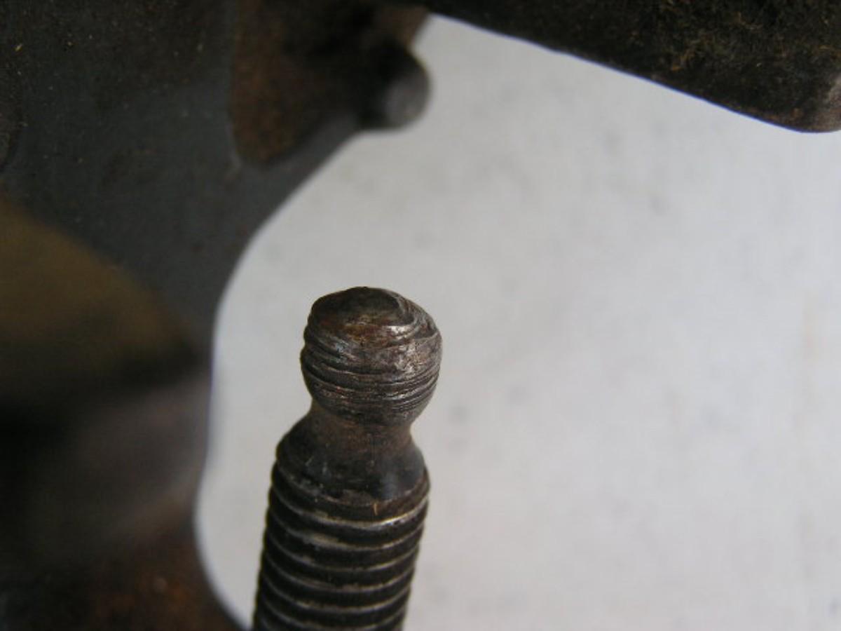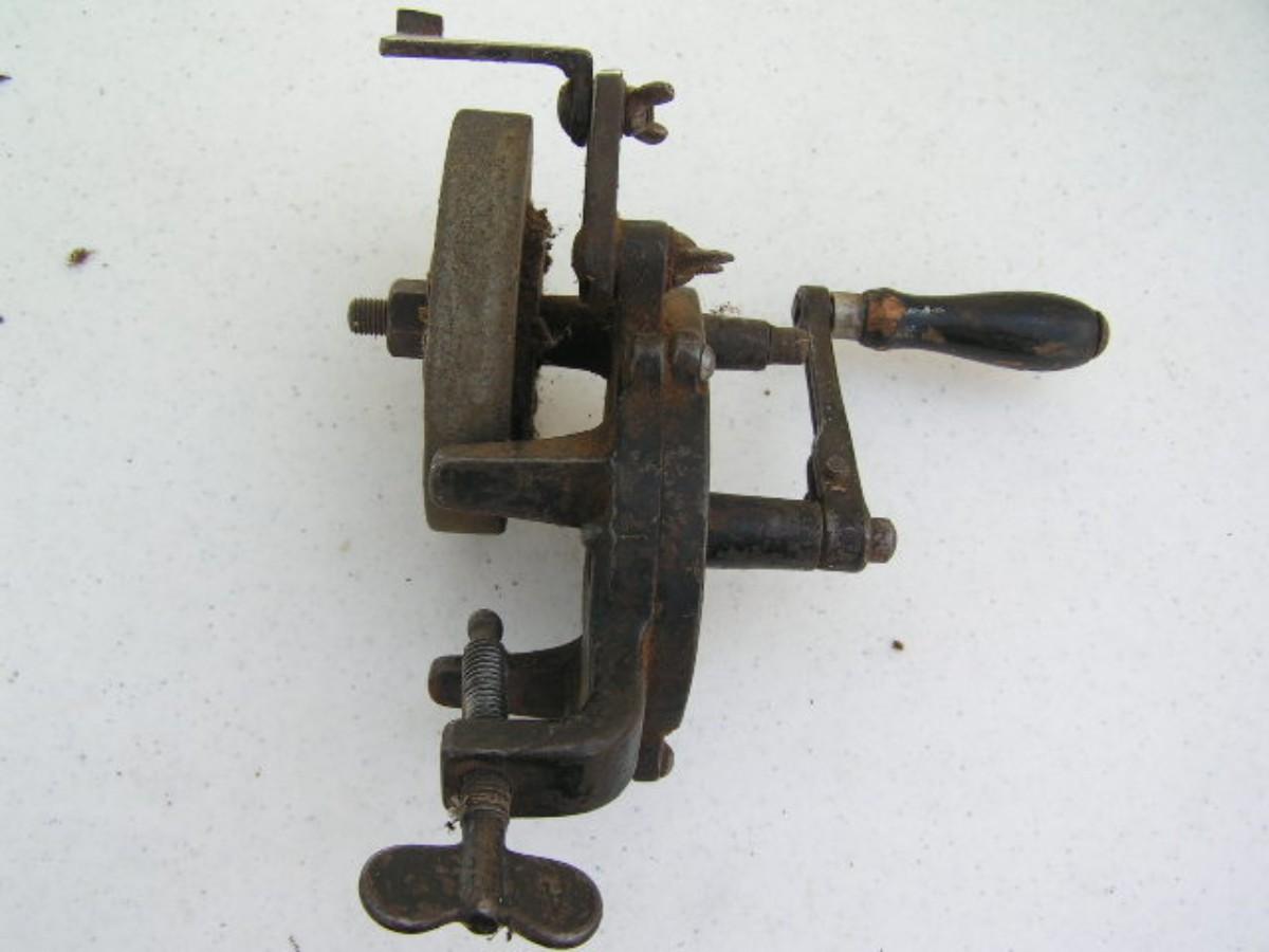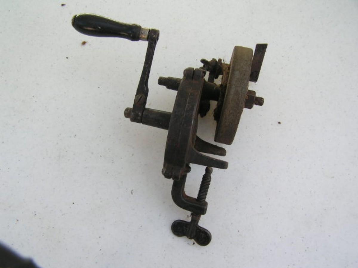 Antique sharpening tool. Clamp to table top or counter top. Operate crank to energize friction motor which keeps the Carborundum wheel spinning to sharpen tools. Very old technology. Seems to work as designed. Needs missing clamp shoe replaced