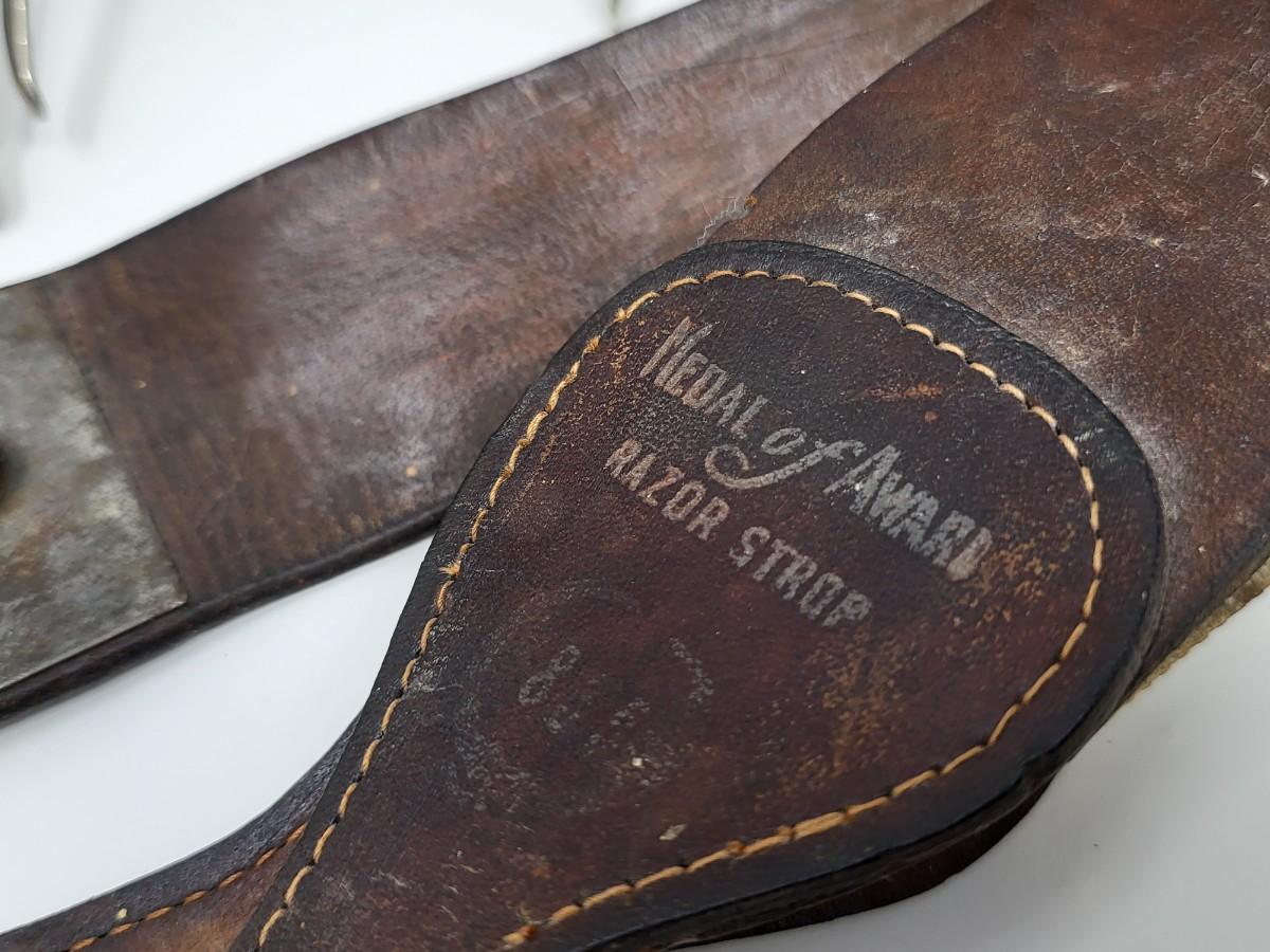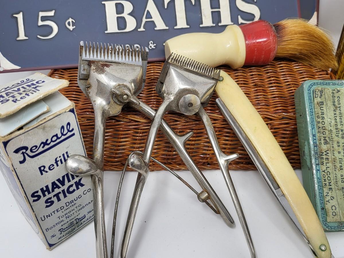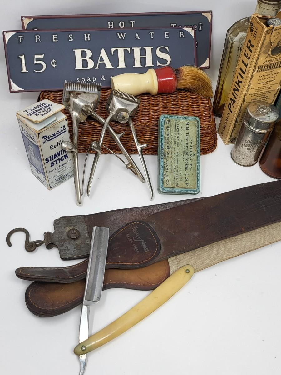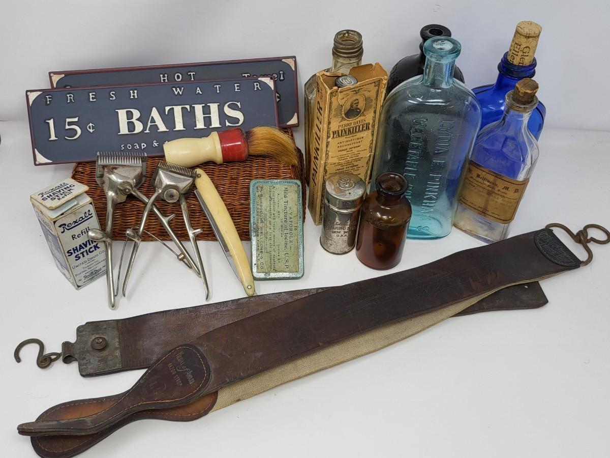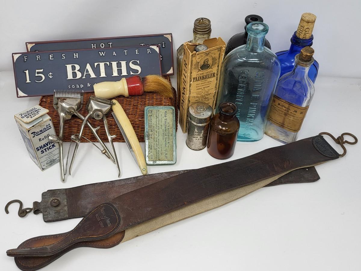 Antique razors, leather straps, tin, collectible glass bottles & more.