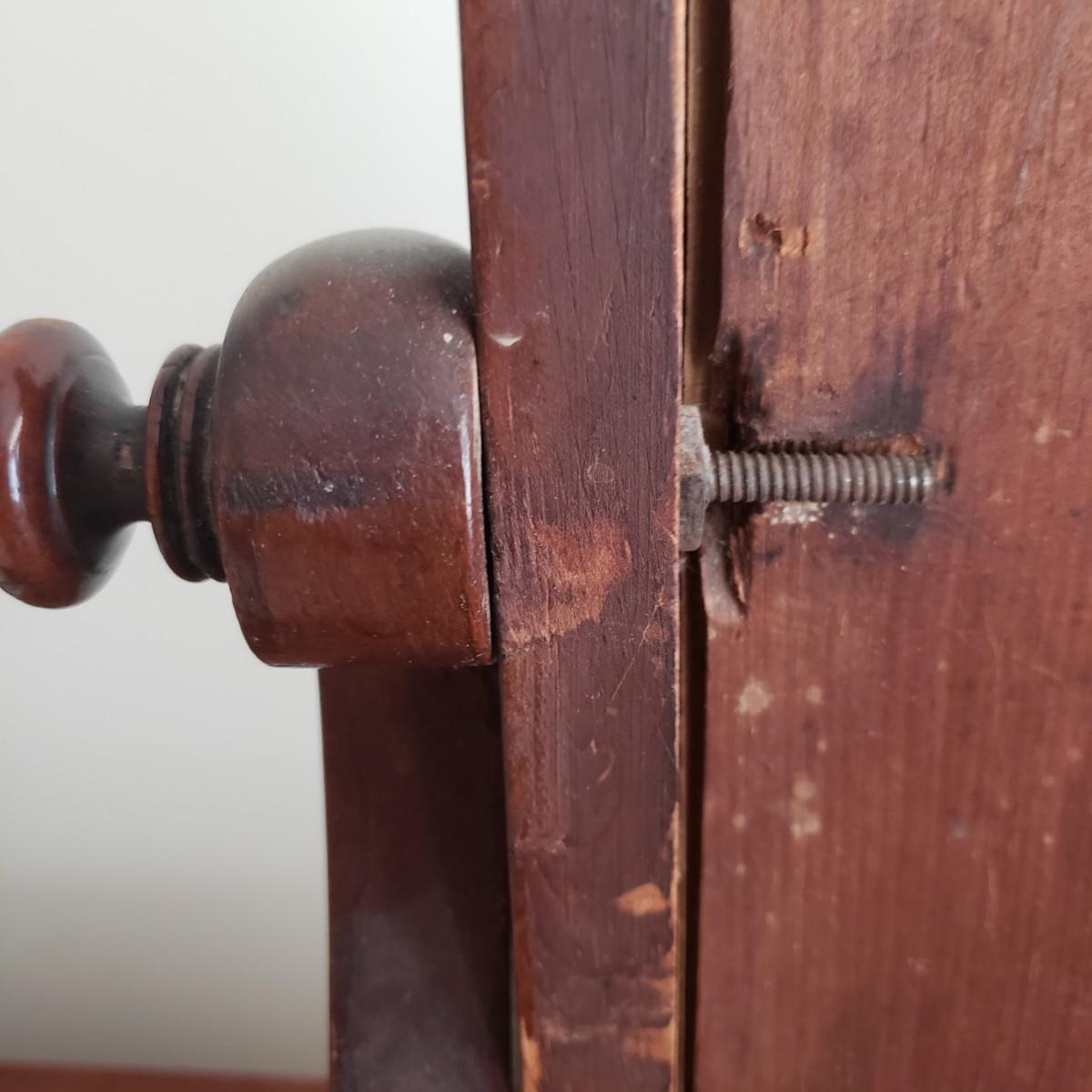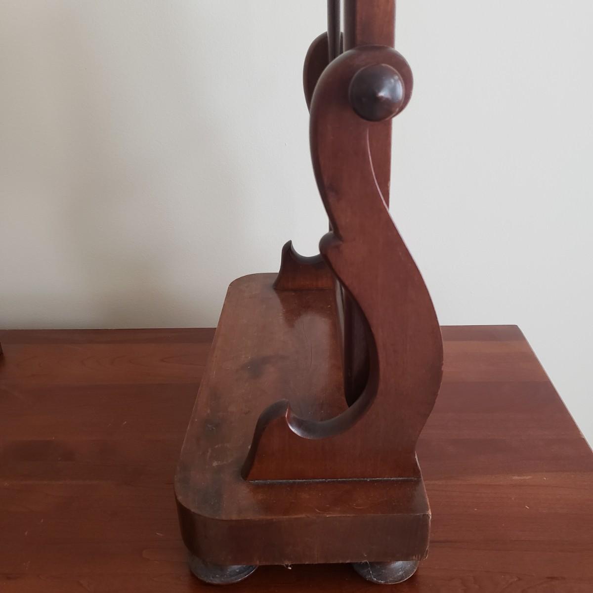 This possibly antique shaving mirror would be a great addition to any dresser! The mirror swivels from the knobs on each side. There is some wear on the top due to age. The mirror measures 19" x 8" x 25"H.