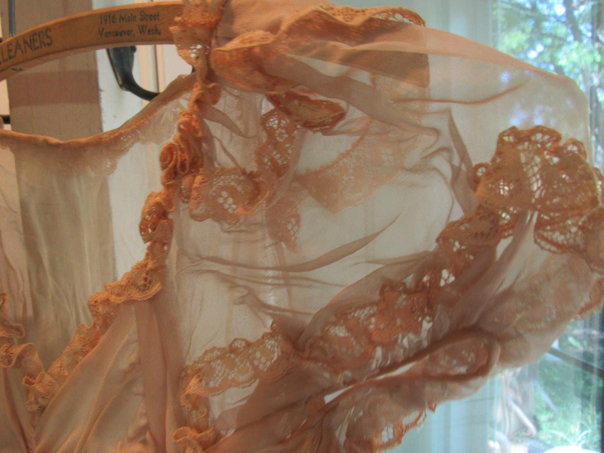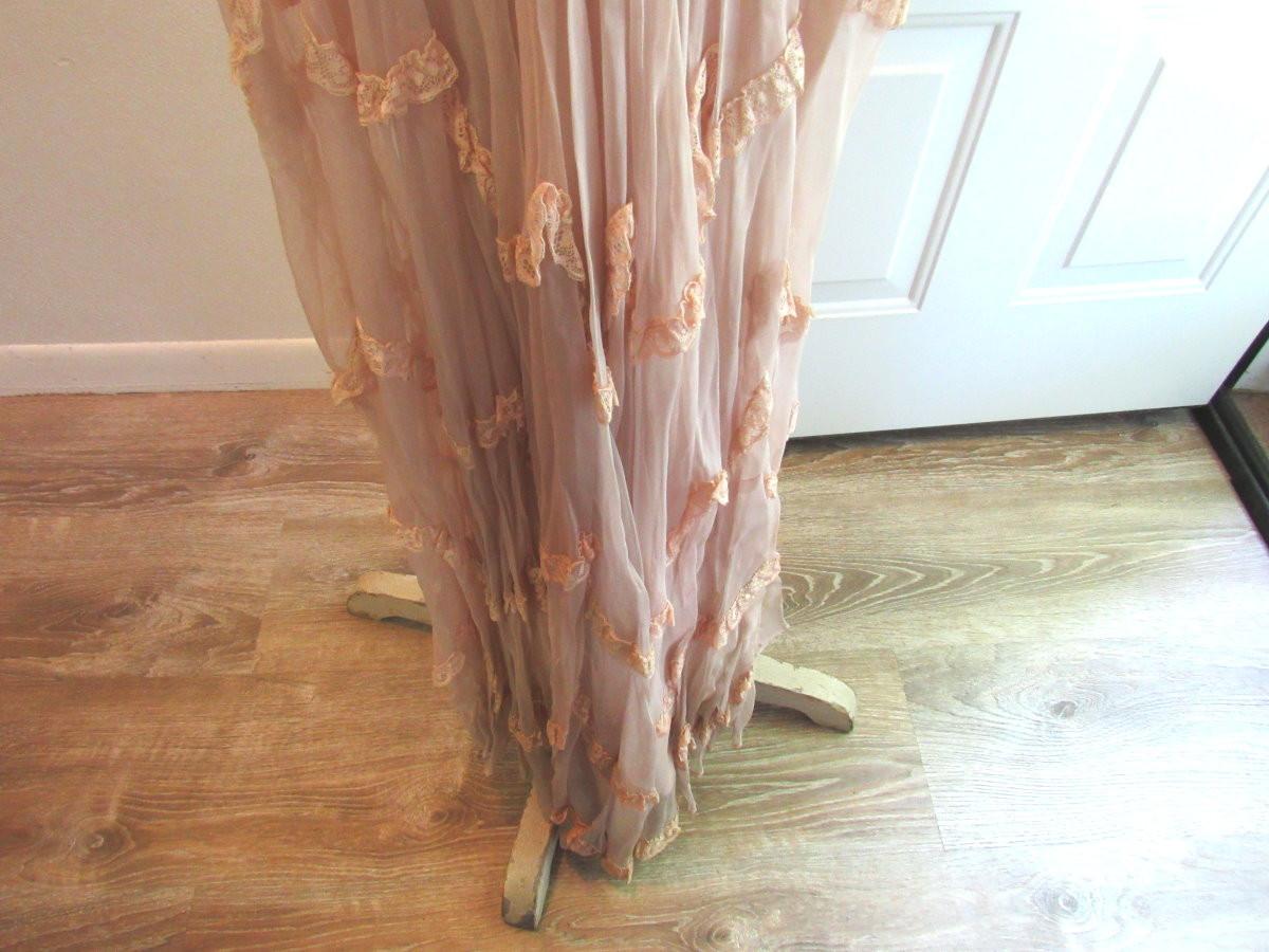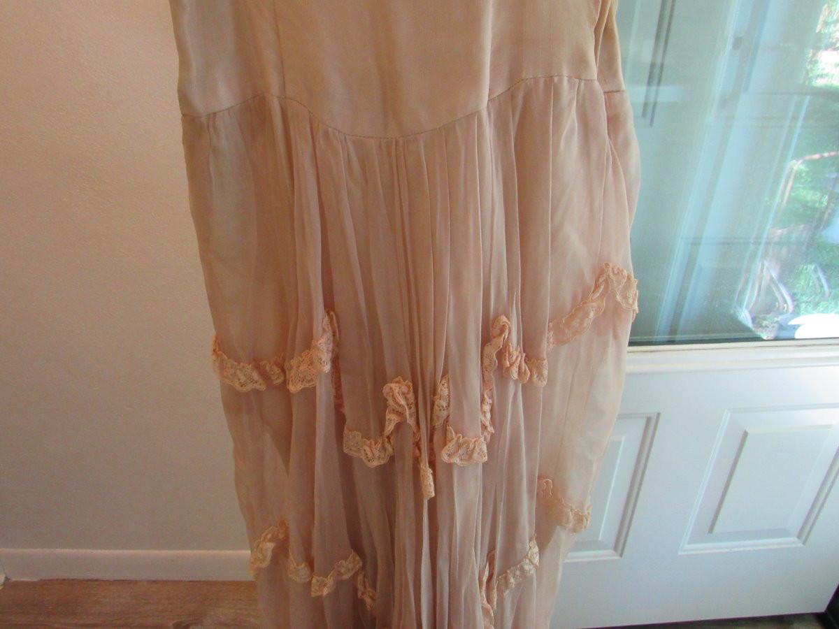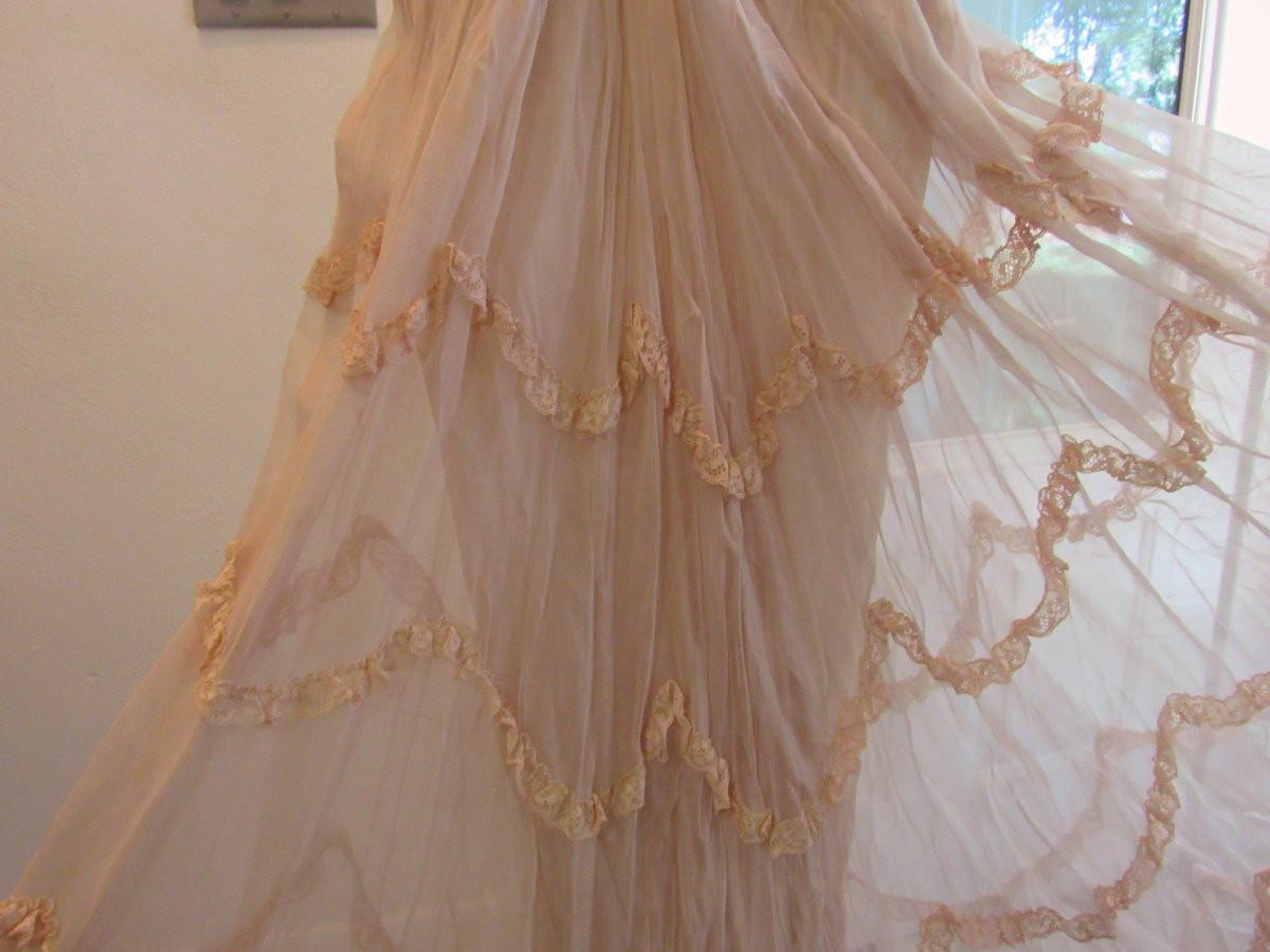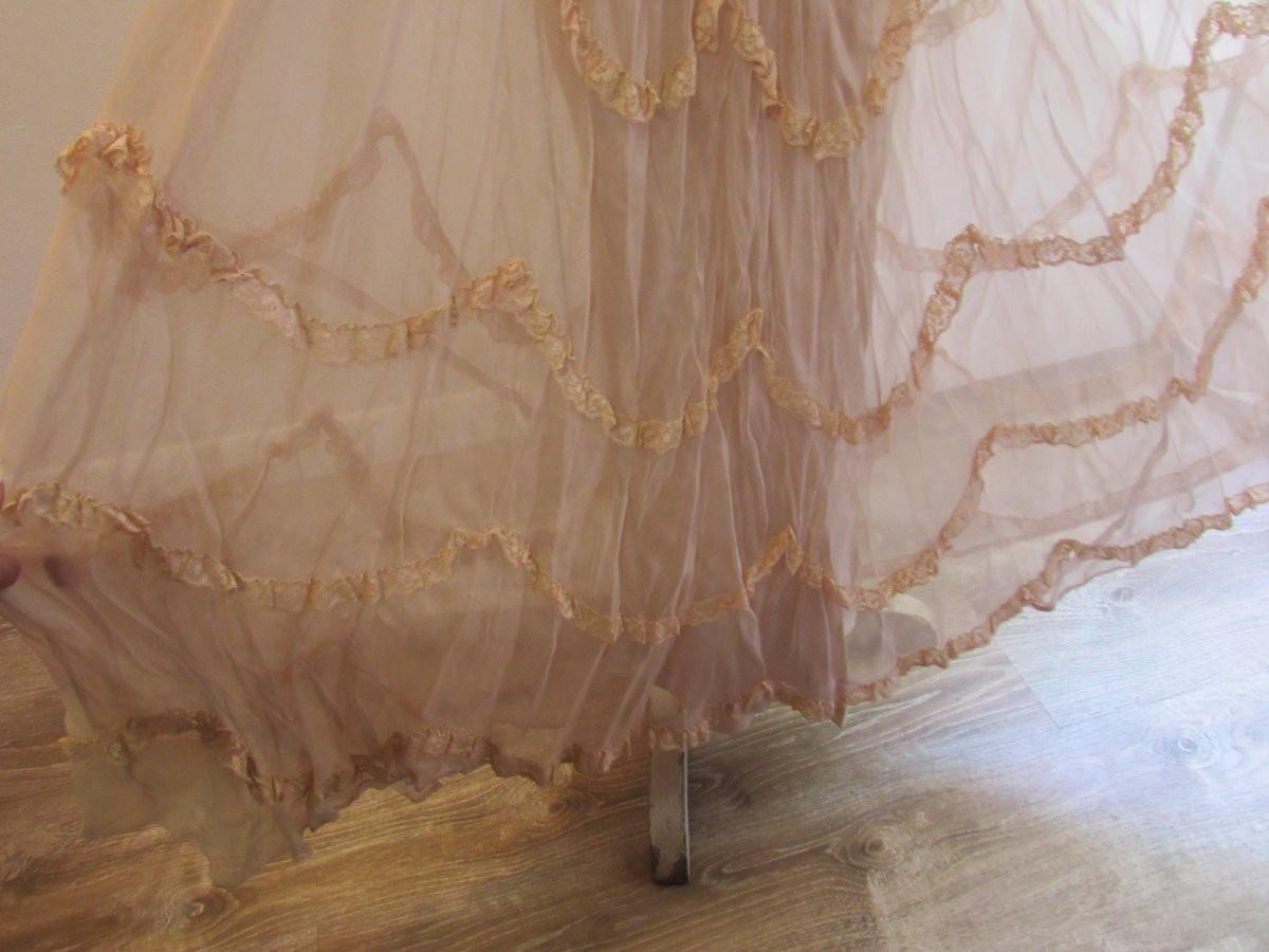 Lot 52:  Antique Sheer Pale Pink Lacy Fancy Frilly Dress With Applied Lace Ruffles, Puffy Short Sleeves