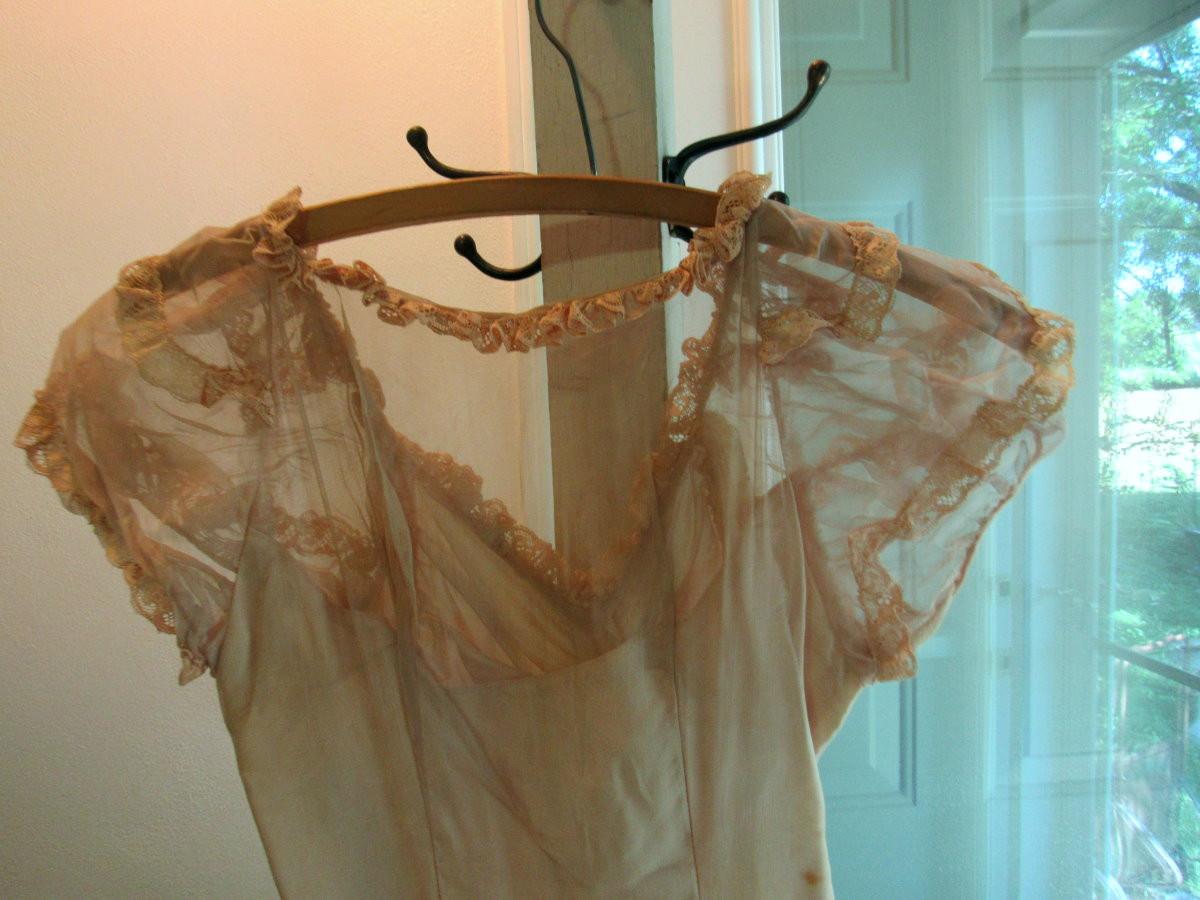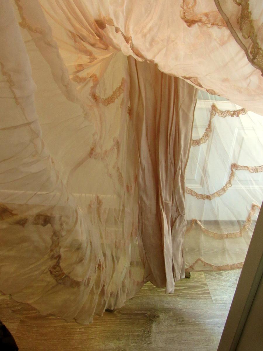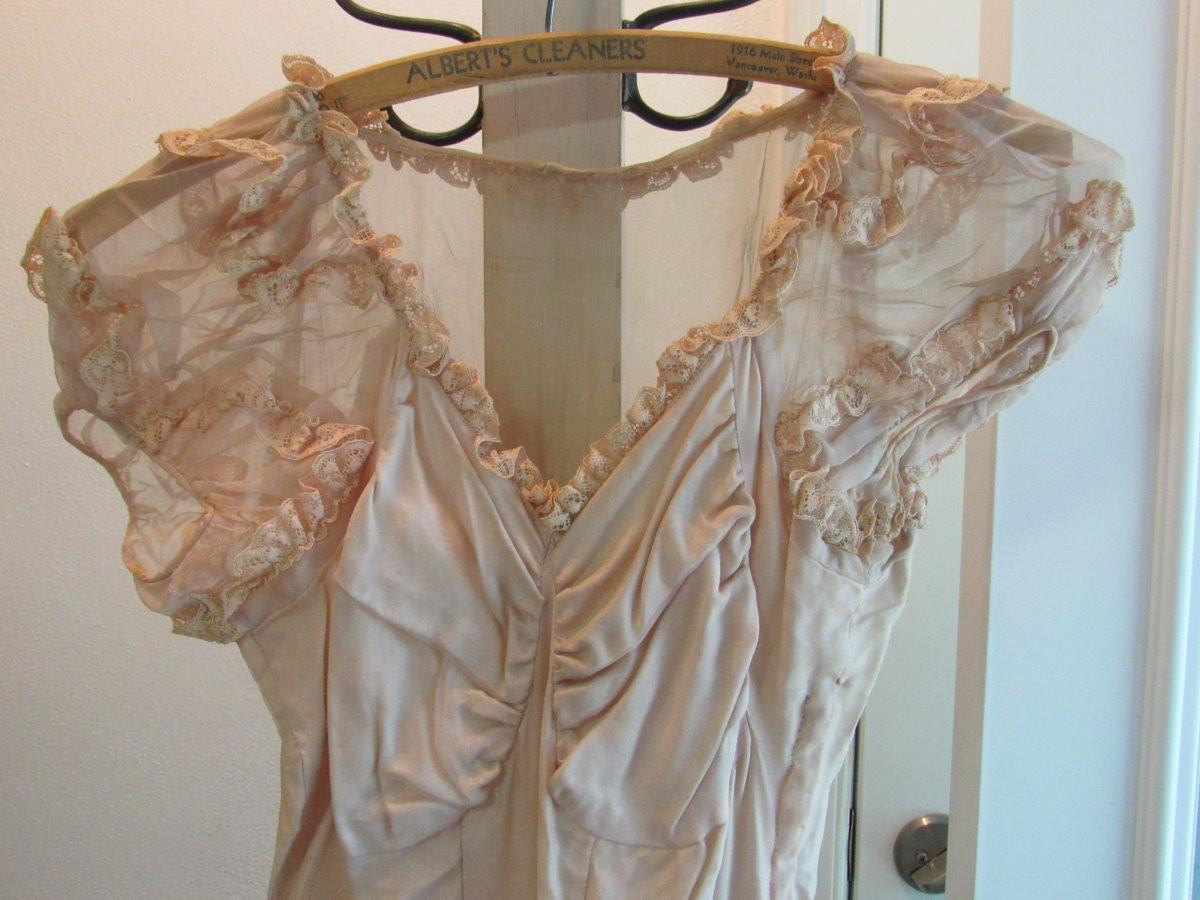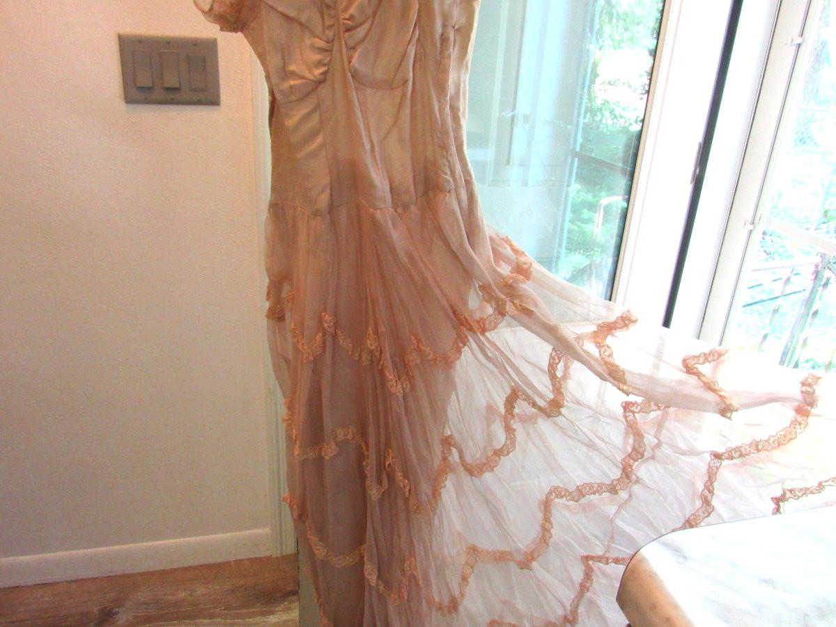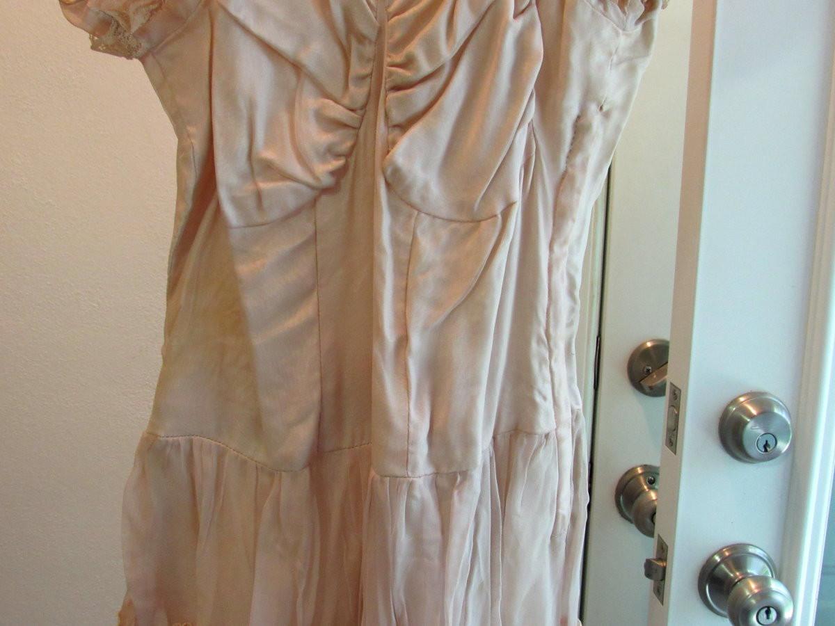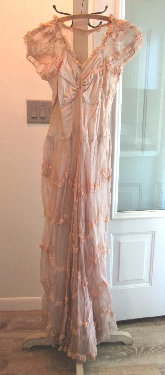 Thinking 1920-30s. About 58" long. Very narrow waist, about 12" wide, size unknown. Fragile sheer fabric and lace. Machine sewn, hand hemmed. Side zipper good. Nice underskirt with sheer overskirt, tons of fabric. Overall very good shape, one smaller stain on back as seen in photo. I see no tears. No makers lables. Who in the heck would make something this fancy and not put a label in it???