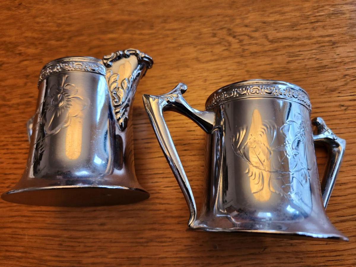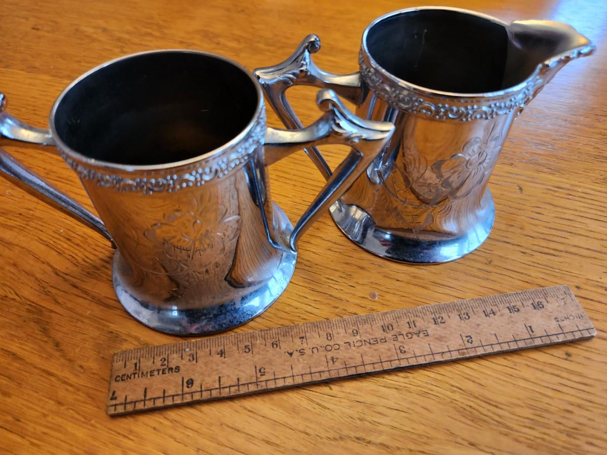 This auction lot is for an Antique Sheffield Silver Company Silverplate Sugar Bowl and Creamer Set with very nice etching of leaves and flowers. This set is electroplate over copper. Polished a bit but could use a bit more. Normal patina consistent with age and use.