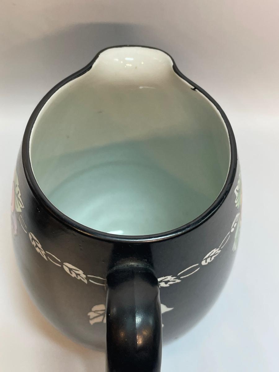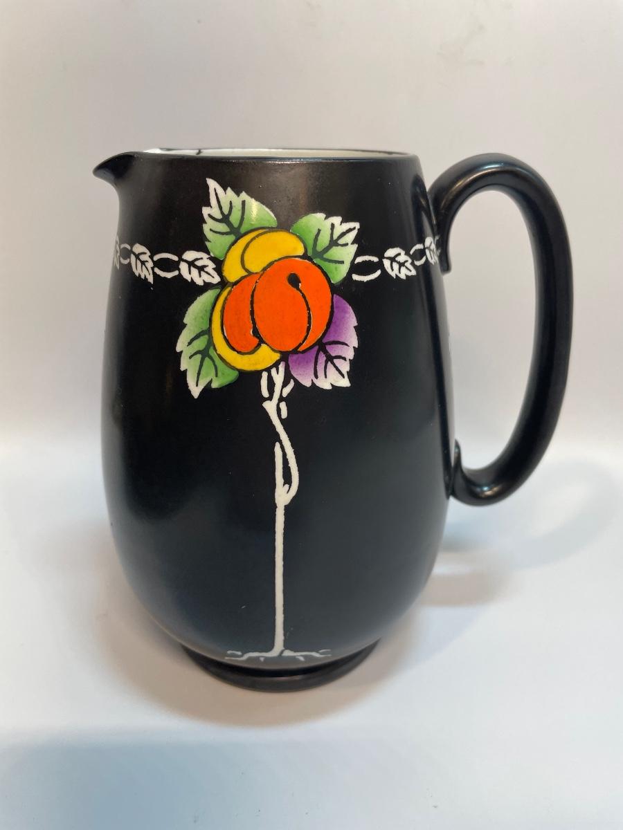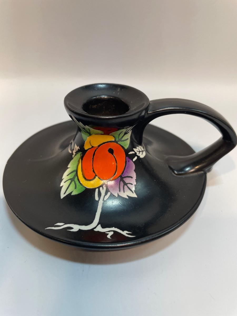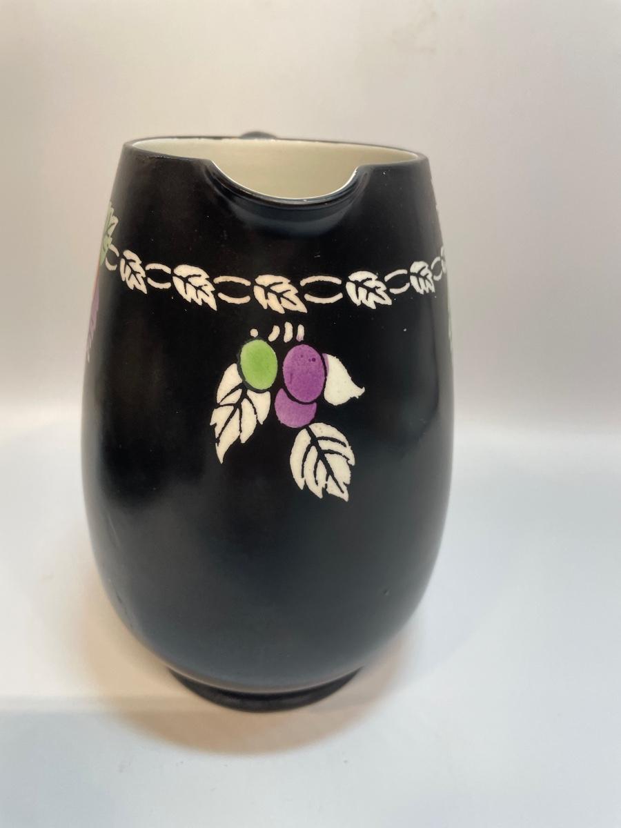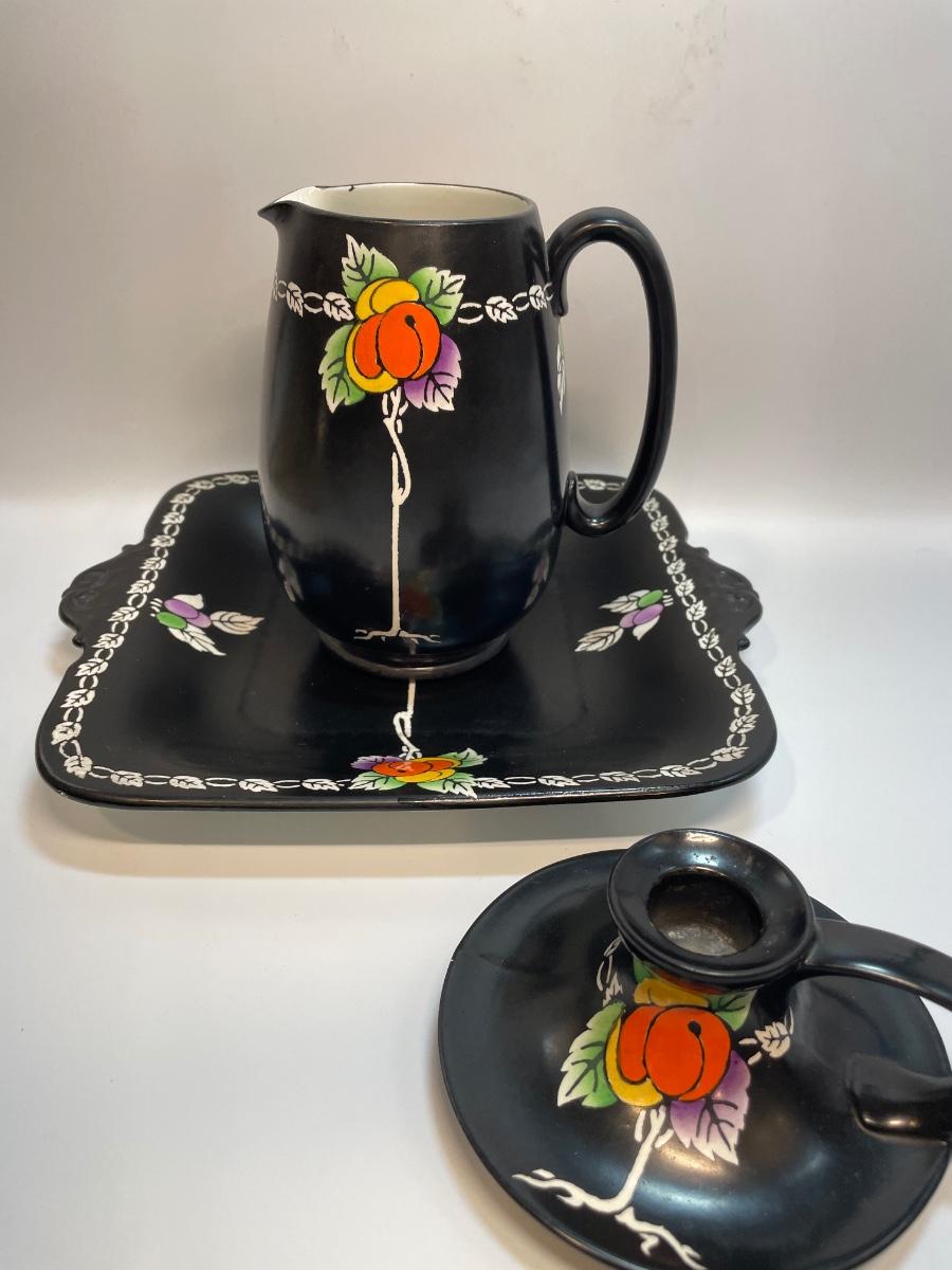 Beautiful Fruits On Black set! No chips or cracks. Tray 10.5x9, Pitcher, 6.5, Candleholder 5” w.
