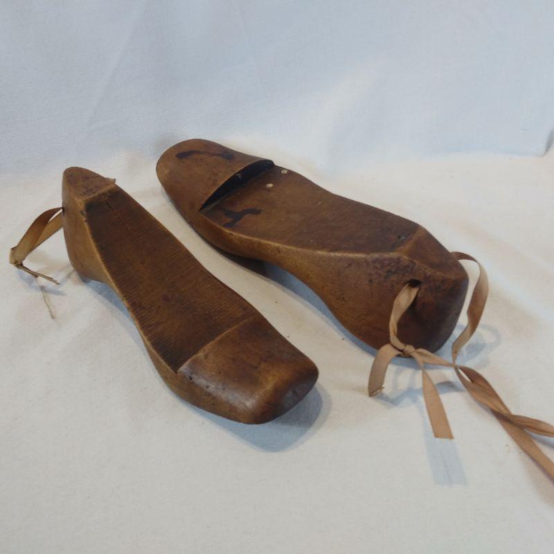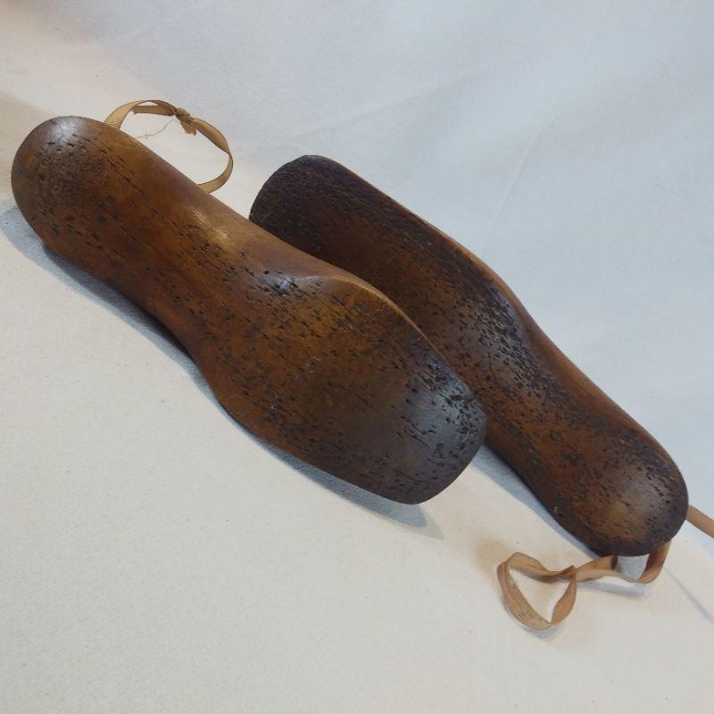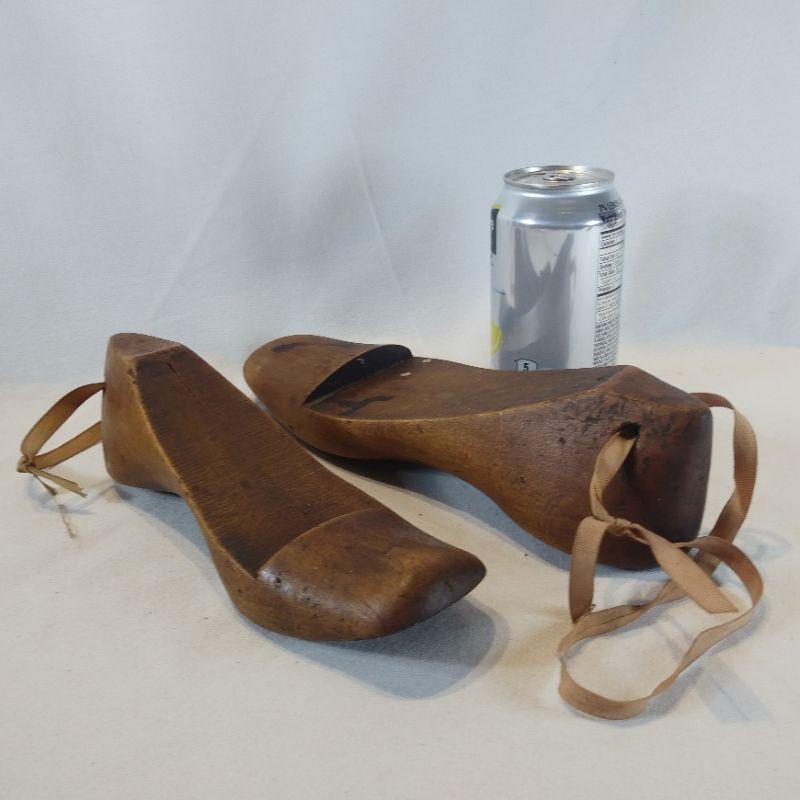 This is a nice pair of old shoe stretcher/lasts. Client added the ribbon to hang on wall. One measures 9-inches long and the other is 10 1/2-inches long. These are so neat and would look great hanging in your shoe boudior.