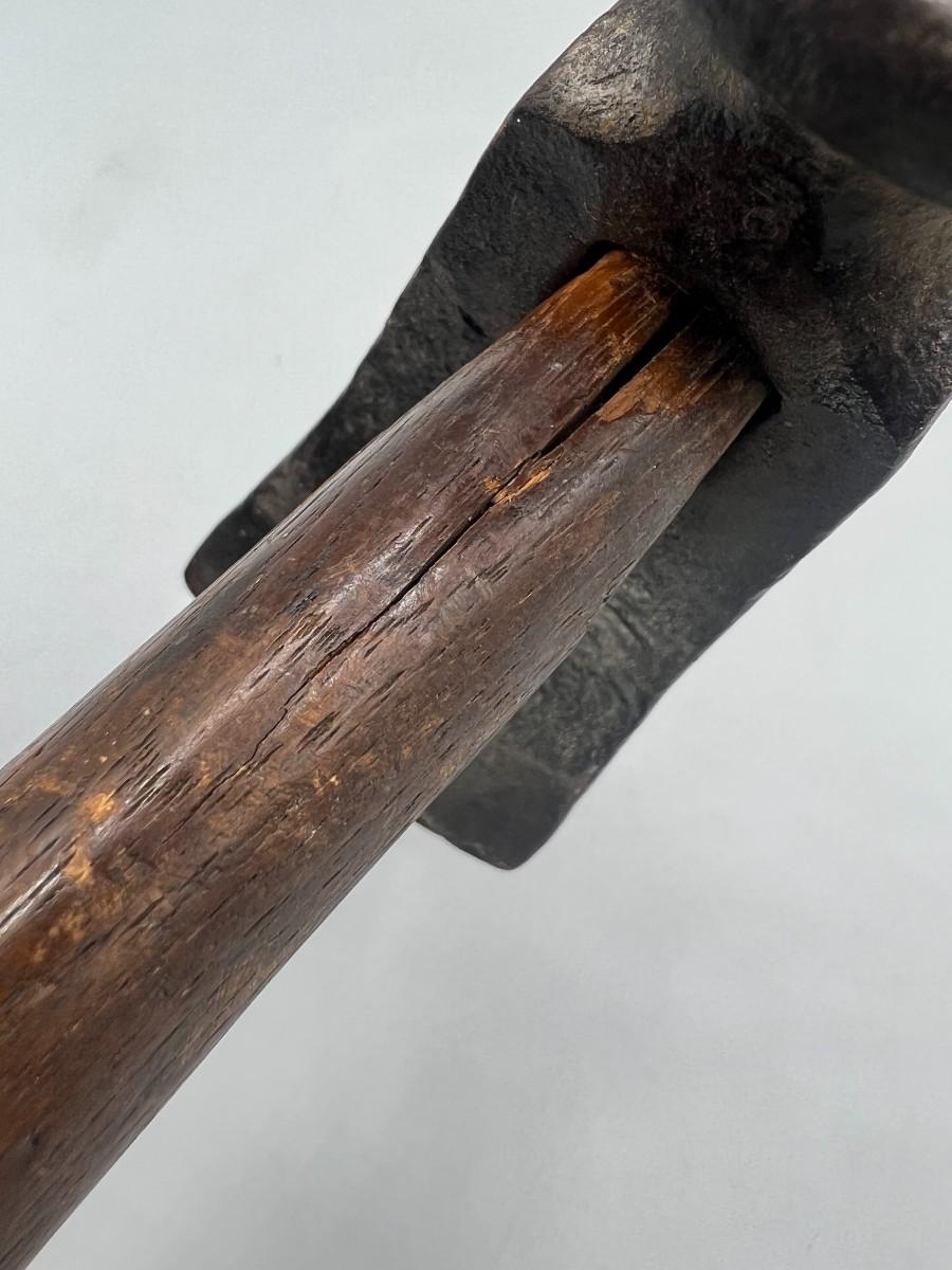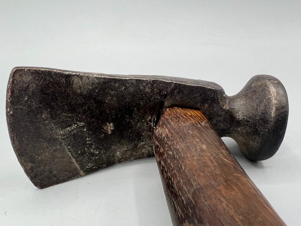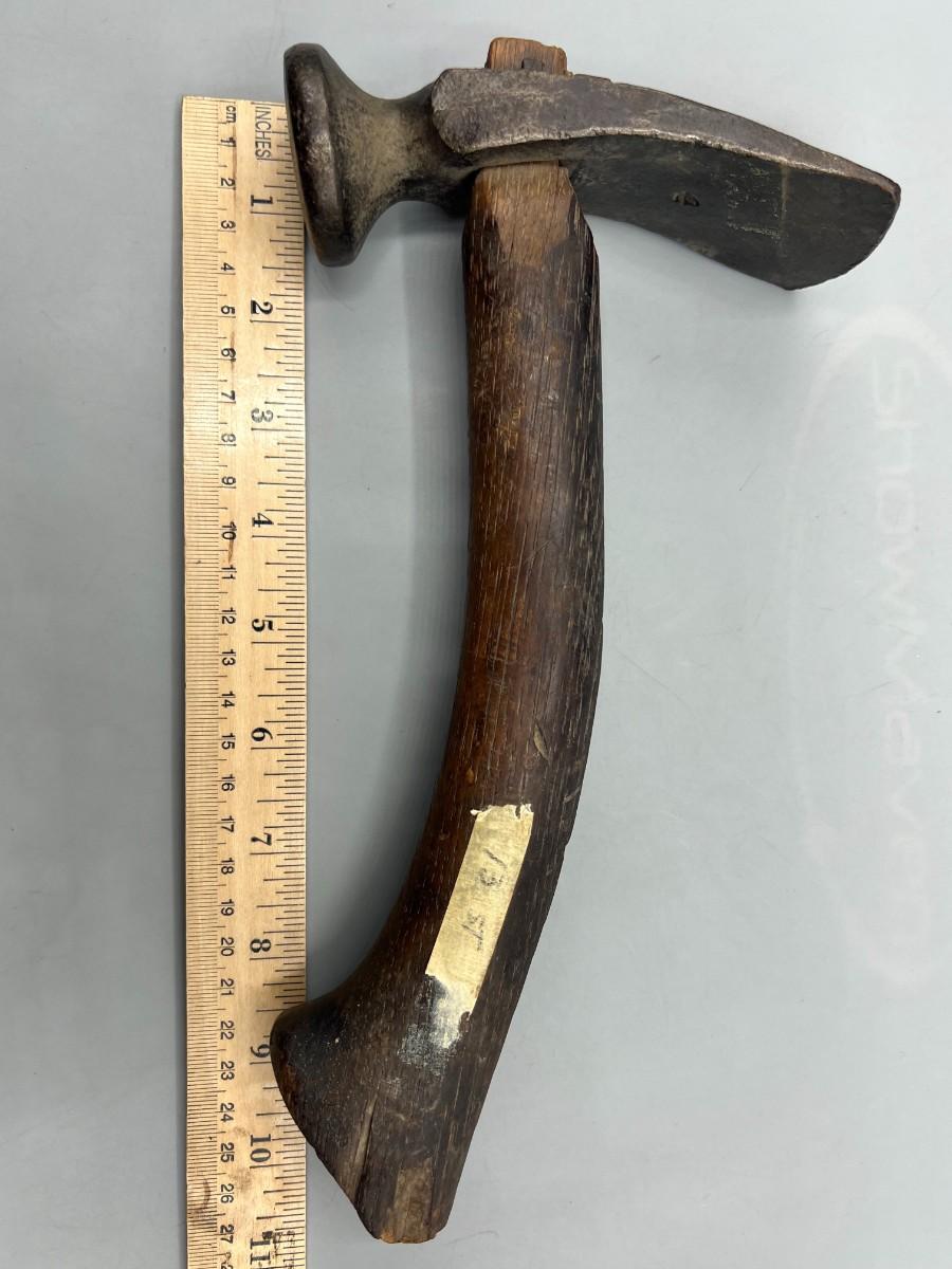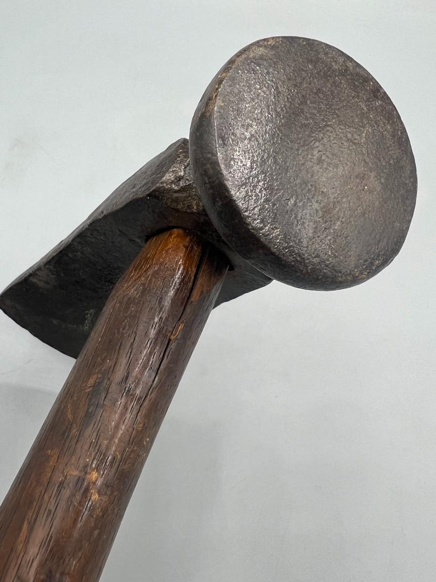 There is antique wear all around the hammer, but there is no significant damage and is in overall good collectible or displayable condition.