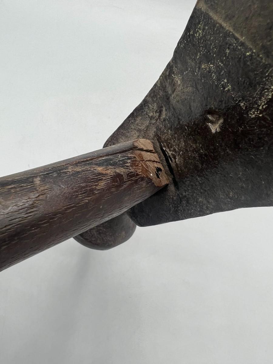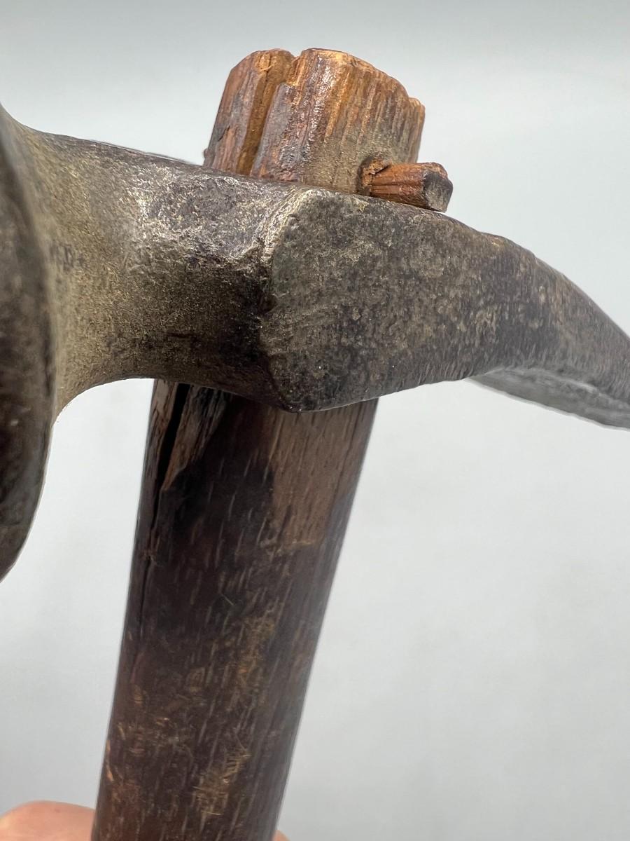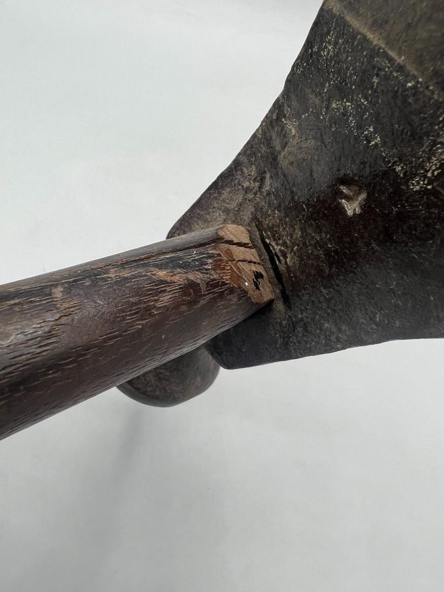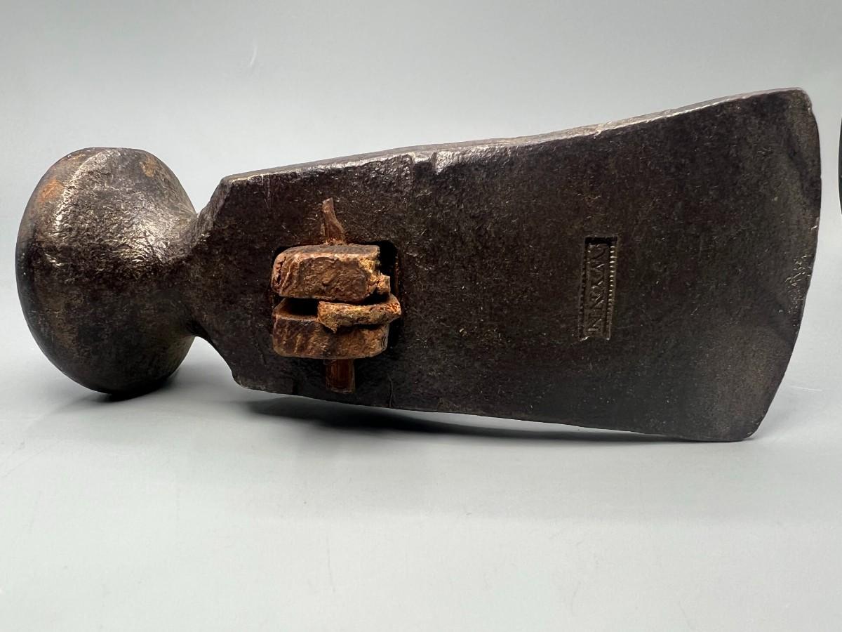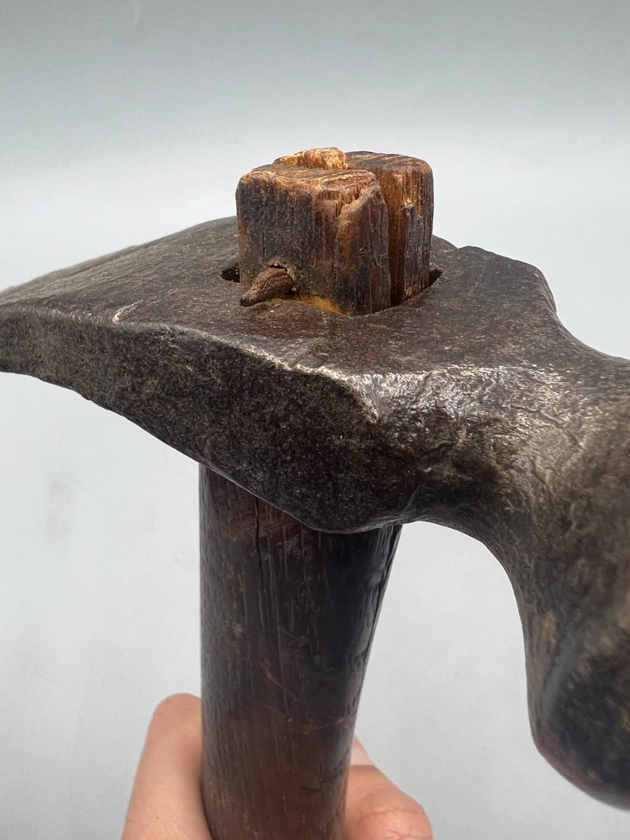 There is antique wear all around the hammer, but there is no significant damage and is in overall good collectible or displayable condition.