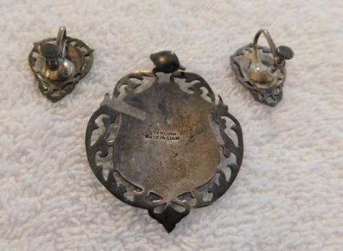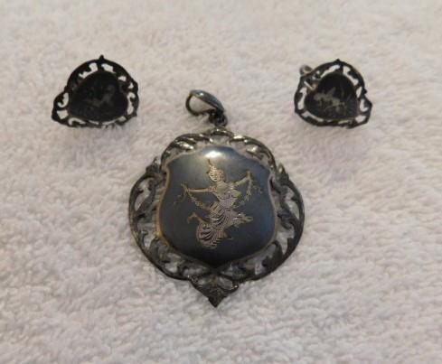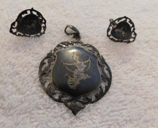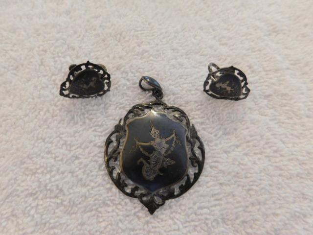 Antique Siam Sterling Silver Niello Goddess 1.6" x 2" Pendant and Earrings