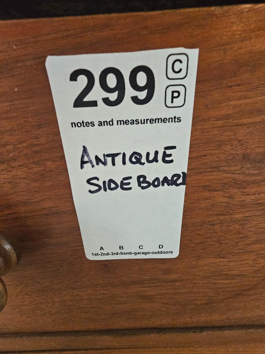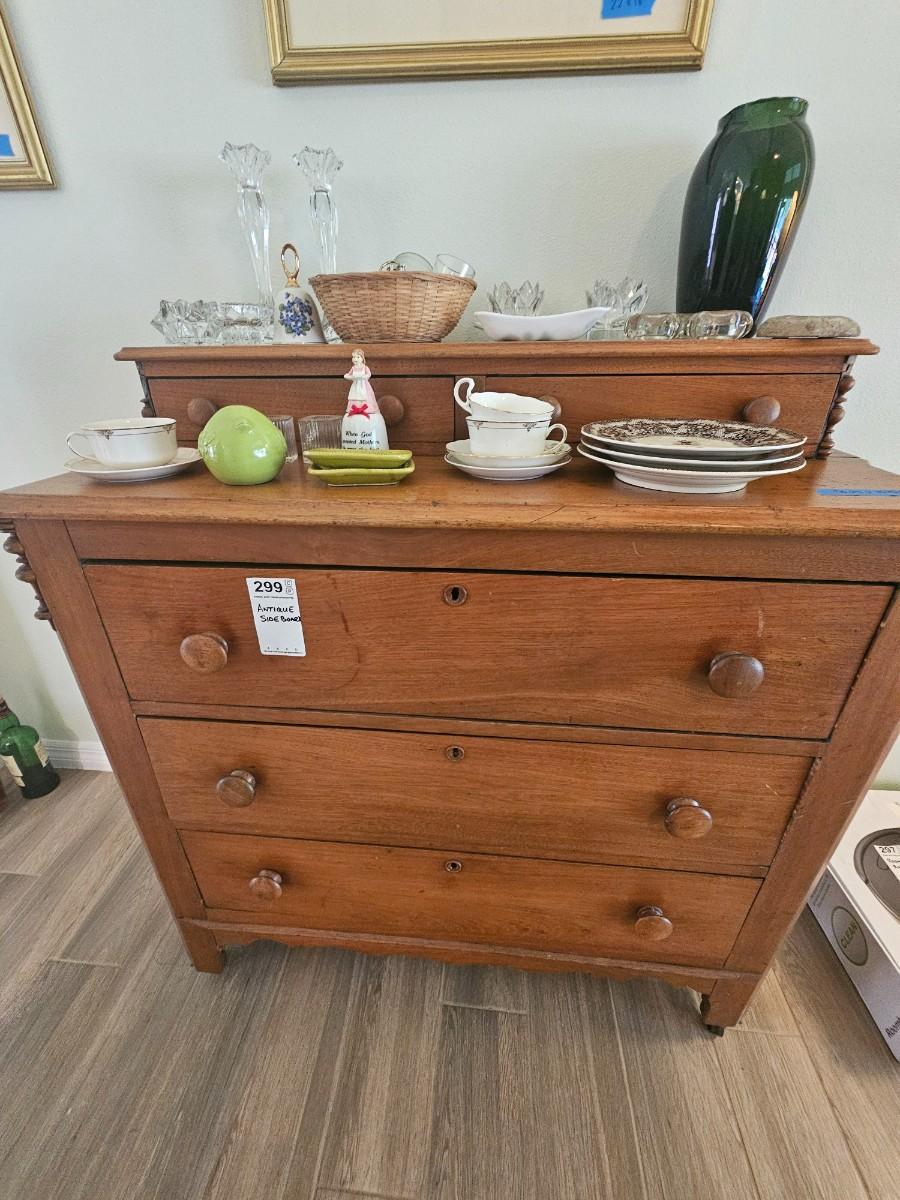 Antique side board with 3 large drawers, 4 small drawers on top, minor scratches due to age of cabinet. Items on top are not included.