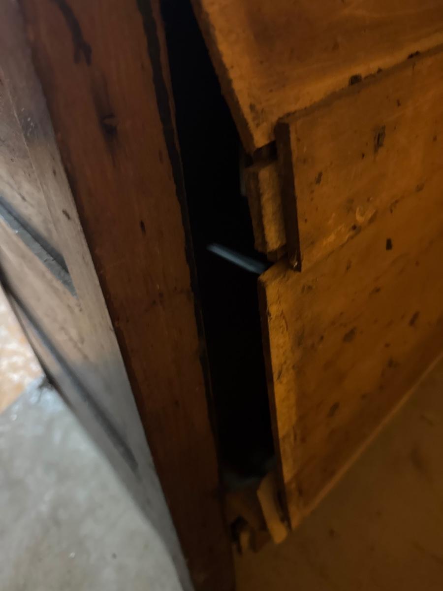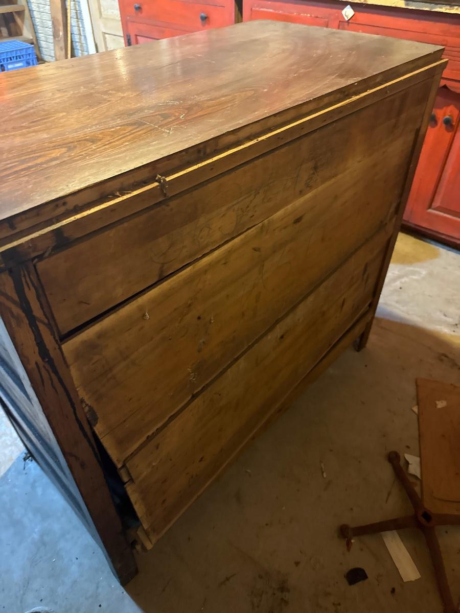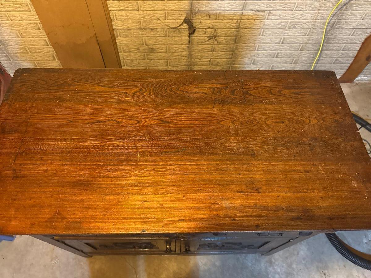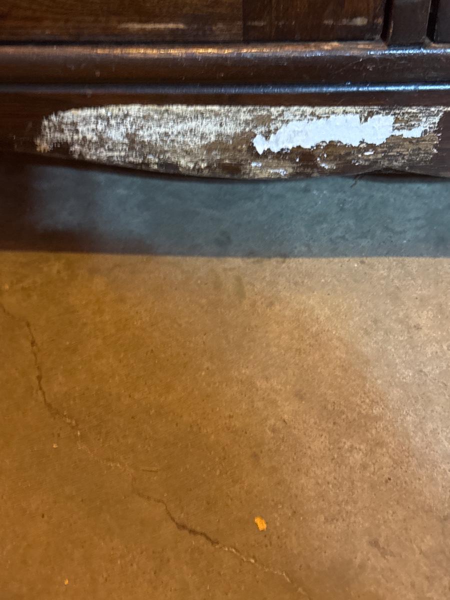 Needs some tlc. The back panel is bowing out. On the front, the bottom ihas been scraped by something. (White color in picture)