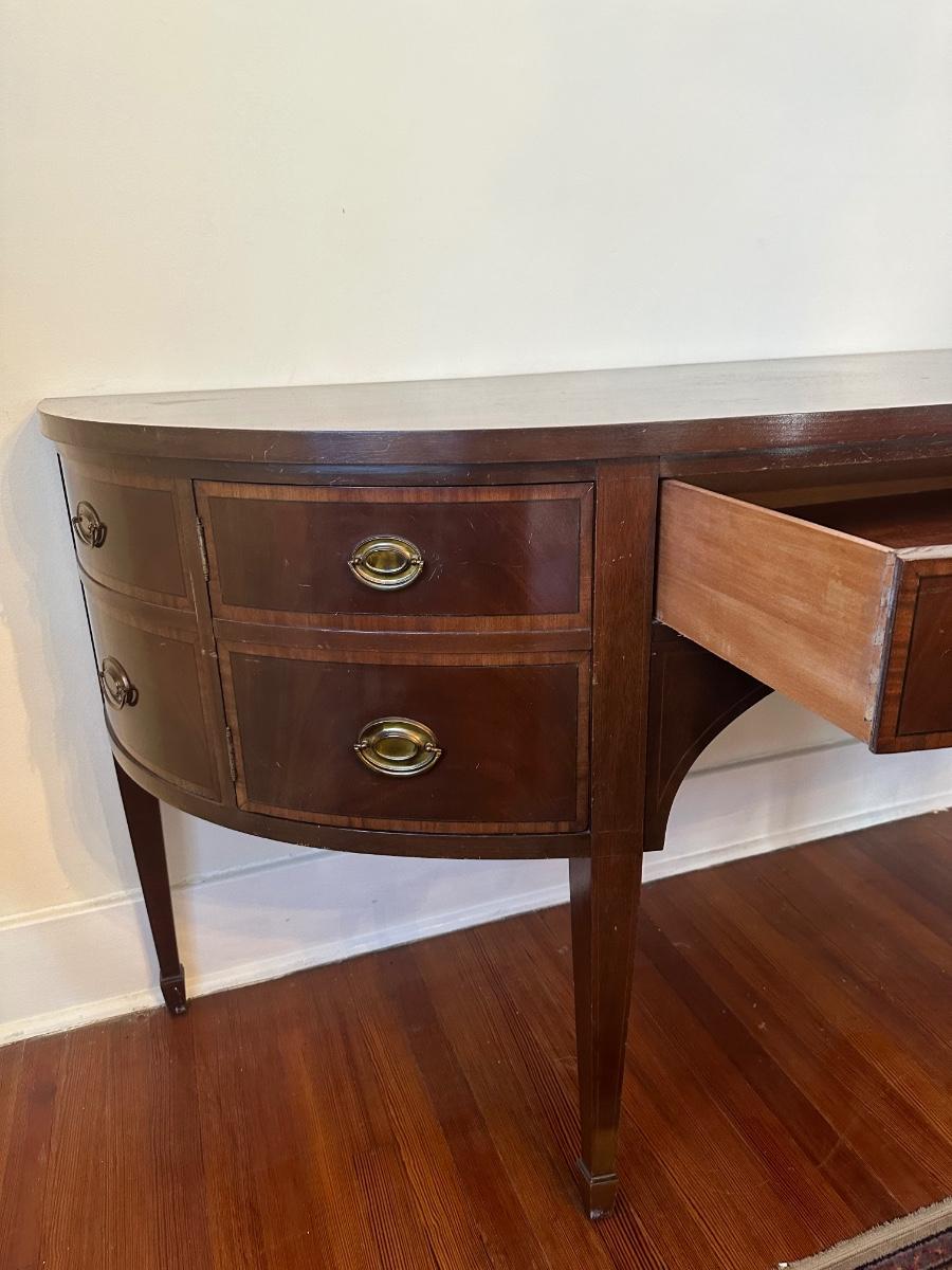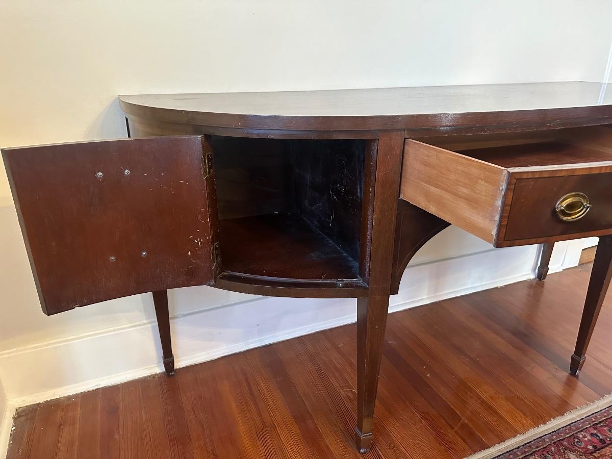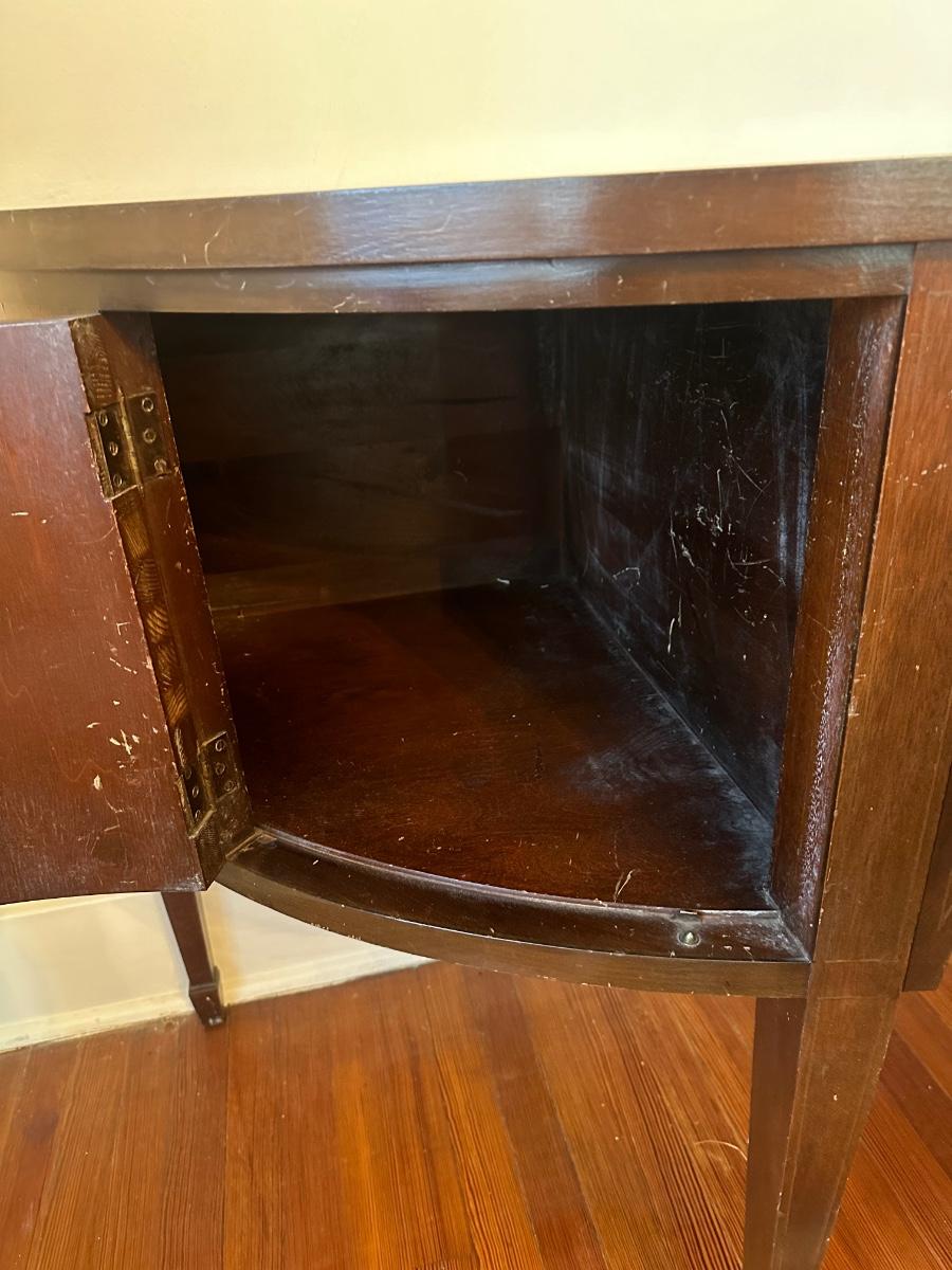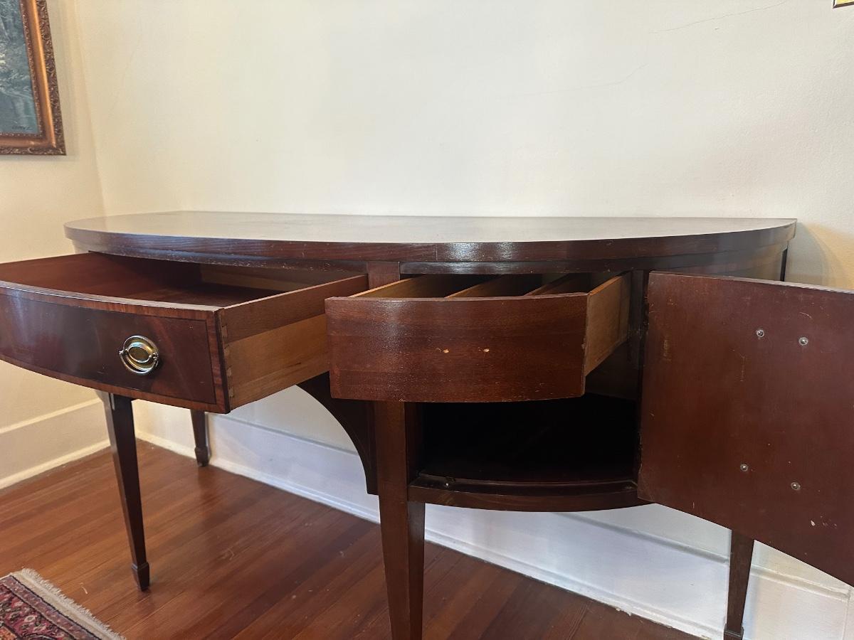 Sideboard with two drawers and two cupboards. One drawer hidden and has dividers. Brass hardware.