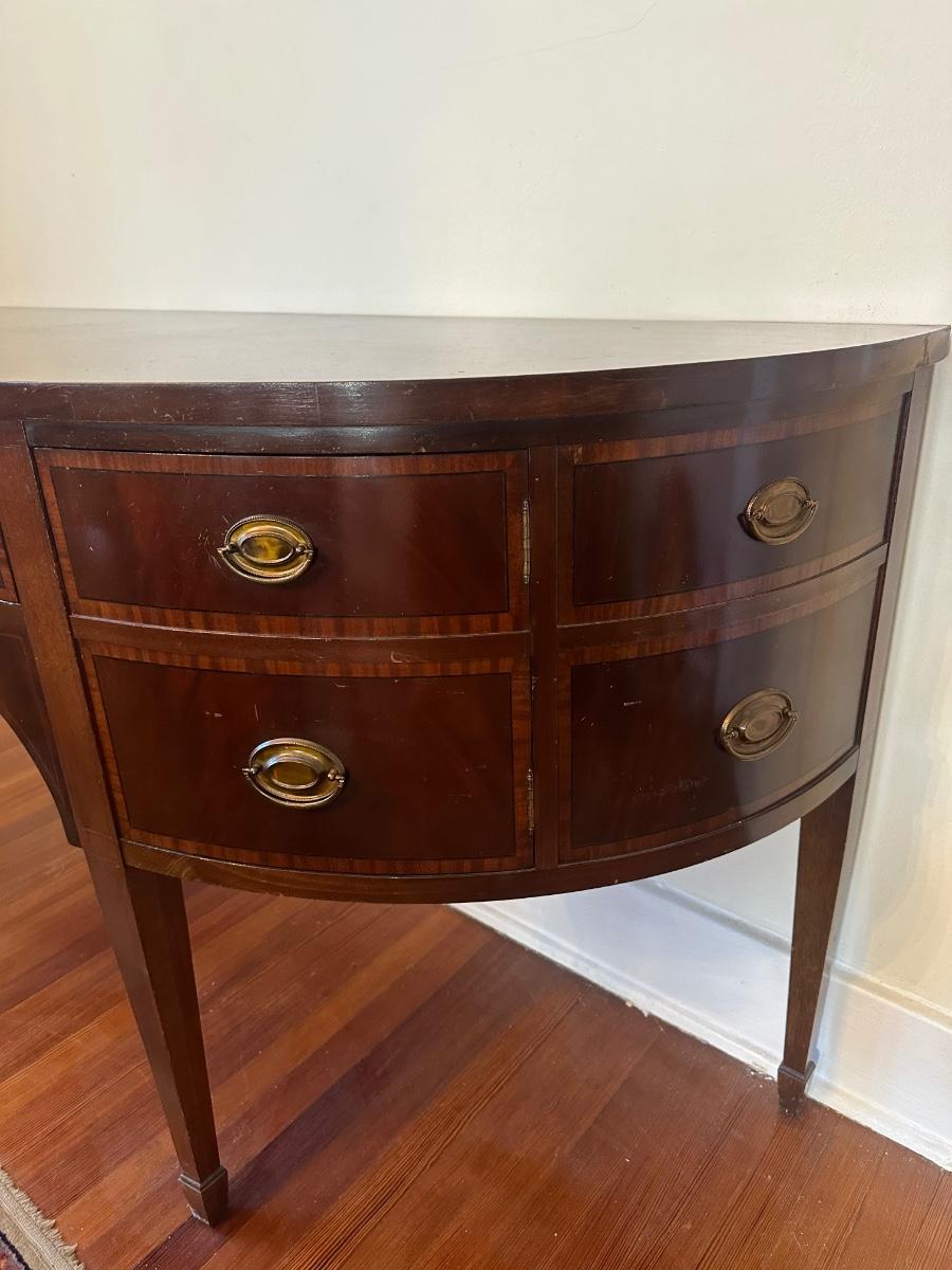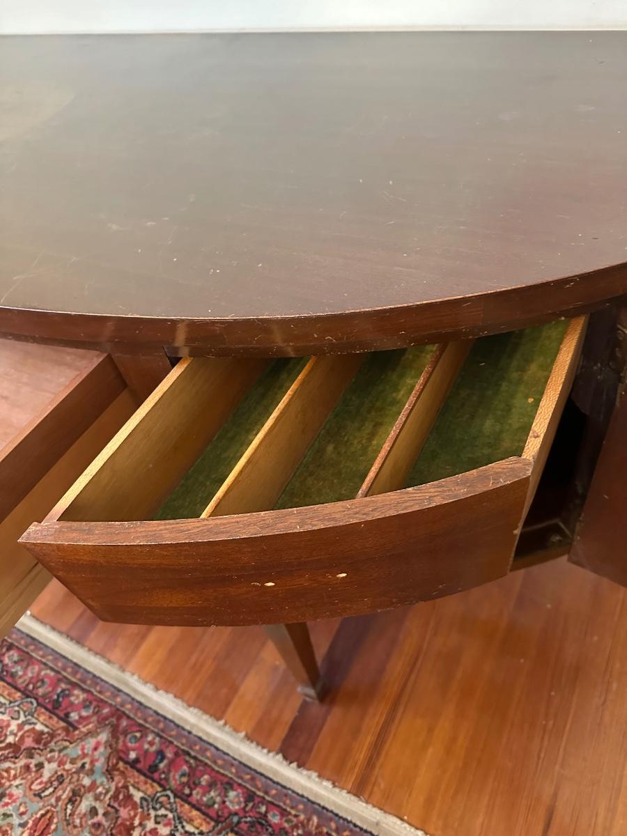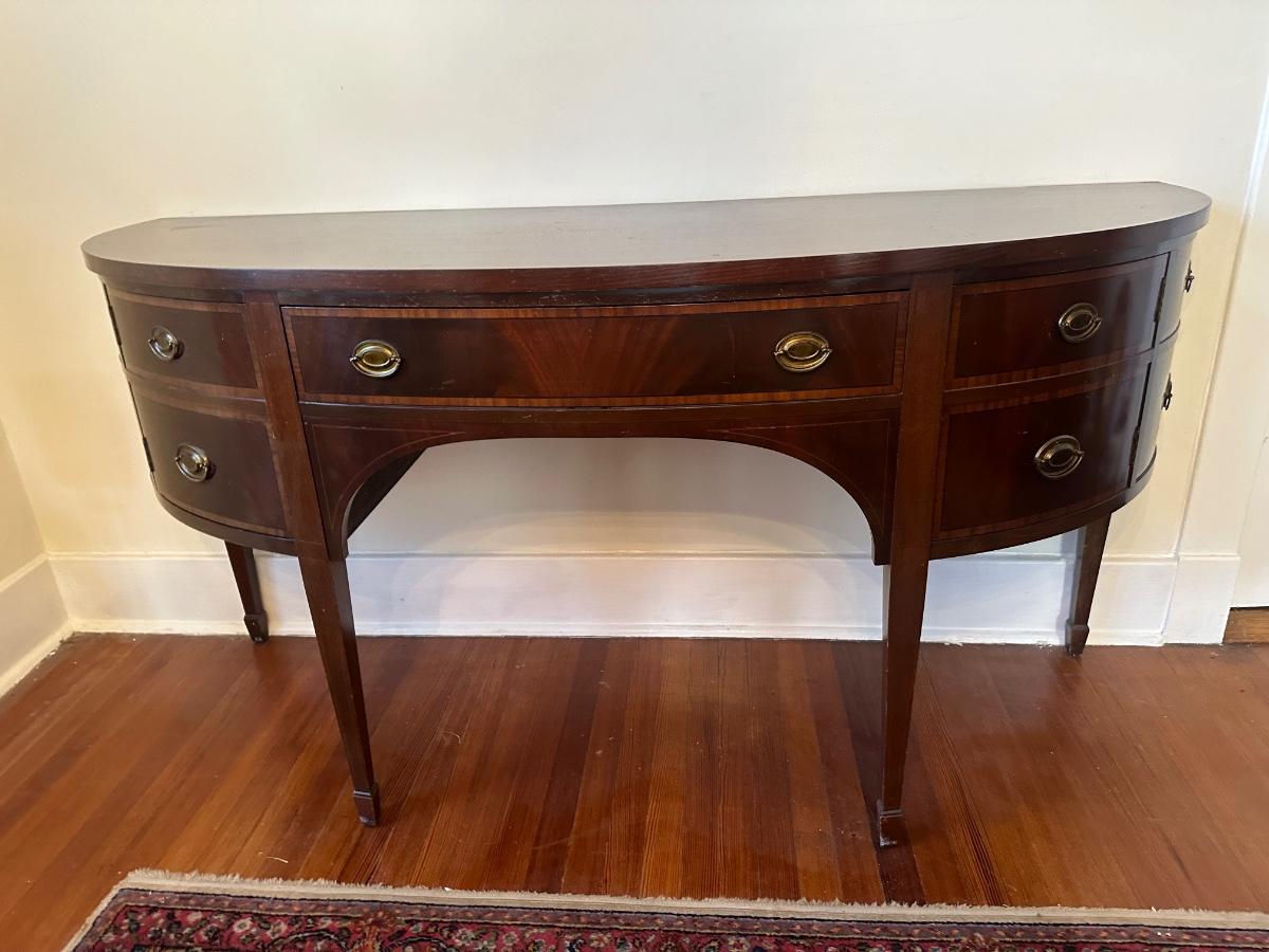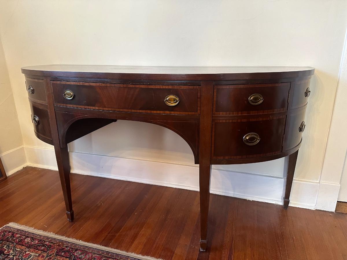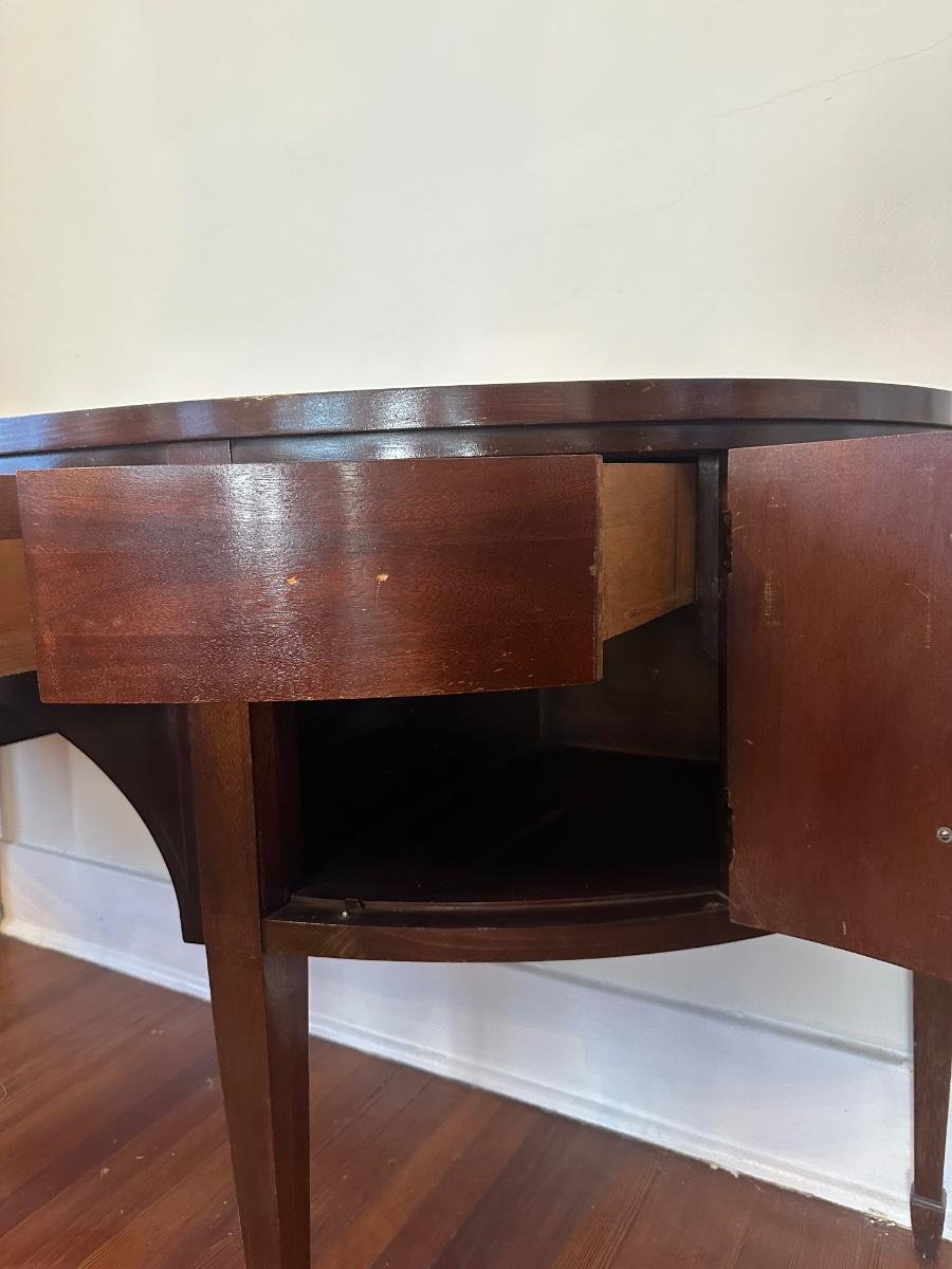 Sideboard with two drawers and two cupboards. One drawer hidden and has dividers. Brass hardware.