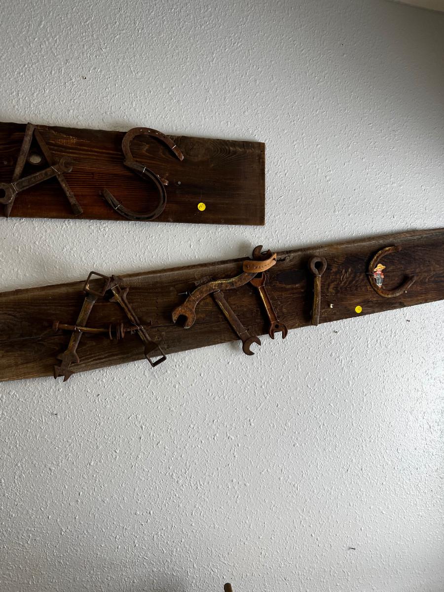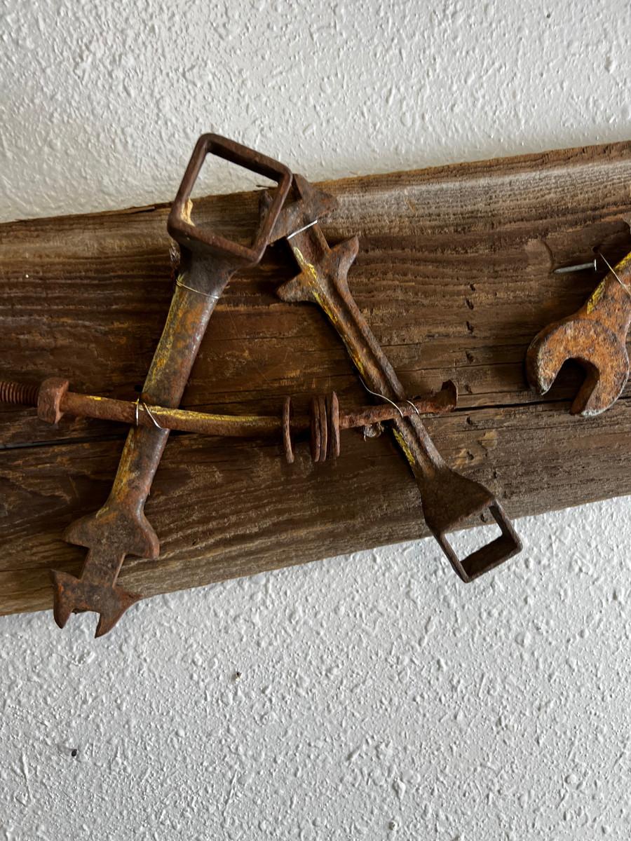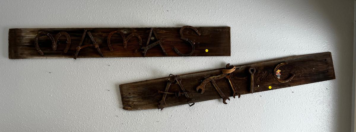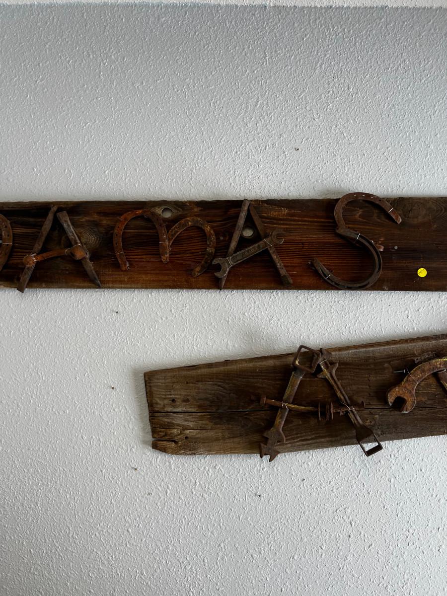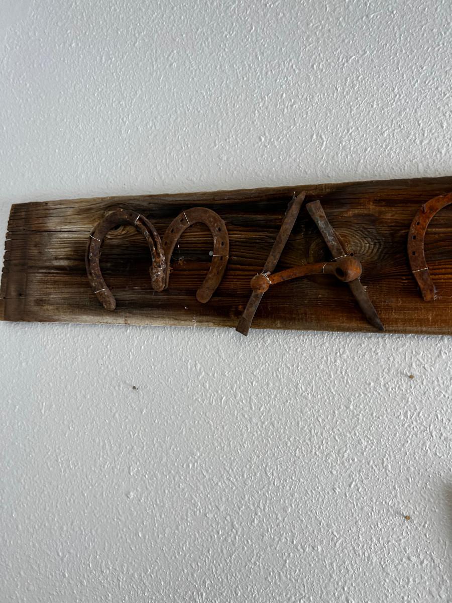 Antique Sign with Rusty Tool and Horse Shoe Lettering of "MAMAS ATTIC"