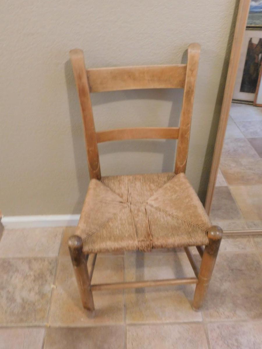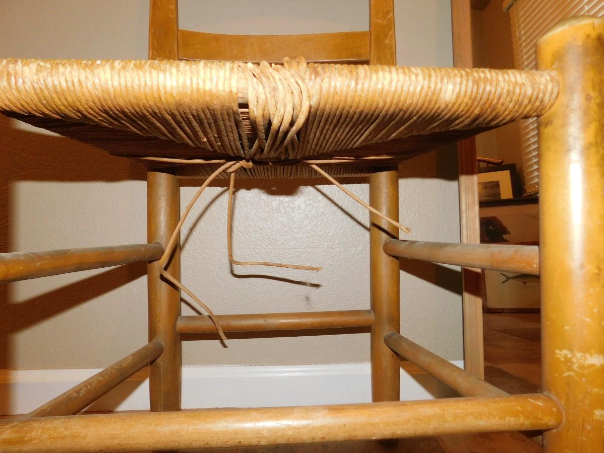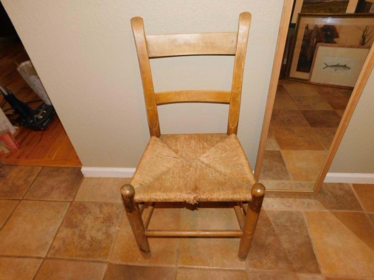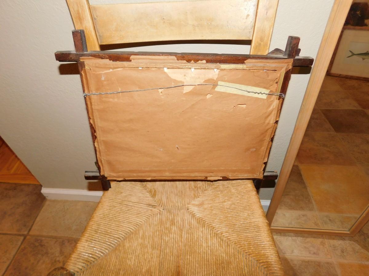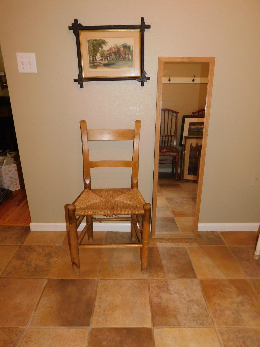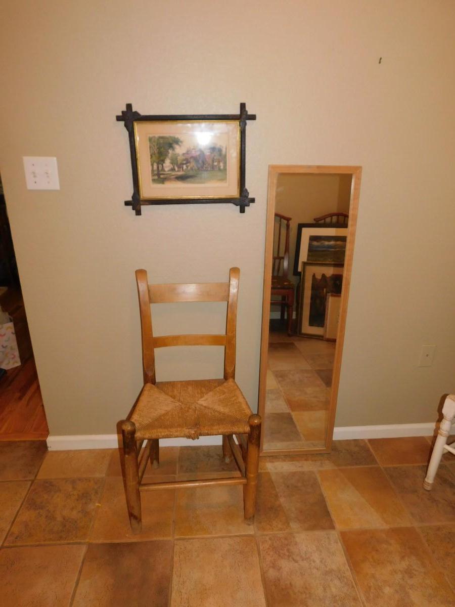 ANTIQUE SIGNED ARTWORK, CHAIR WITH A RUSH SEAT, AND A MIRROR