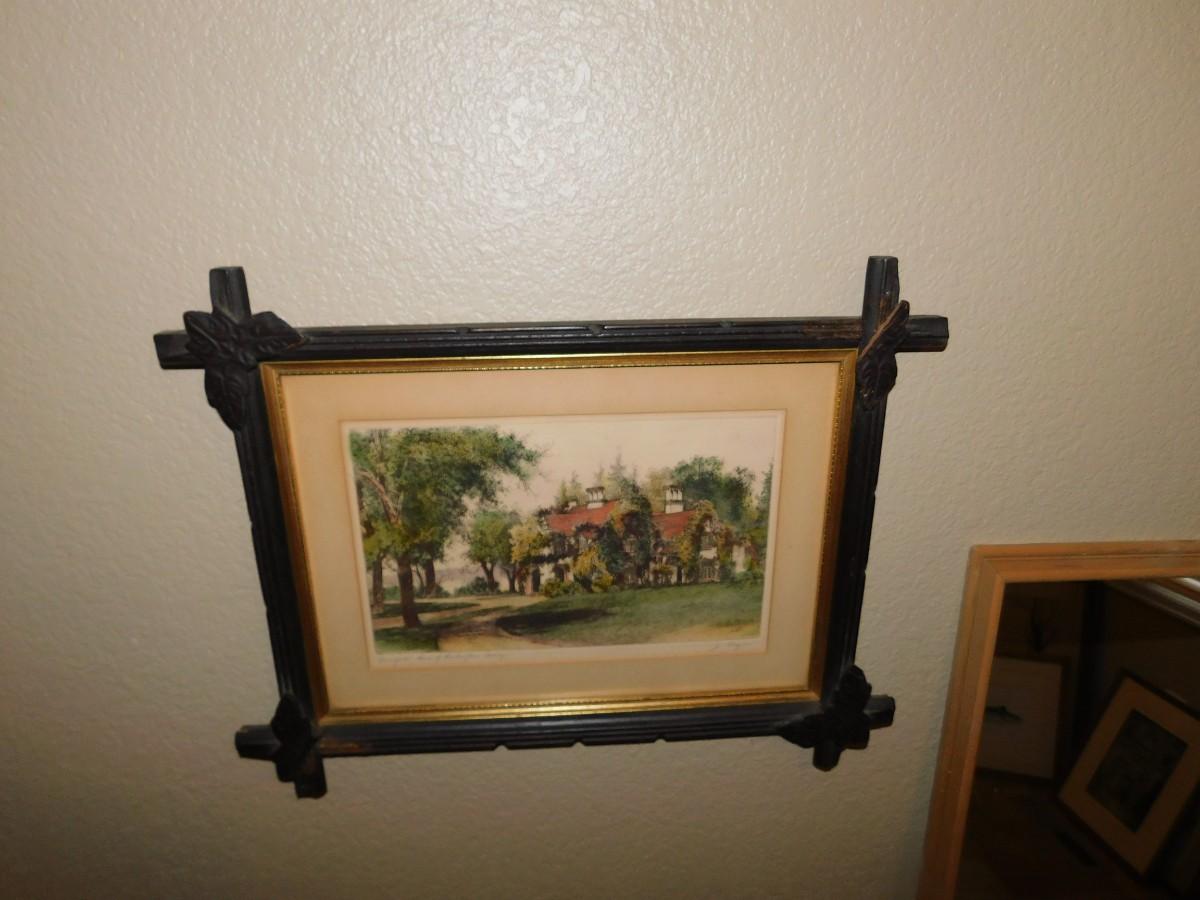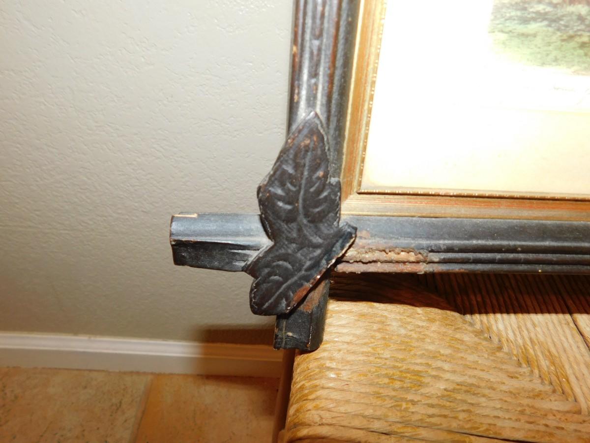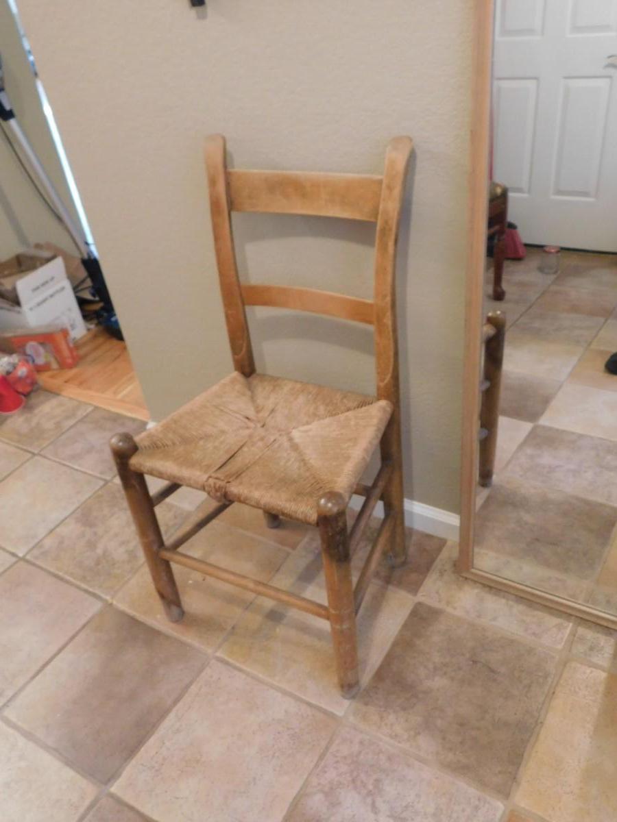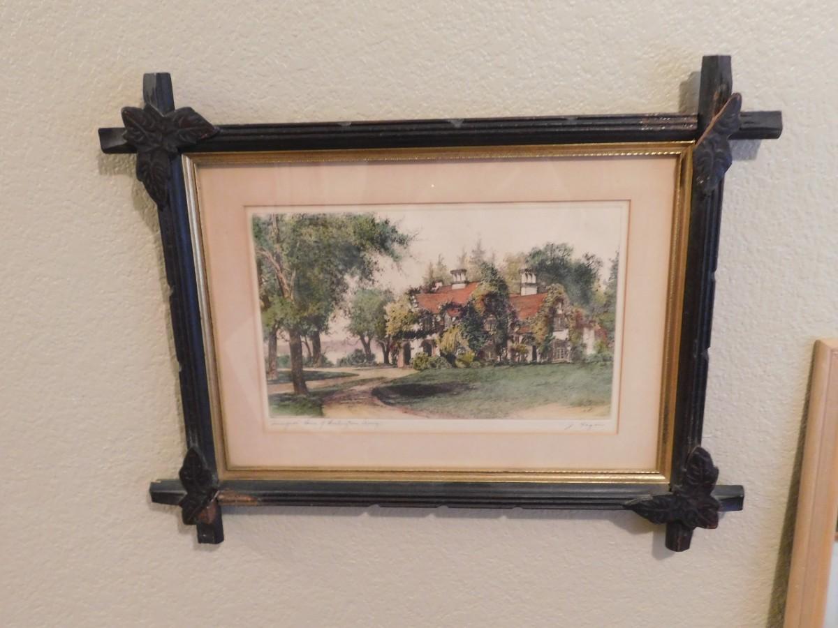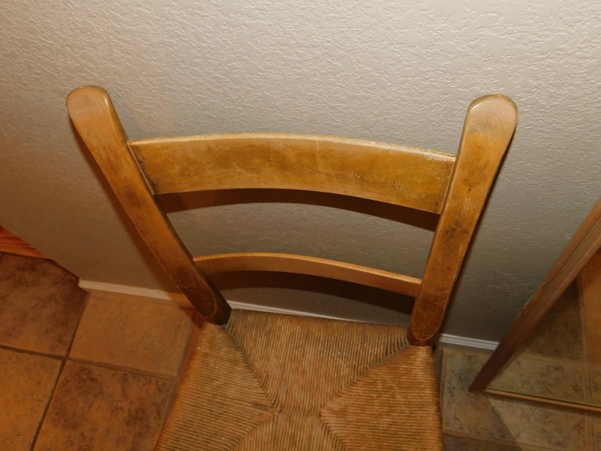 ANTIQUE SIGNED ARTWORK, CHAIR WITH A RUSH SEAT, AND A MIRROR