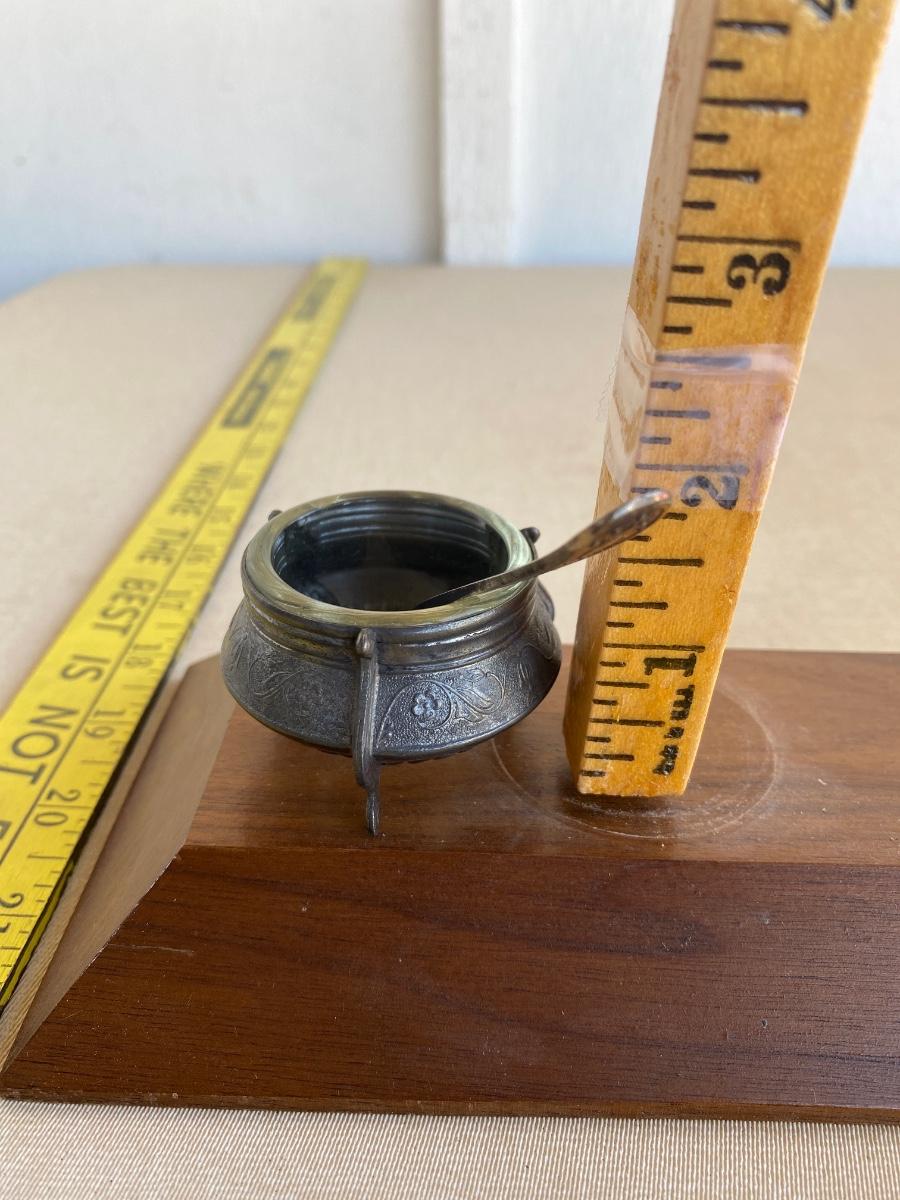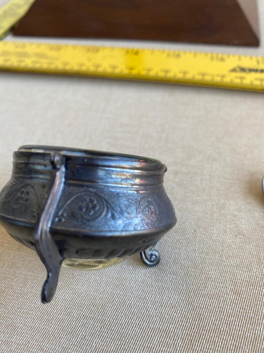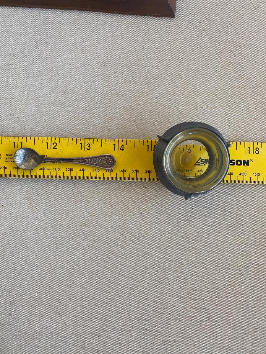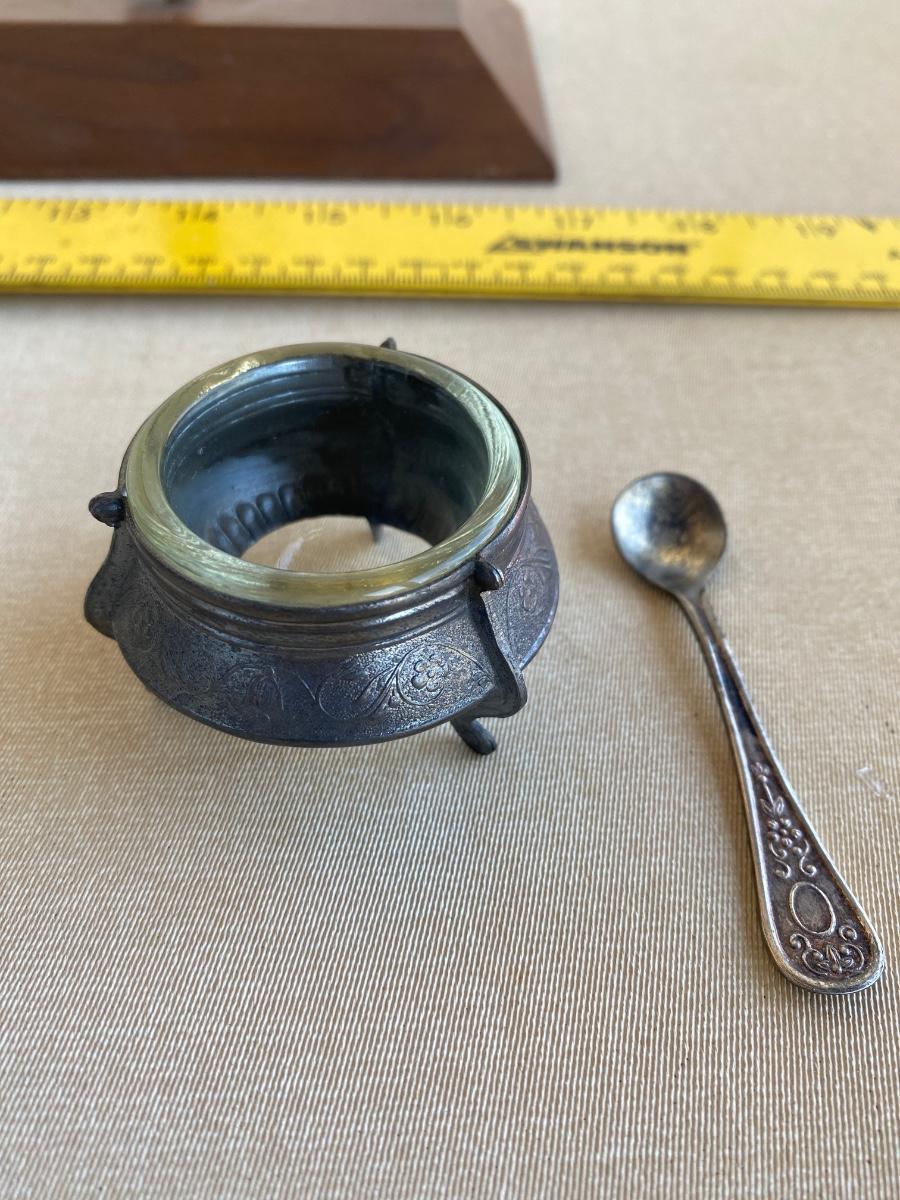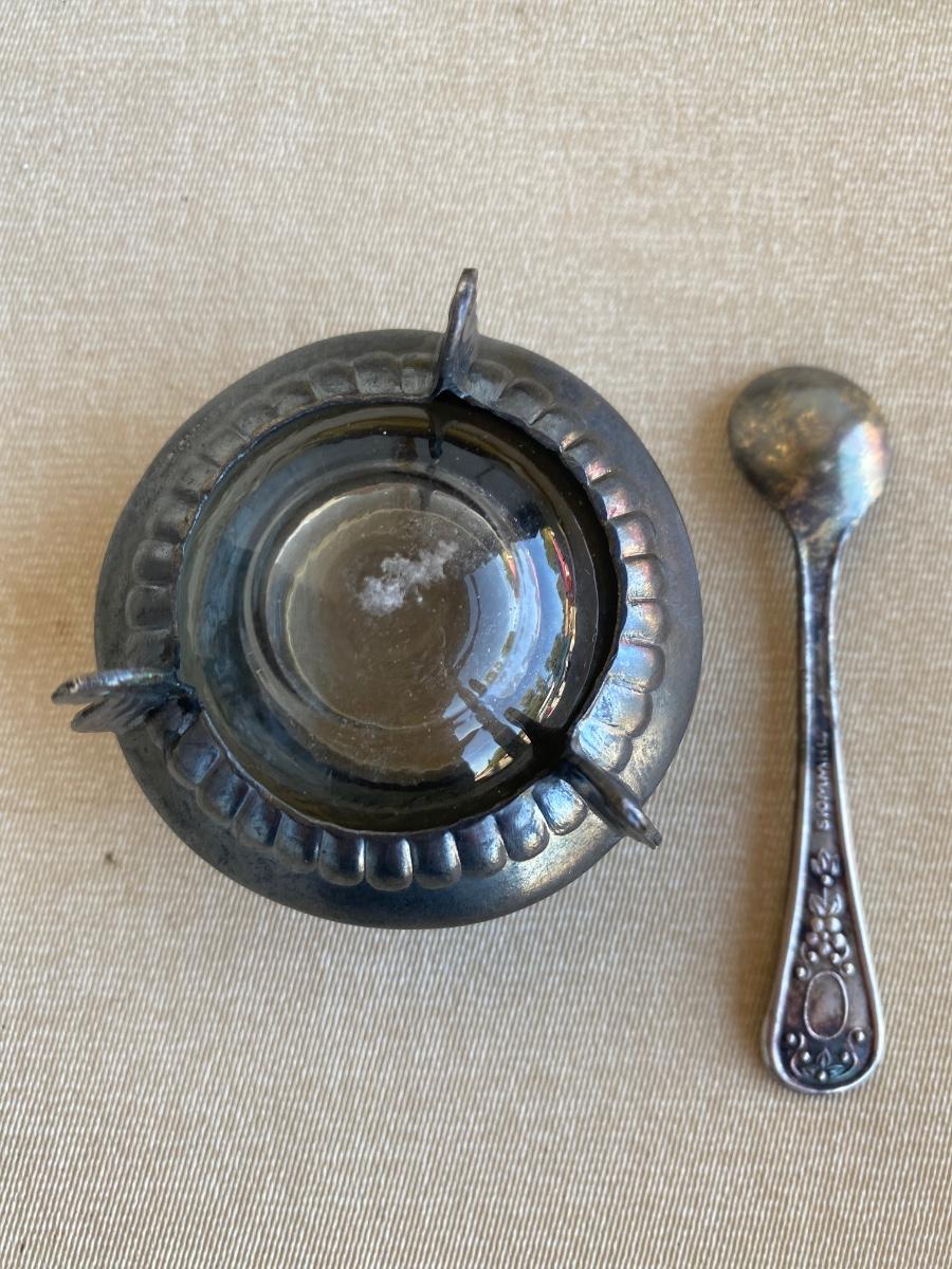 Antique silver and glass salt dish with spoon
