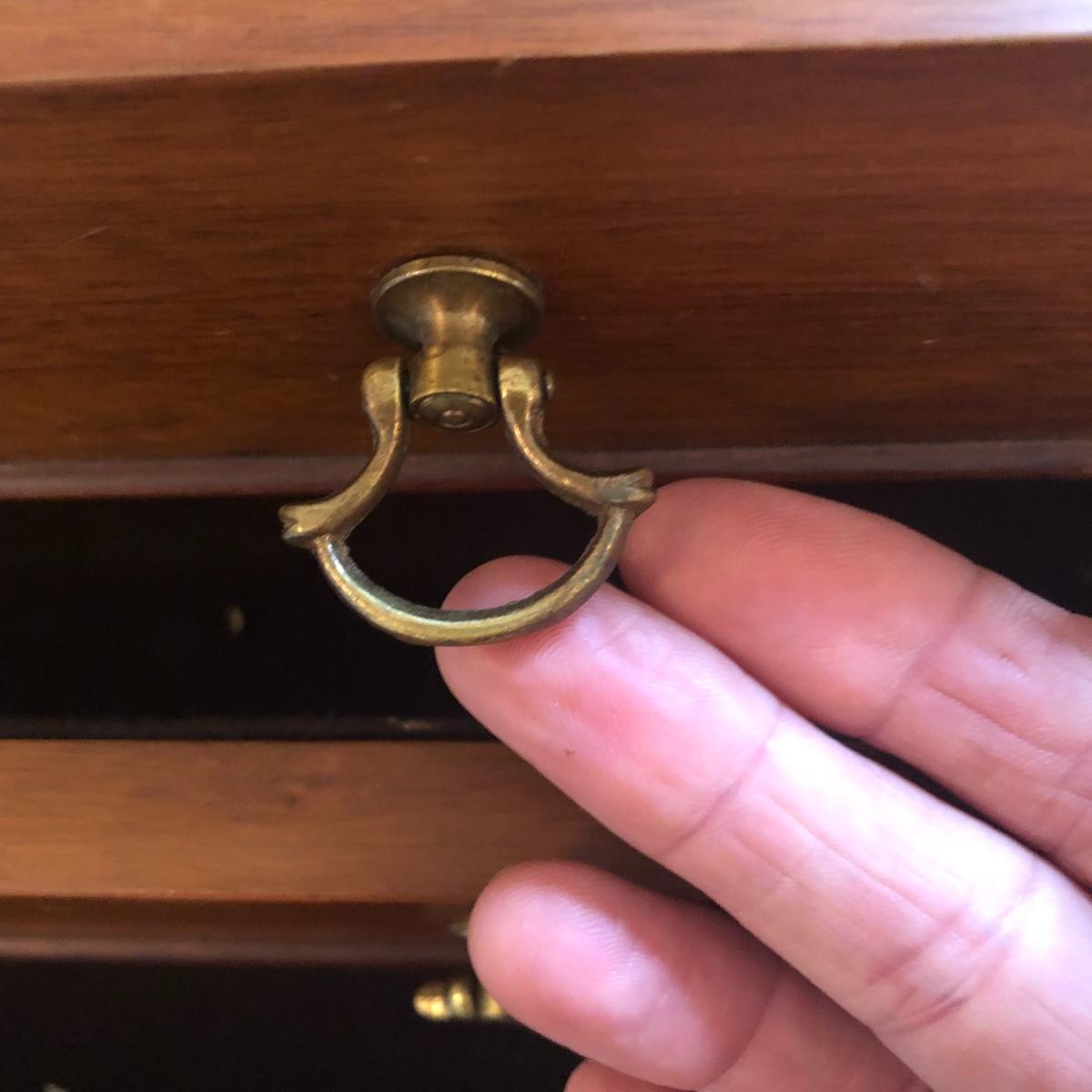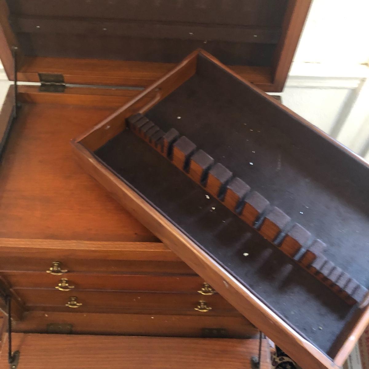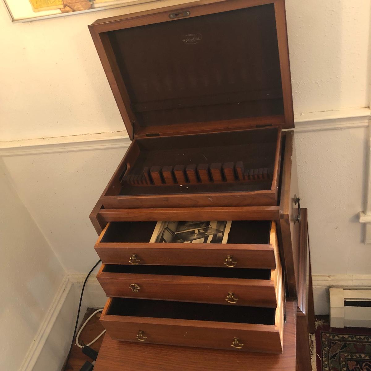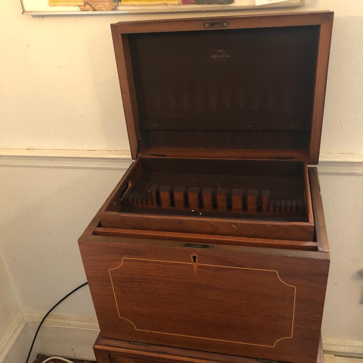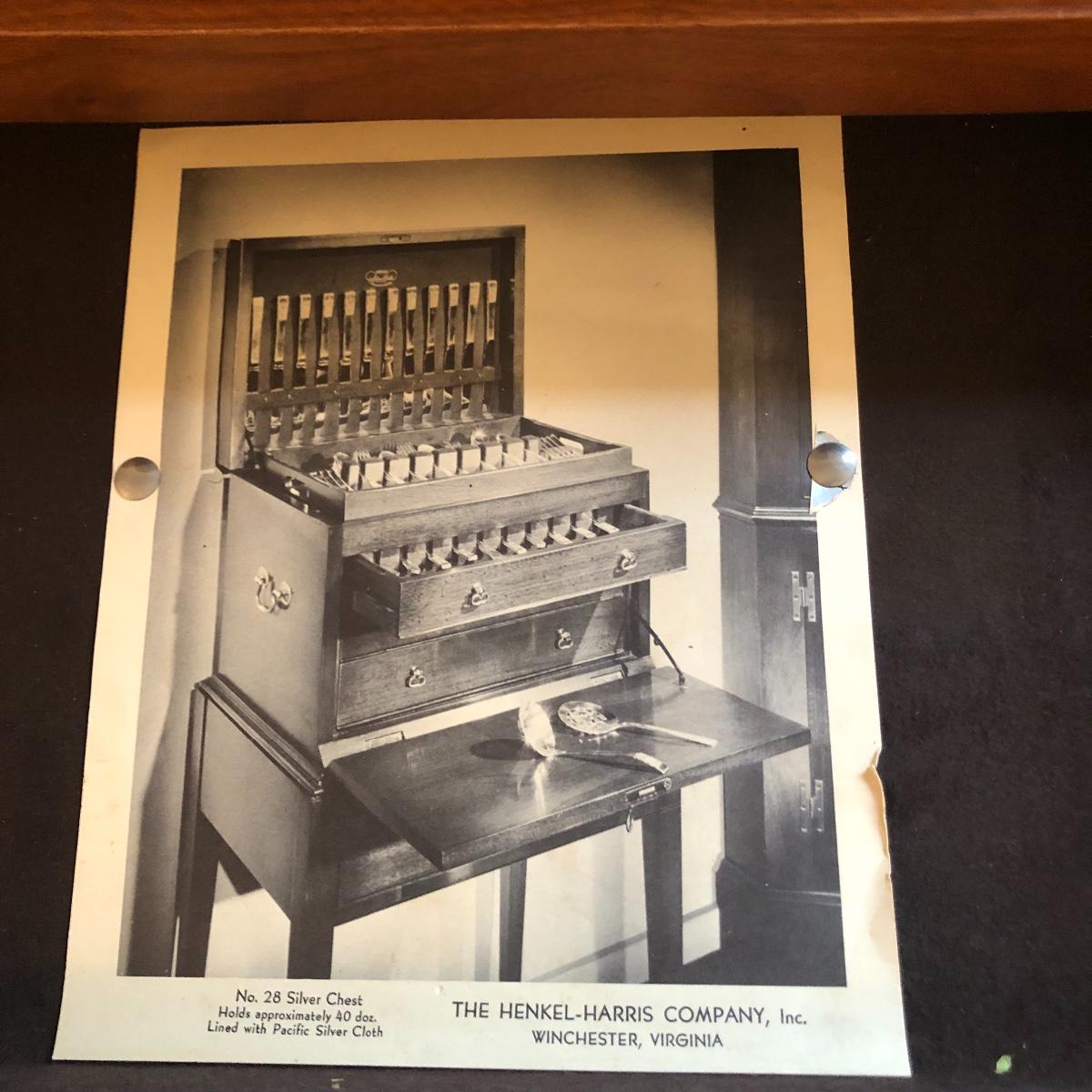 This stunning antique silver chest is in great condition; it’s felt line drawers just need cleaning. Piece has one larger dovetailed drawer in the lower section and three smaller in the upper and brass hardware.