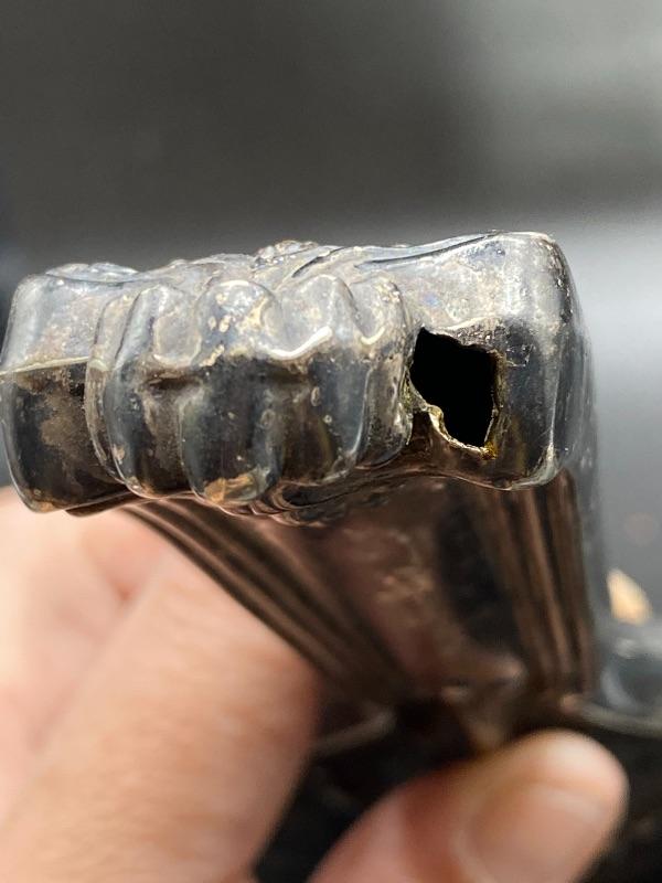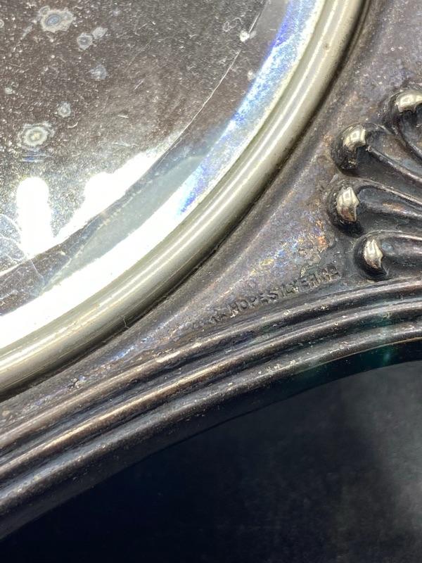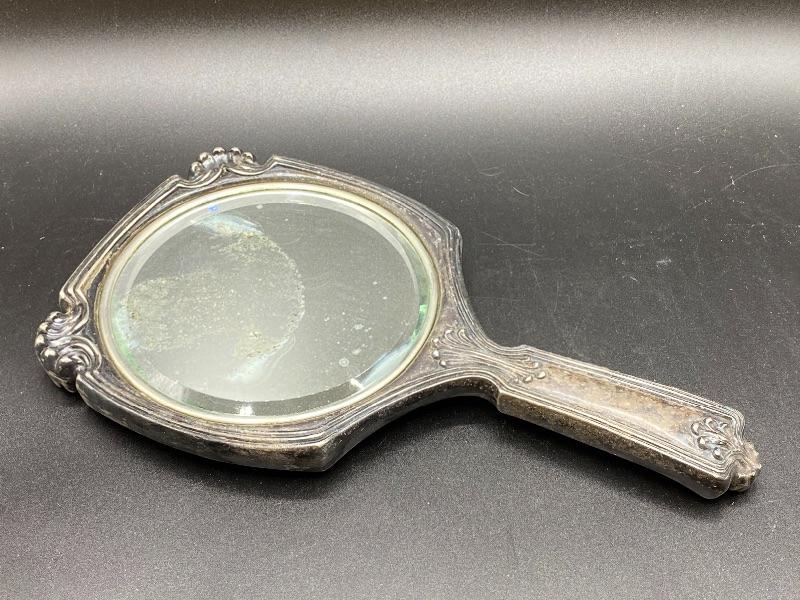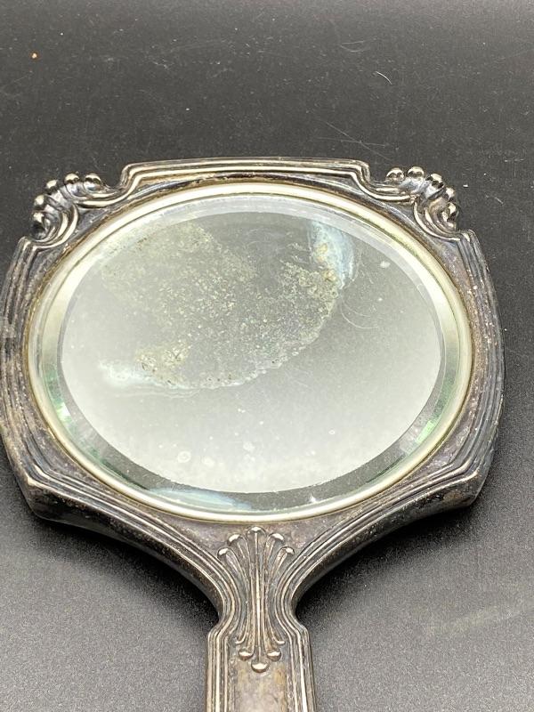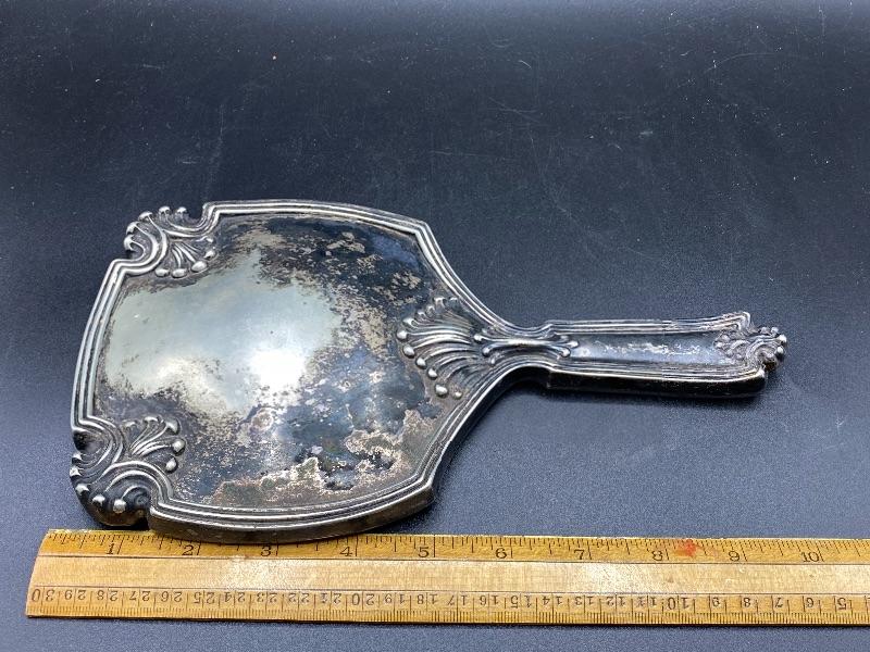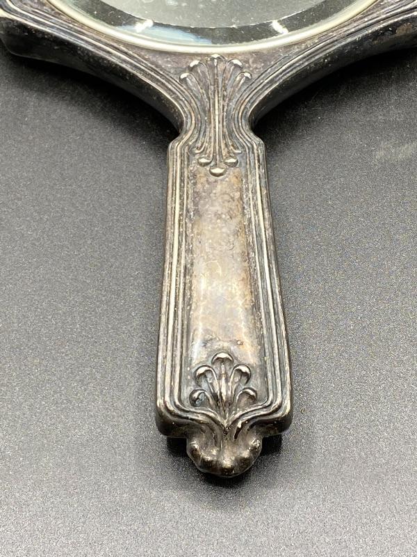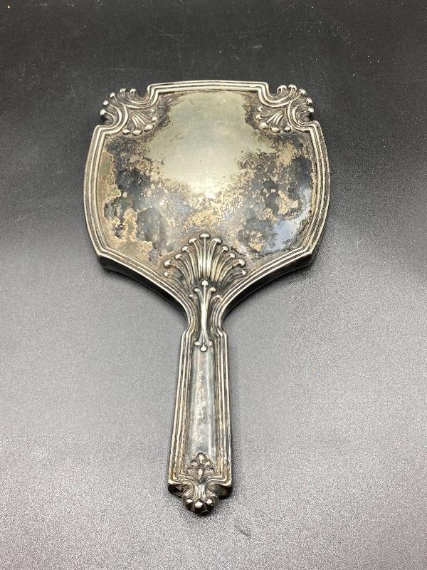 Antique Silver Hand Mirror. Has some damage to the handle end and the mirror itself shows its age. Has a Art Deco/Art Nouveau look about it. There is a company stamp that I can not make out fully. Unsure if it is sterling, but it is hollow so it may be. About 10" length.