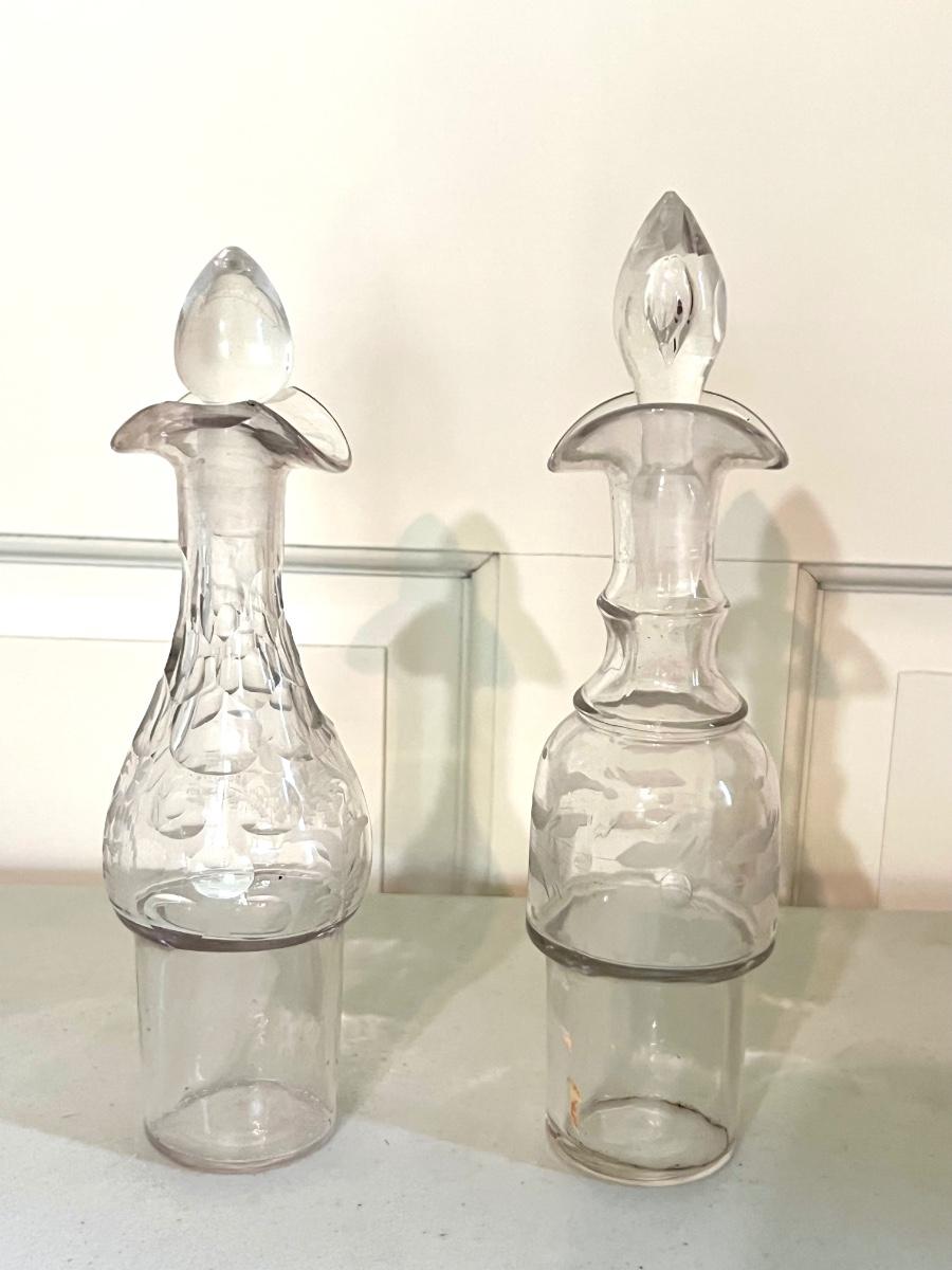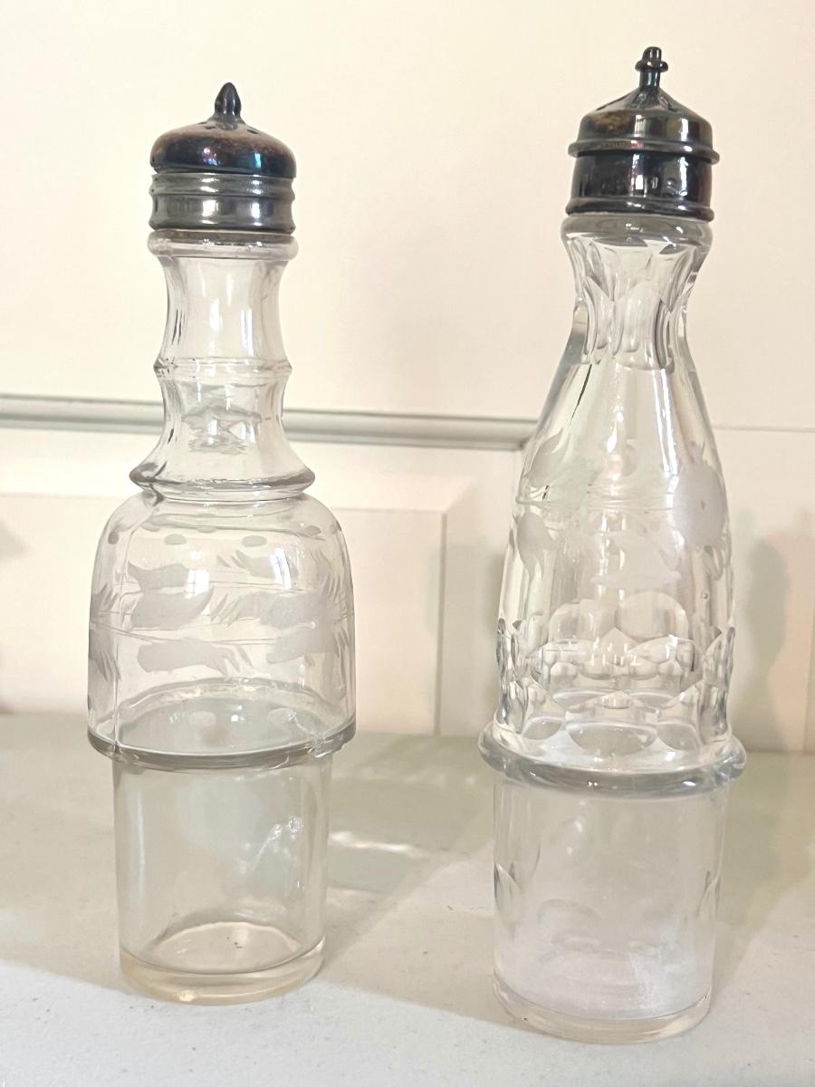 GLASS CRUETS SET. Measures 16 inches tall and approximately 7 inches wide.