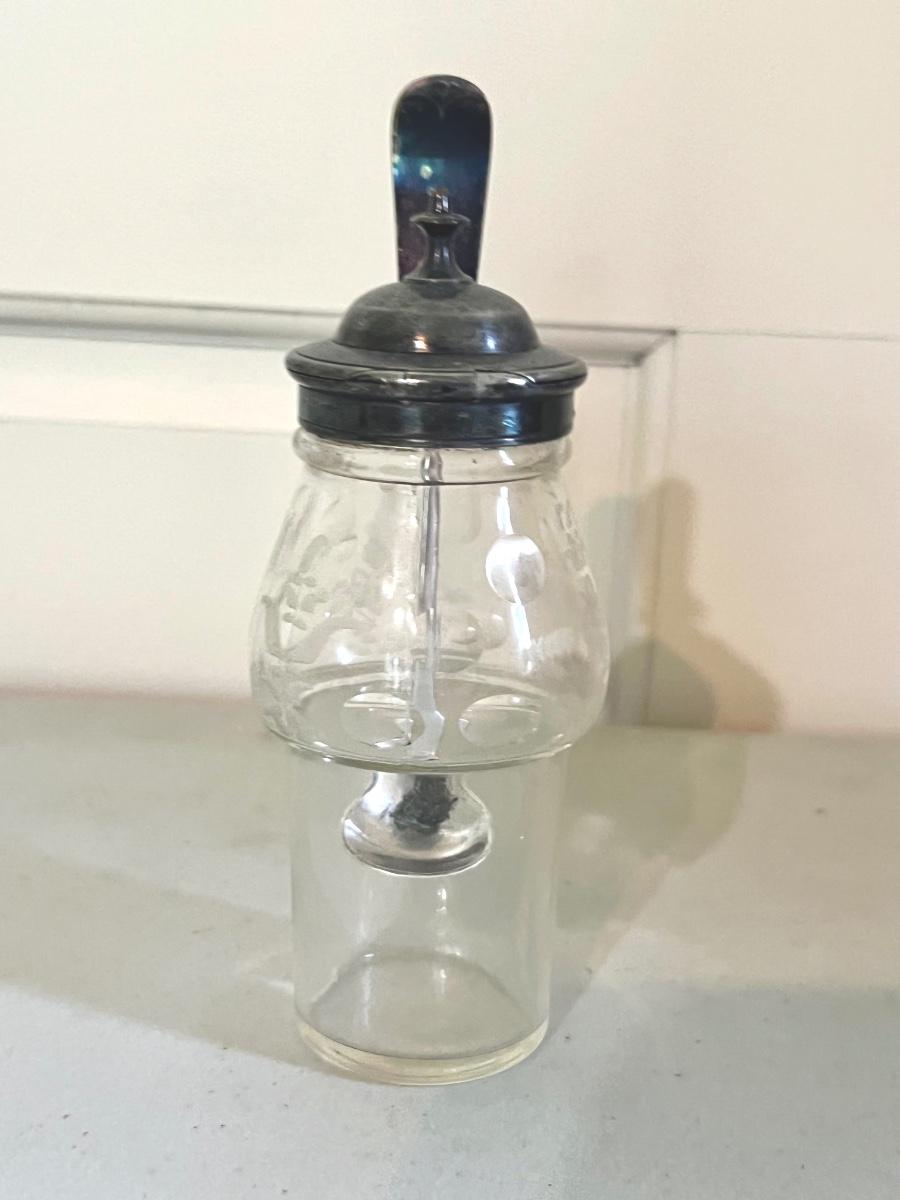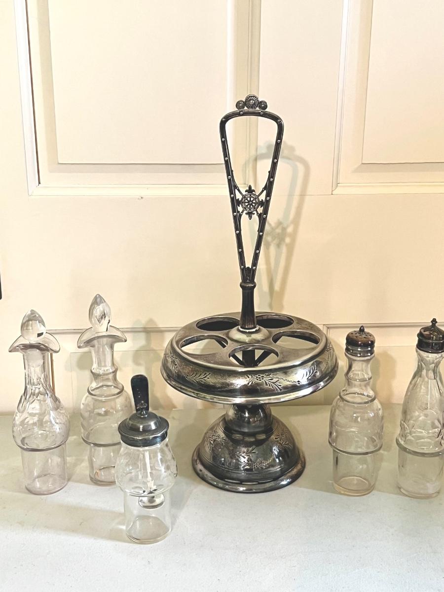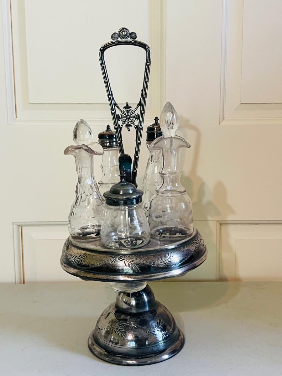 ANTIQUE SILVER PLATE VICTORIAN CONDIMENT CADDY ETCHED GLASS CRUETS SET