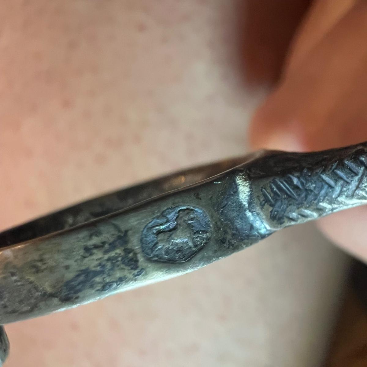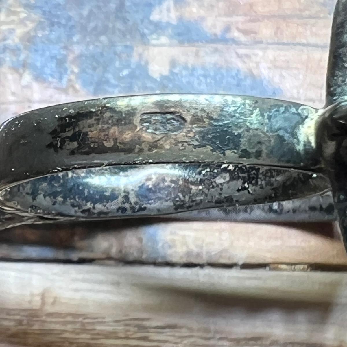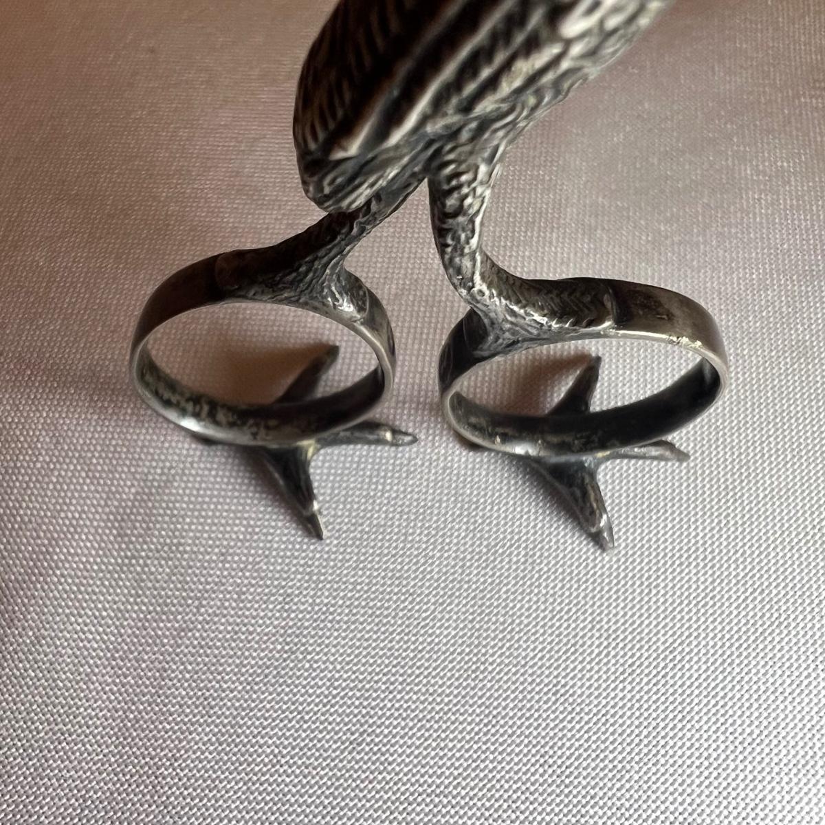 This unique piece is a rare find. Appears to be 925 but the mark is very worn. It also has a lion symbol which likely tells its age and origin. The eye is a ruby colored stone and the bird has a snake in its beak. .