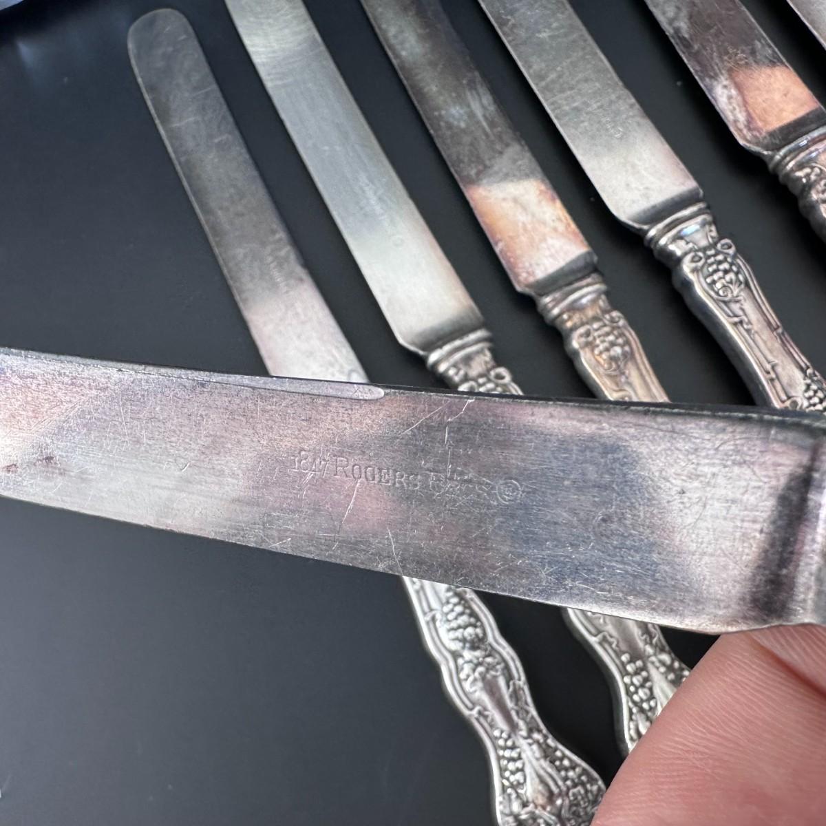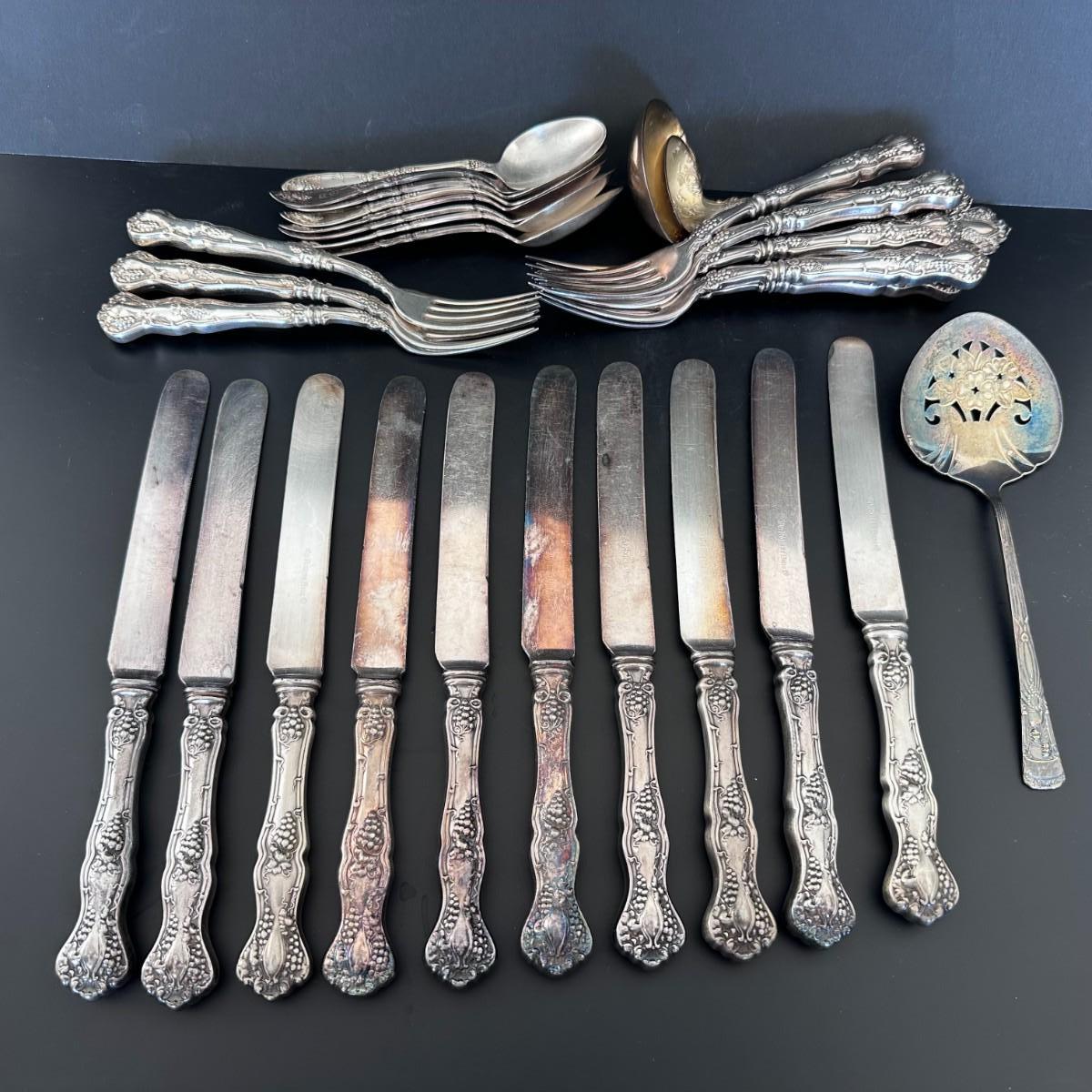 A set of International 1847 Rogers silverplate flatware, specifically the "Vintage" pattern, including knives, forks, and spoons. This flatware was produced by the International Silver Company under the Rogers brand, dating back to 1847. The "Vintage" pattern, also known as "Grape," features a grape and vine design, which is evident on the handles of the pieces. 29 pieces total.