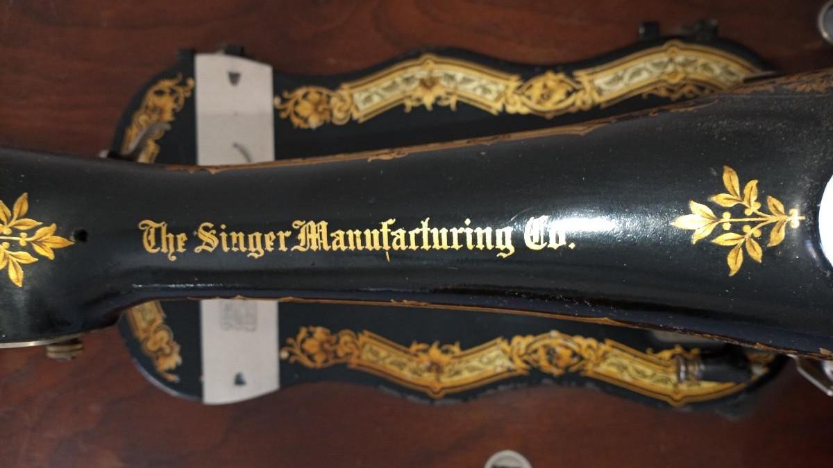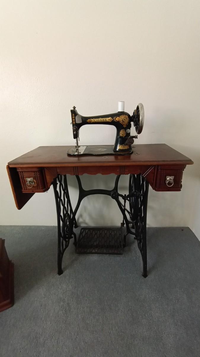 ANTIQUE SINGER SEWING MACHINE VERY NICE AND COMPLETEMEASURES APPROX, 16X34 LONG WITH 10" MORE WITH DROP LEAF UP