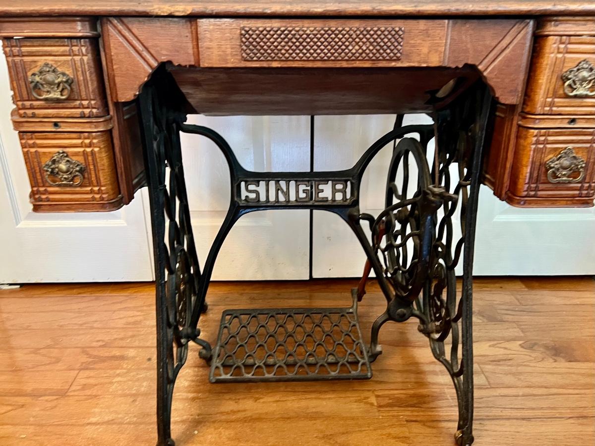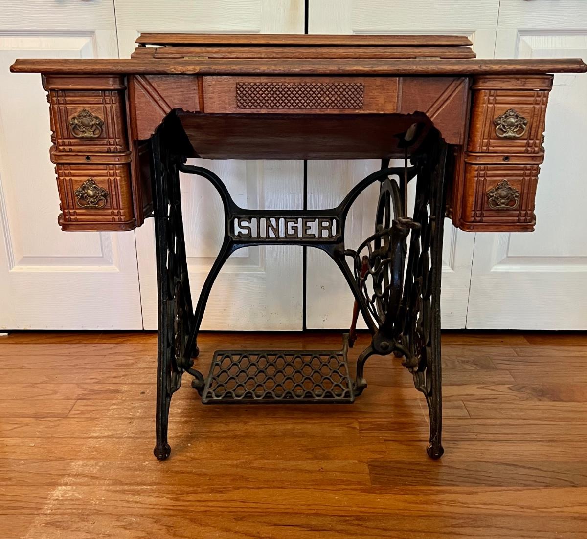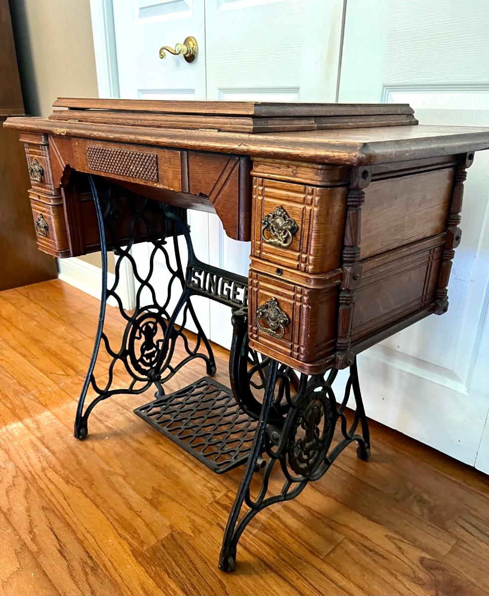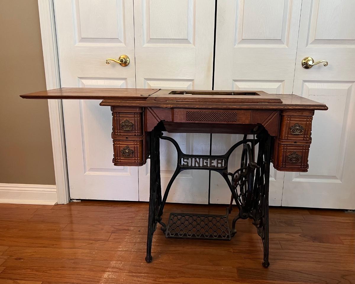 ANTIQUE SINGER SEWING MACHINE. Beautifully detailed. Measures 31 inches tall, 36 inches long and 18 inches deep. 50 inches wide when opened. Not tested.